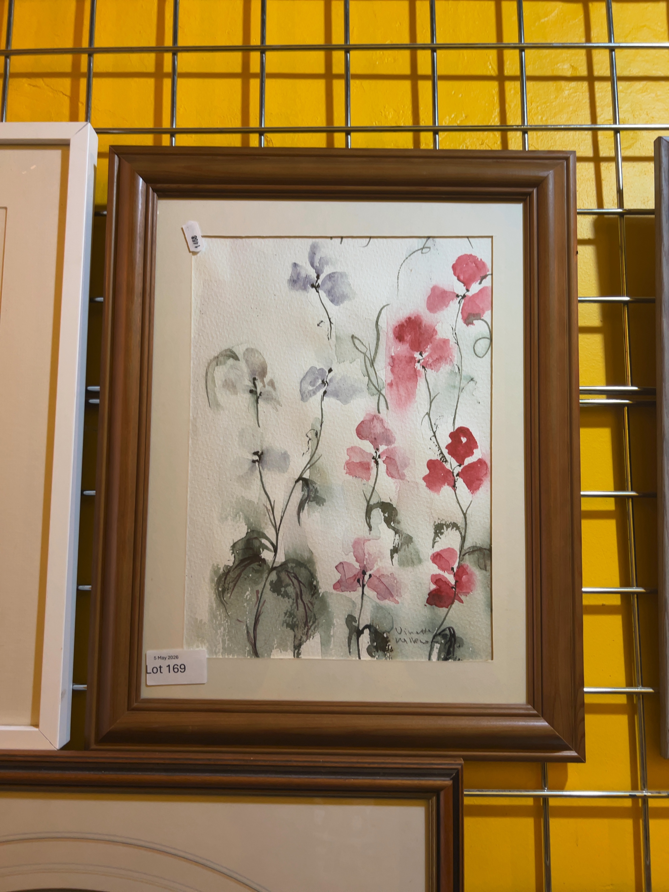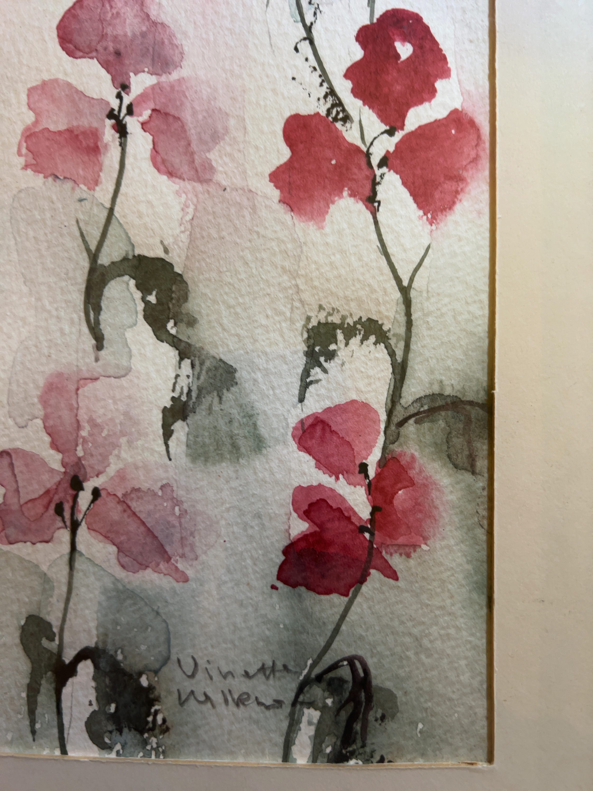 Vinette Millers. A botanical study of sweet peas, executed in watercolour on heavy-weight textured paper and signed by the artist in the lower right corner, reading Vinette Millers.