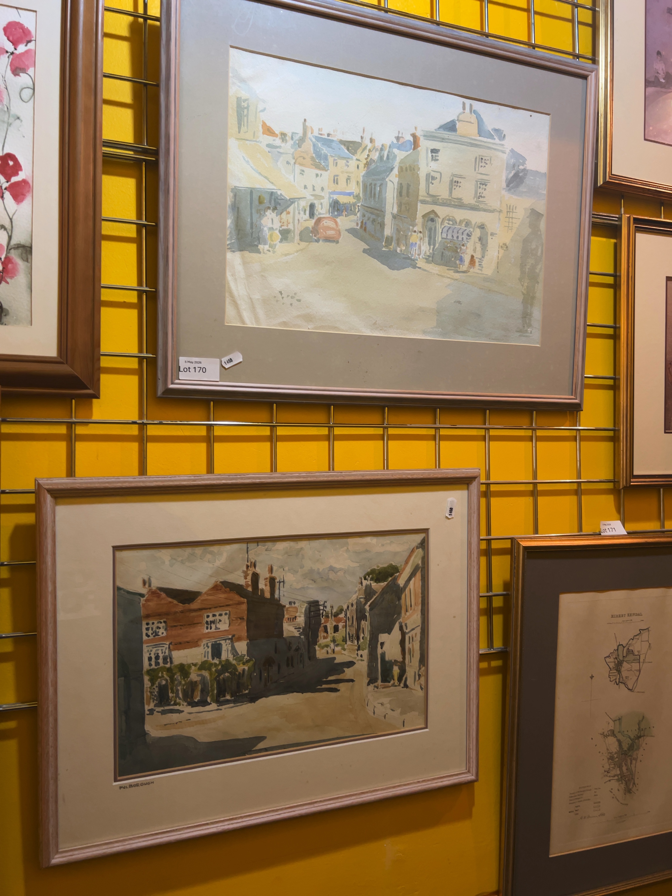 A pair of mid-20th-century watercolours on paper by Bridget Eaves. The first work, identified as Lot 170, depicts a town square with shopfronts and a prominent uniformed figure in the foreground, rendered with loose, atmospheric washes. The second work, identified as Lot 171, is inscribed PULBOROUGH in the lower-left corner and illustrates a village street featuring red brick buildings and telegraph poles. Both works are initialled B.E. in the lower-right corner.