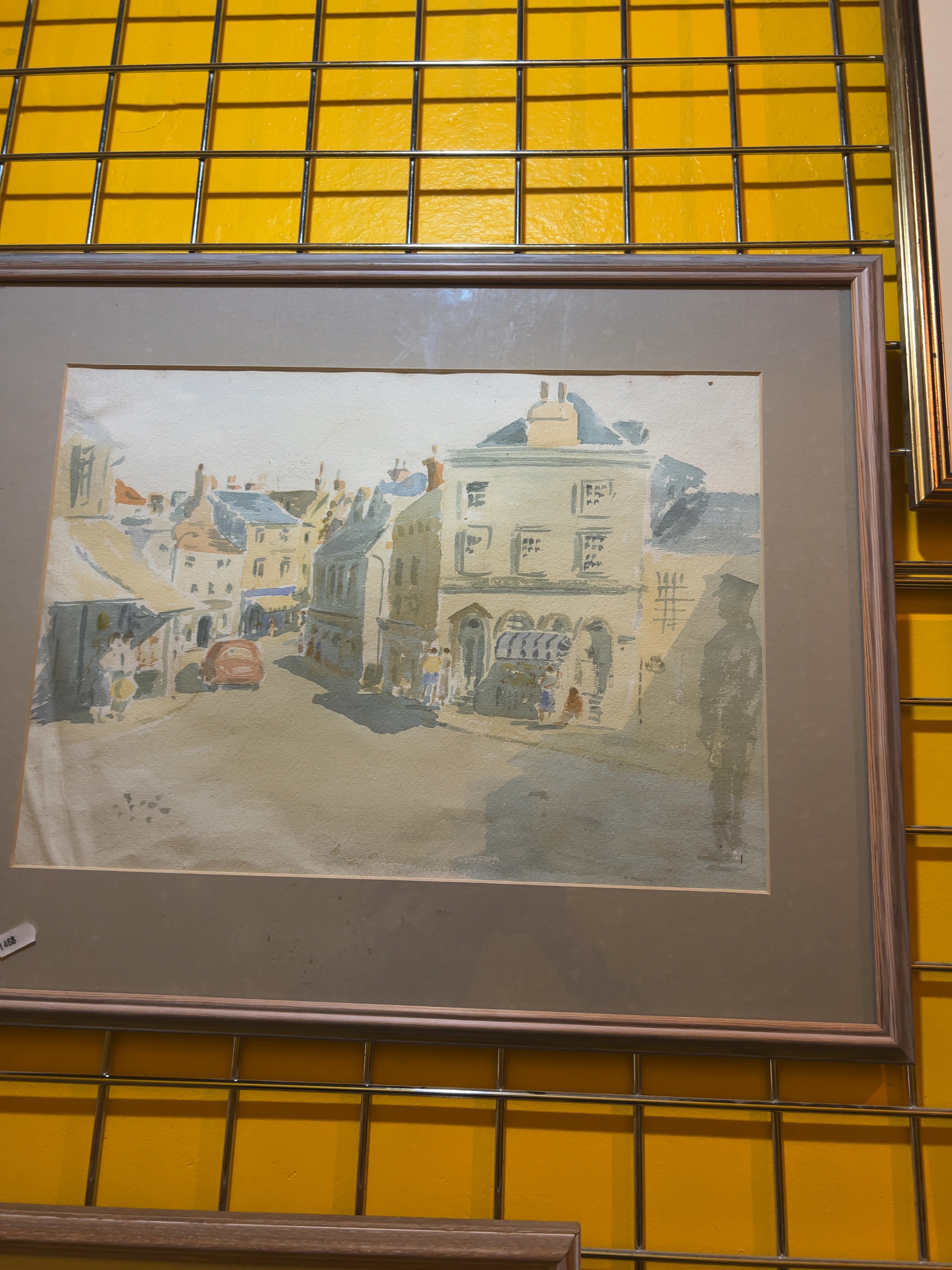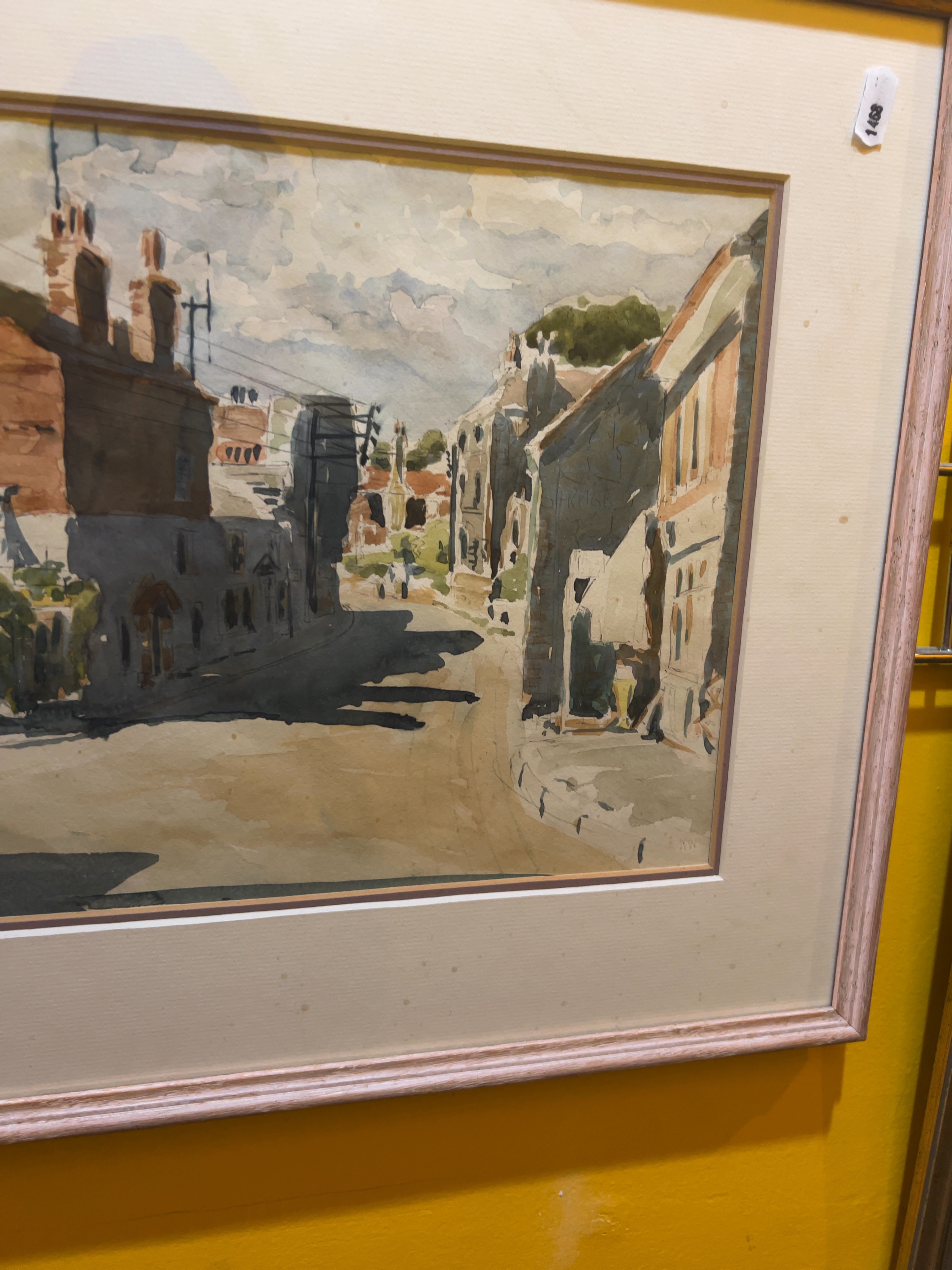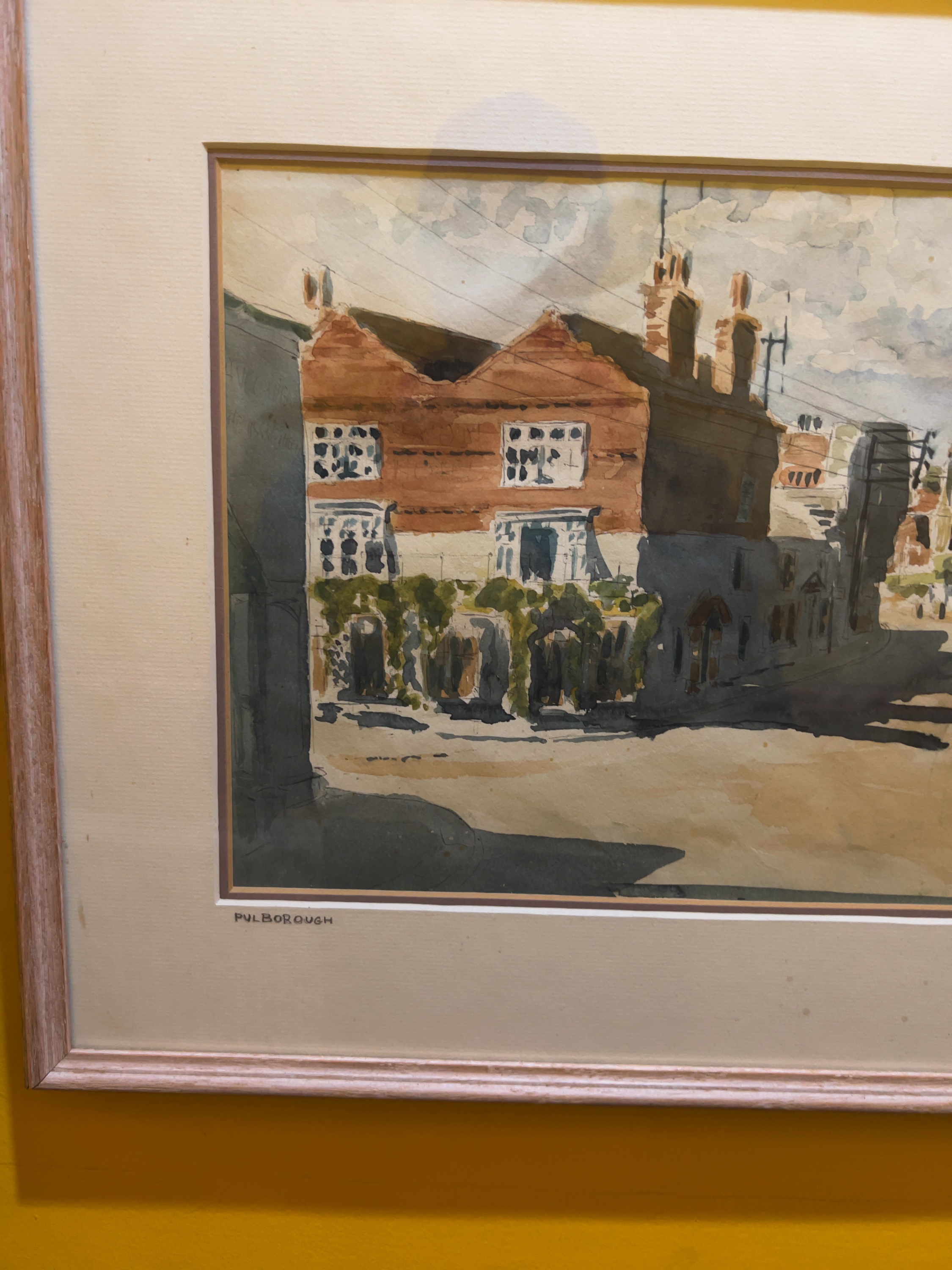 Both watercolours show visible toning to the paper consistent with age. There are several small foxing spots present on the mount of the Pulborough scene. The frames show light surface wear and minor scuffing to the edges. The works appear to be in good overall condition with no significant fading or damage to the paper.