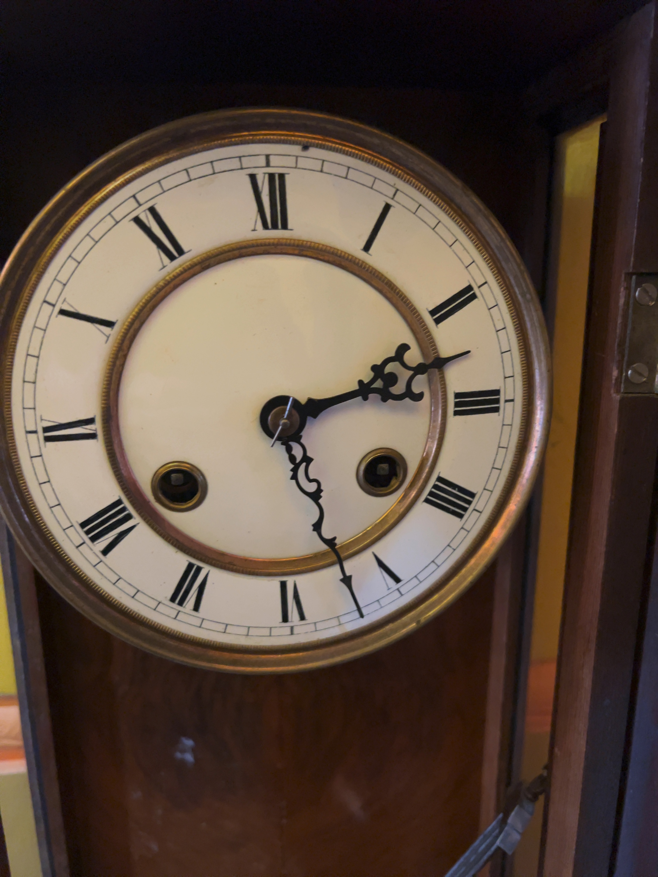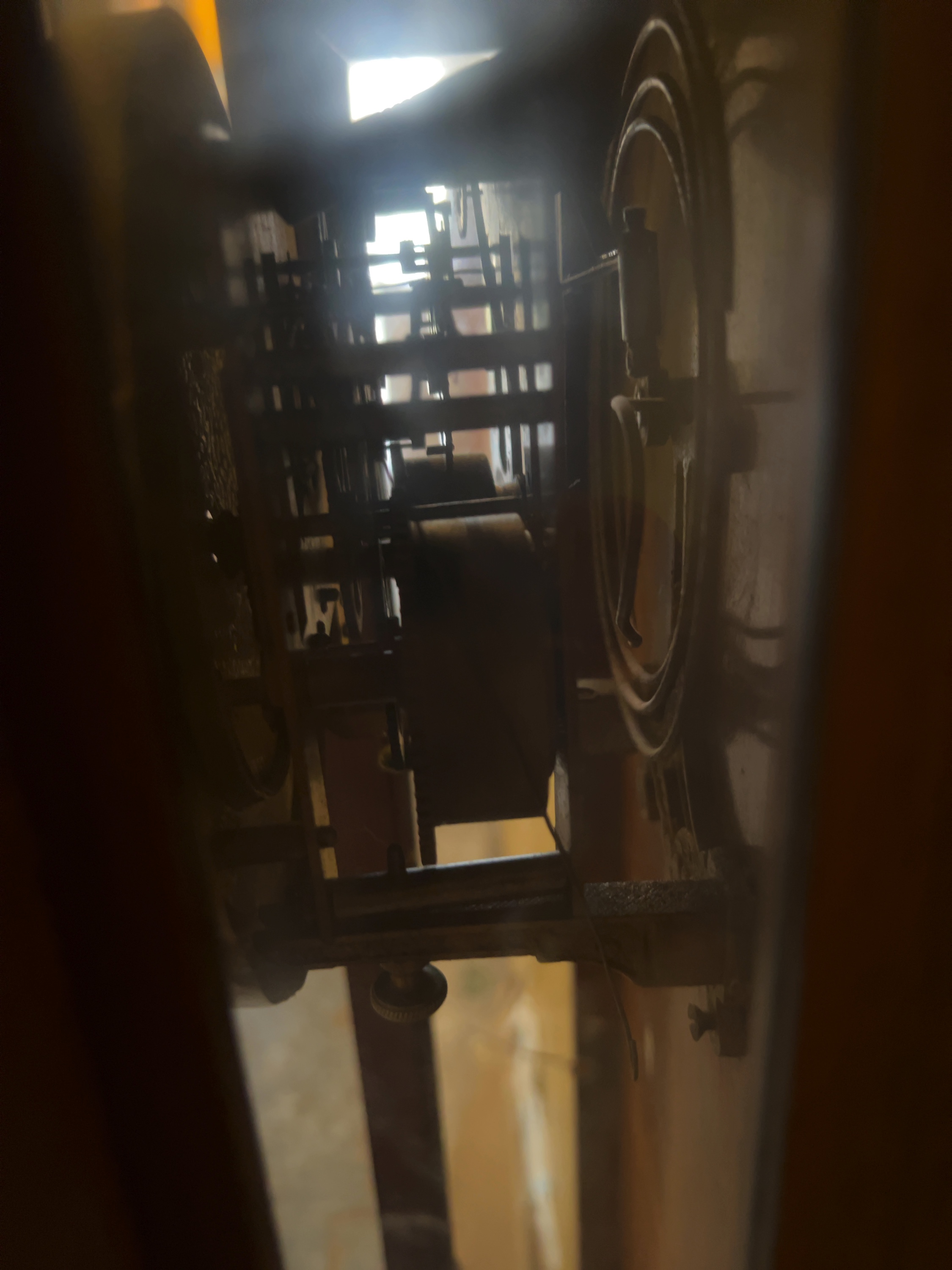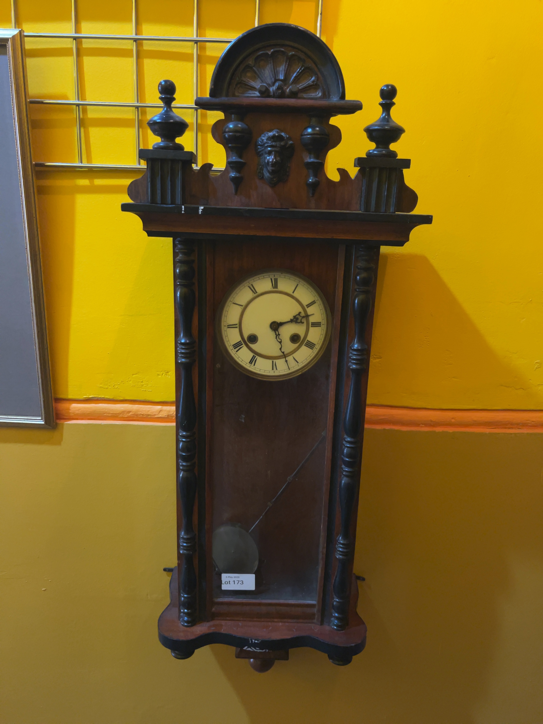 The case displays minor surface scratches and wear consistent with age. There is some dust accumulation to the interior. The dial appears free from significant damage or cracks. The movement is mechanical and has not been tested for timekeeping or striking functionality. Includes pendulum; winding key is missing.
