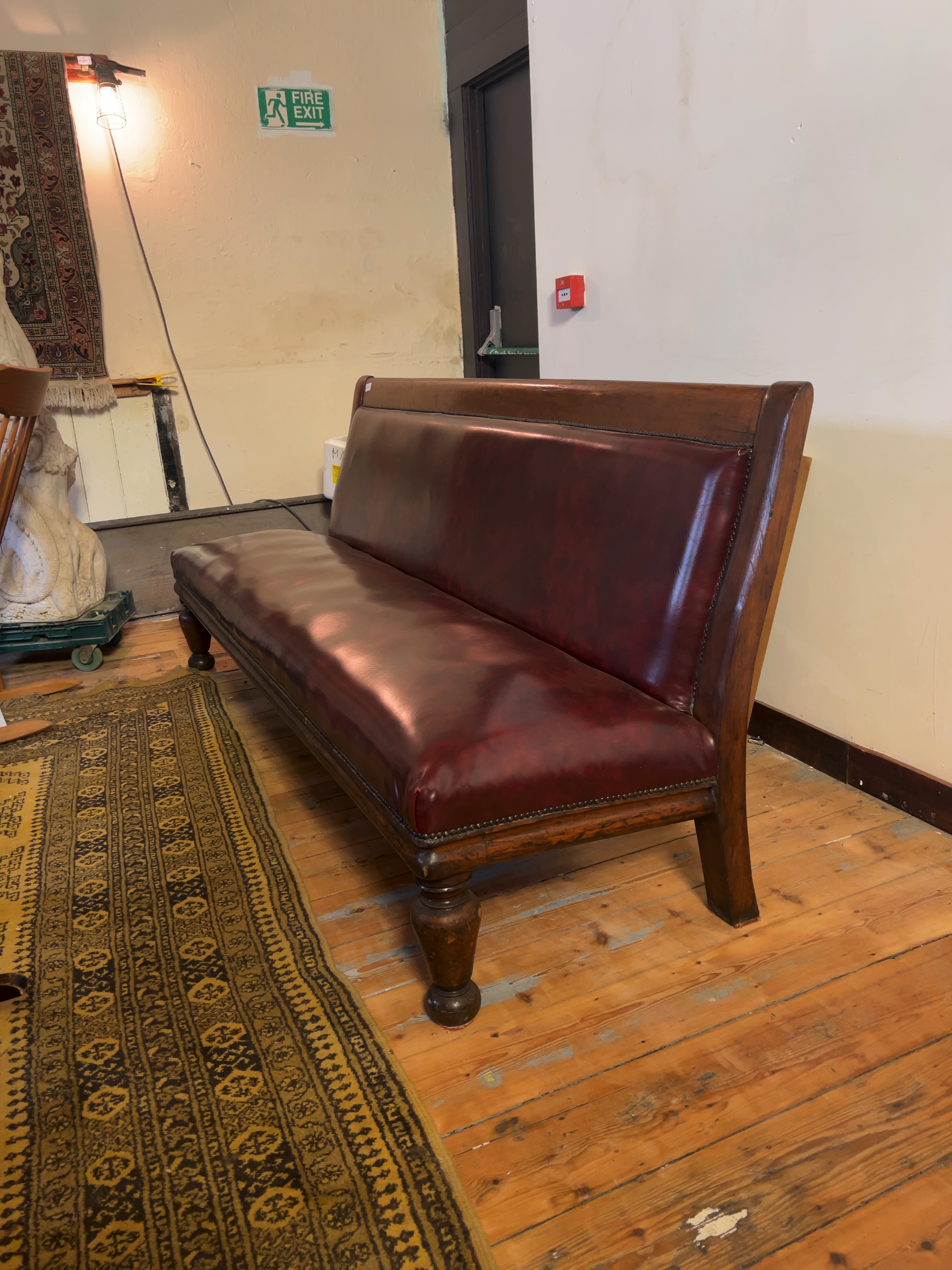 A Victorian style hall bench or settee, constructed from dark-stained hardwood. No maker’s marks or labels were identified. A small white lot tag is visible on the top corner of the backrest.