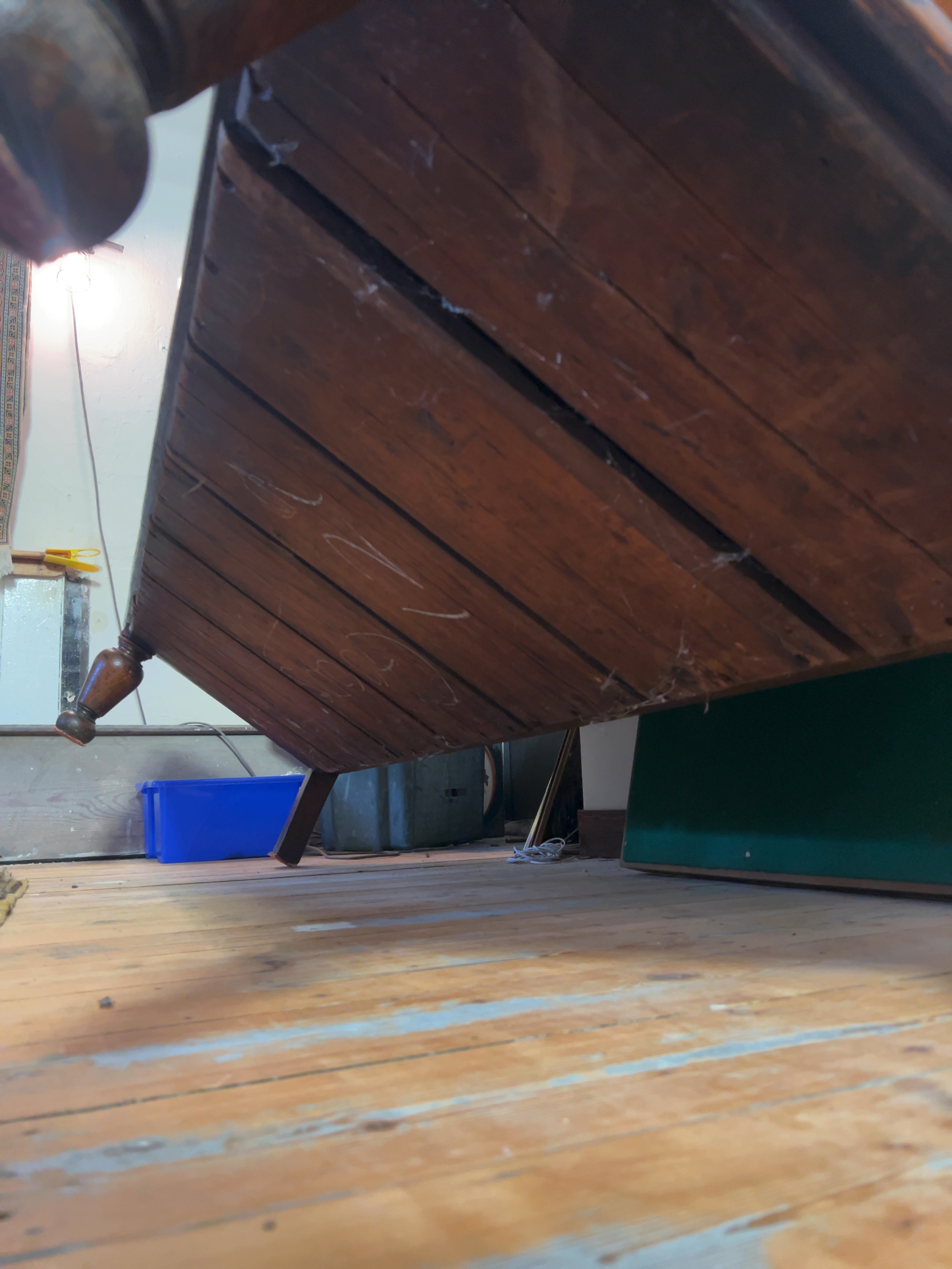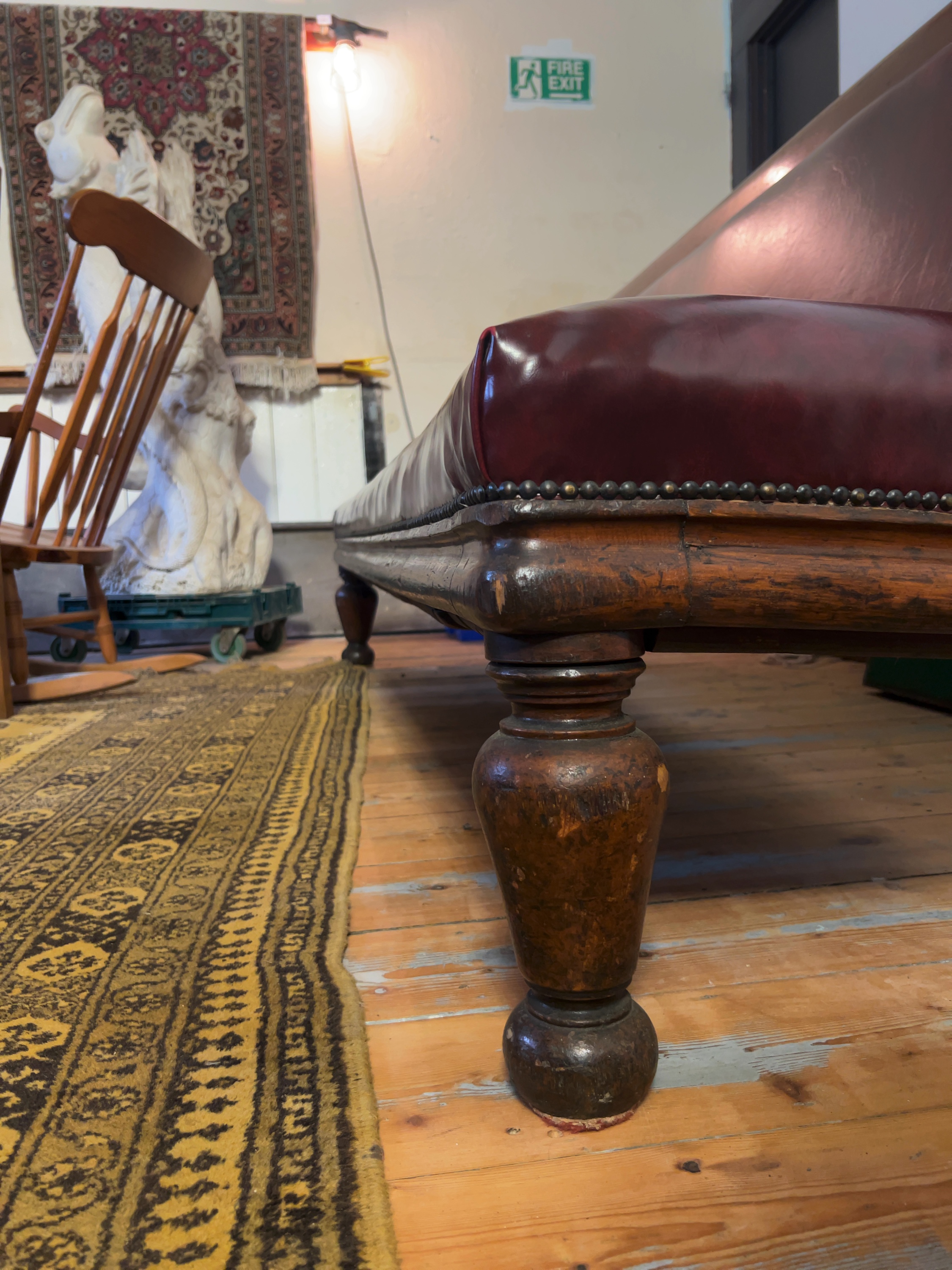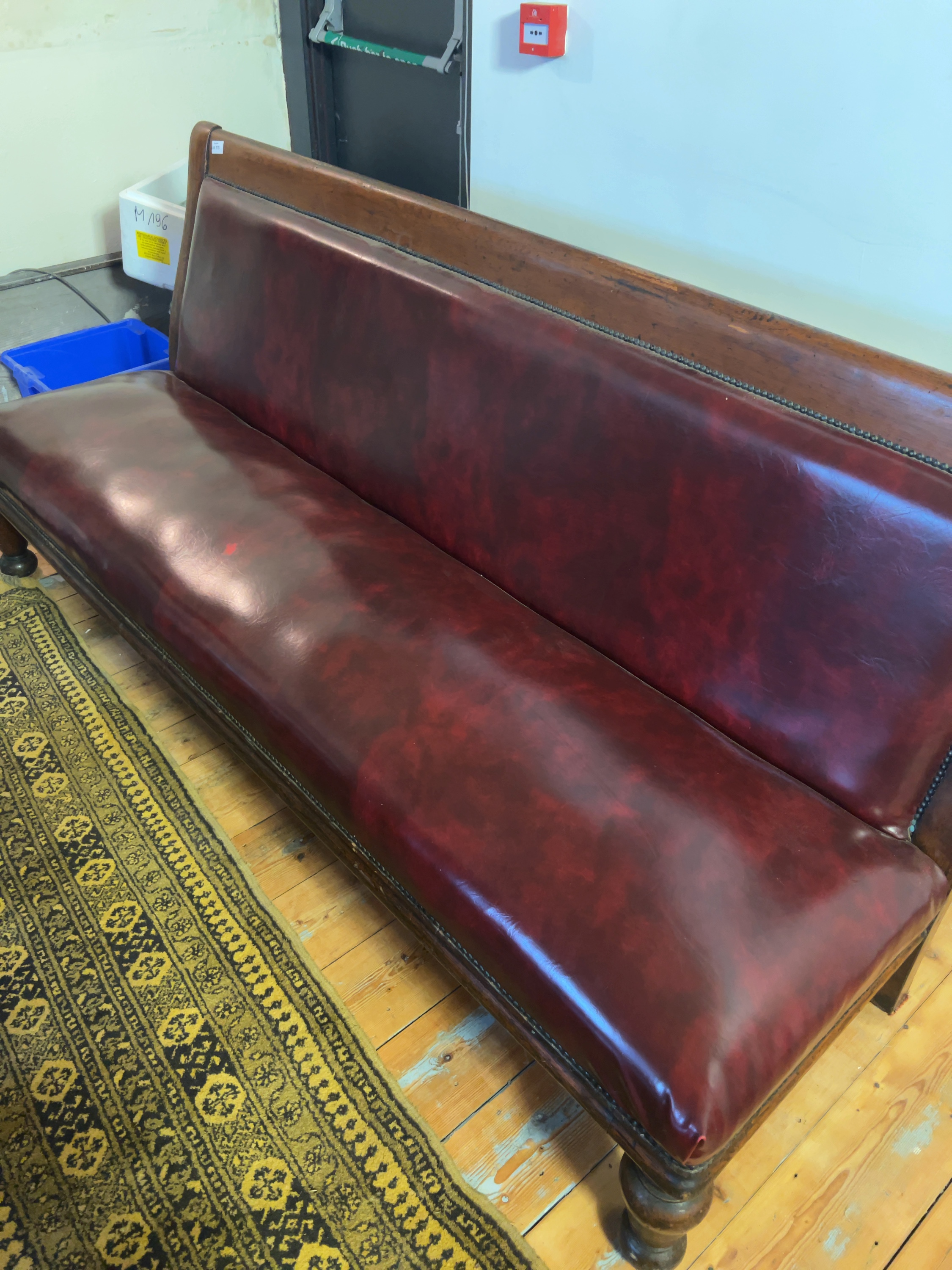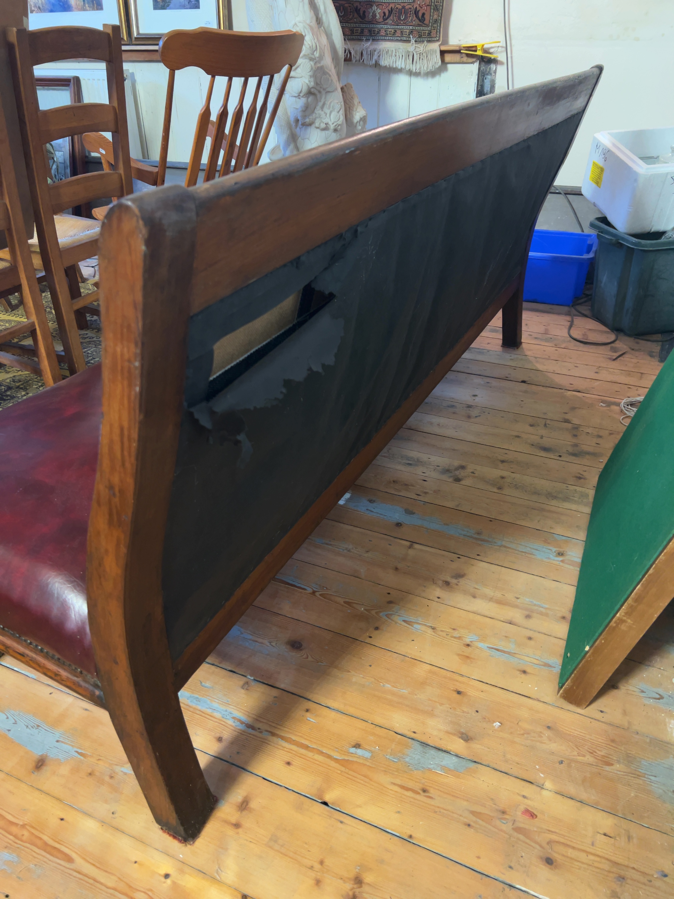 The item is in a condition consistent with age and previous use. The wood frame exhibits various scuffs, surface scratches, and small indentations, particularly to the legs and along the base rails. The upholstery shows typical signs of age, including mottled fading and light surface marks. The black fabric dust cover on the reverse of the backrest is torn and requires replacement or repair.