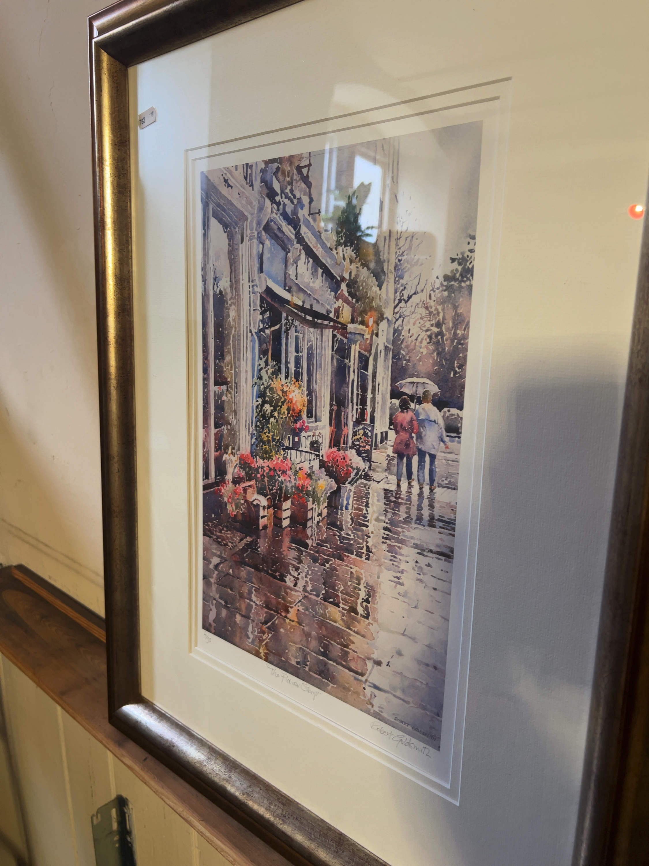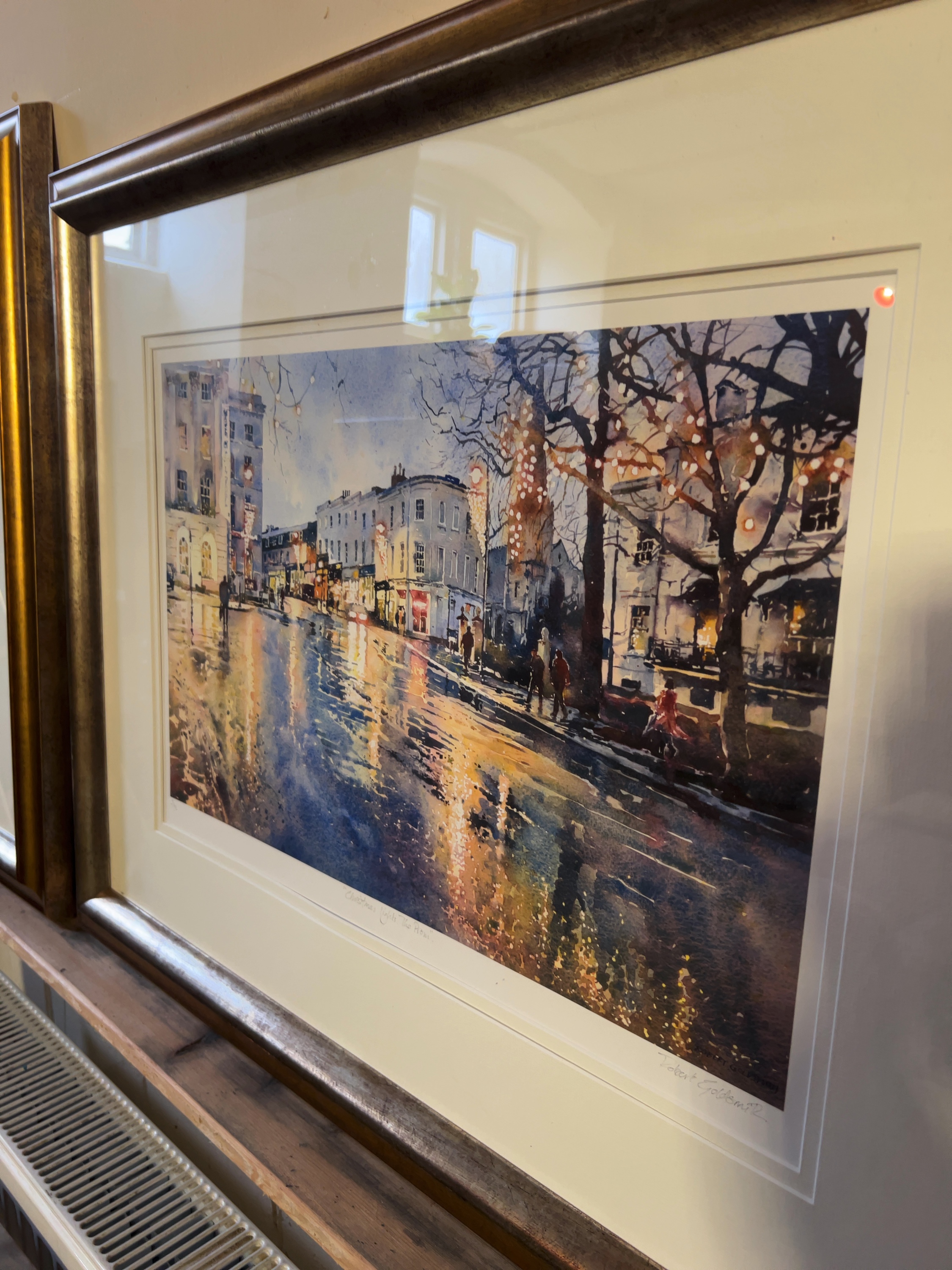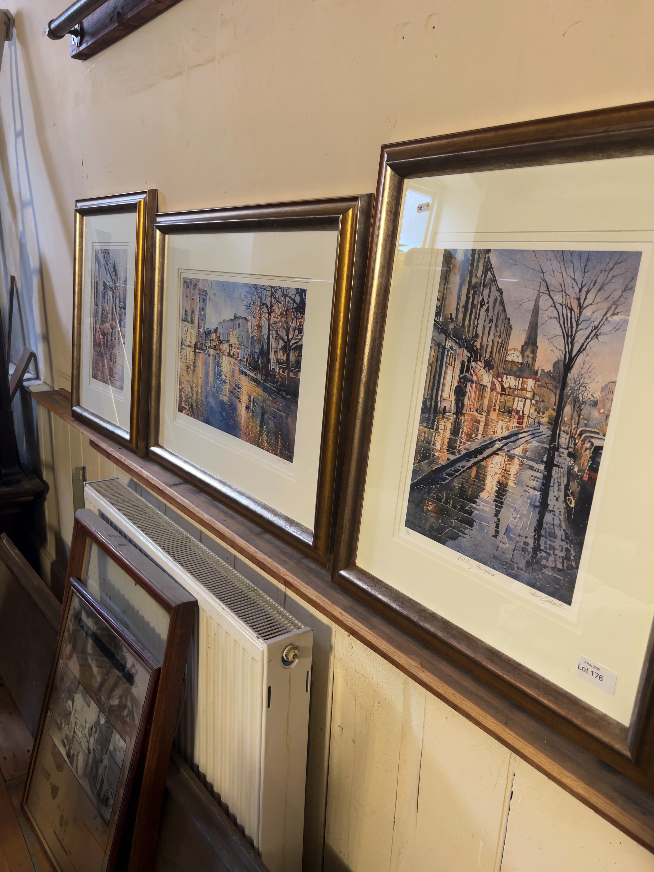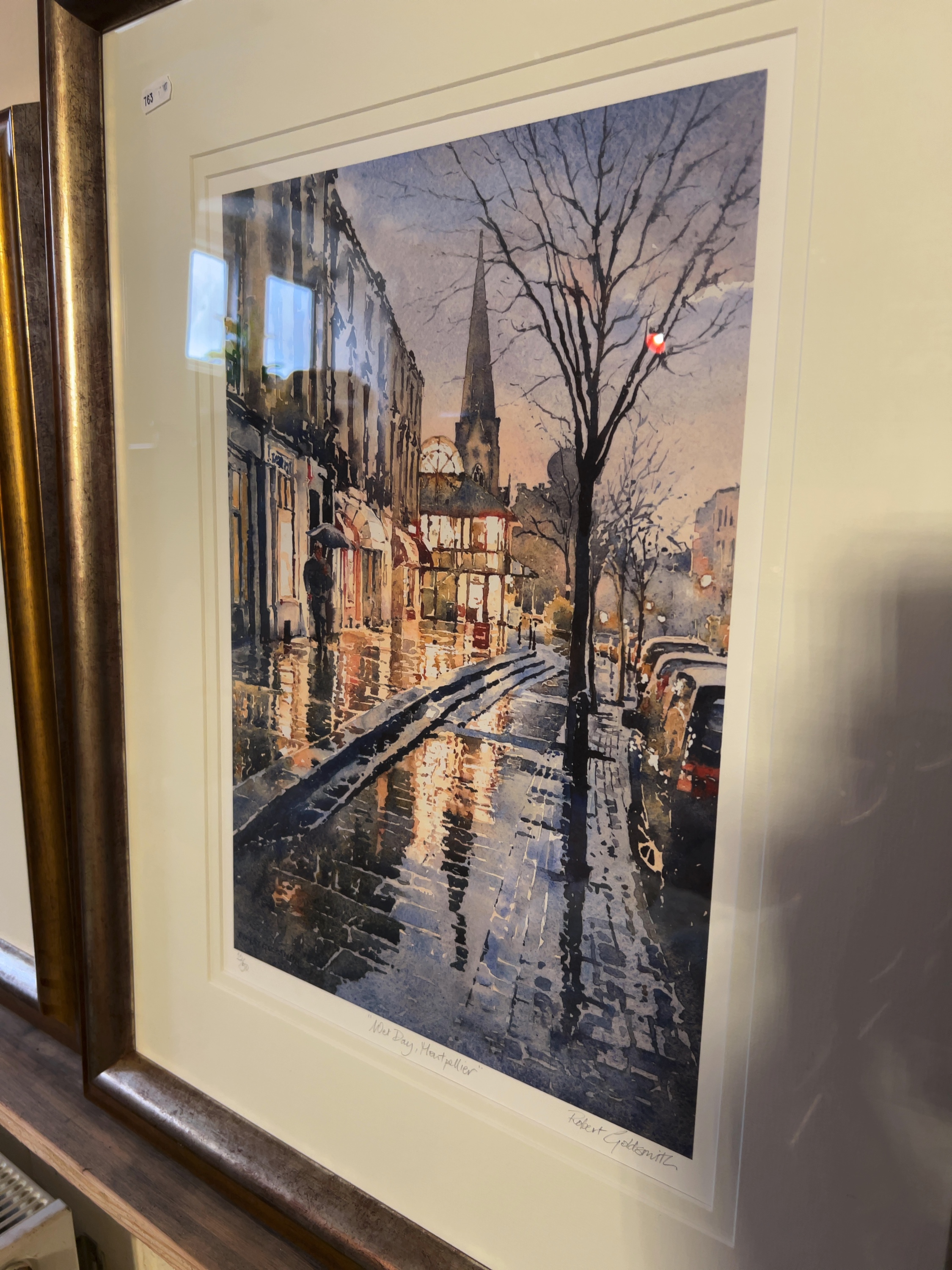 A trio of limited edition prints after original watercolours by the contemporary artist Robert Goldsmith, depicting atmospheric street scenes in Cheltenham. The prints are pencil-signed Robert Goldsmith to the lower right, titled in the lower centre, and numbered to the lower left, with edition numbers including 42/350 and 43/500.