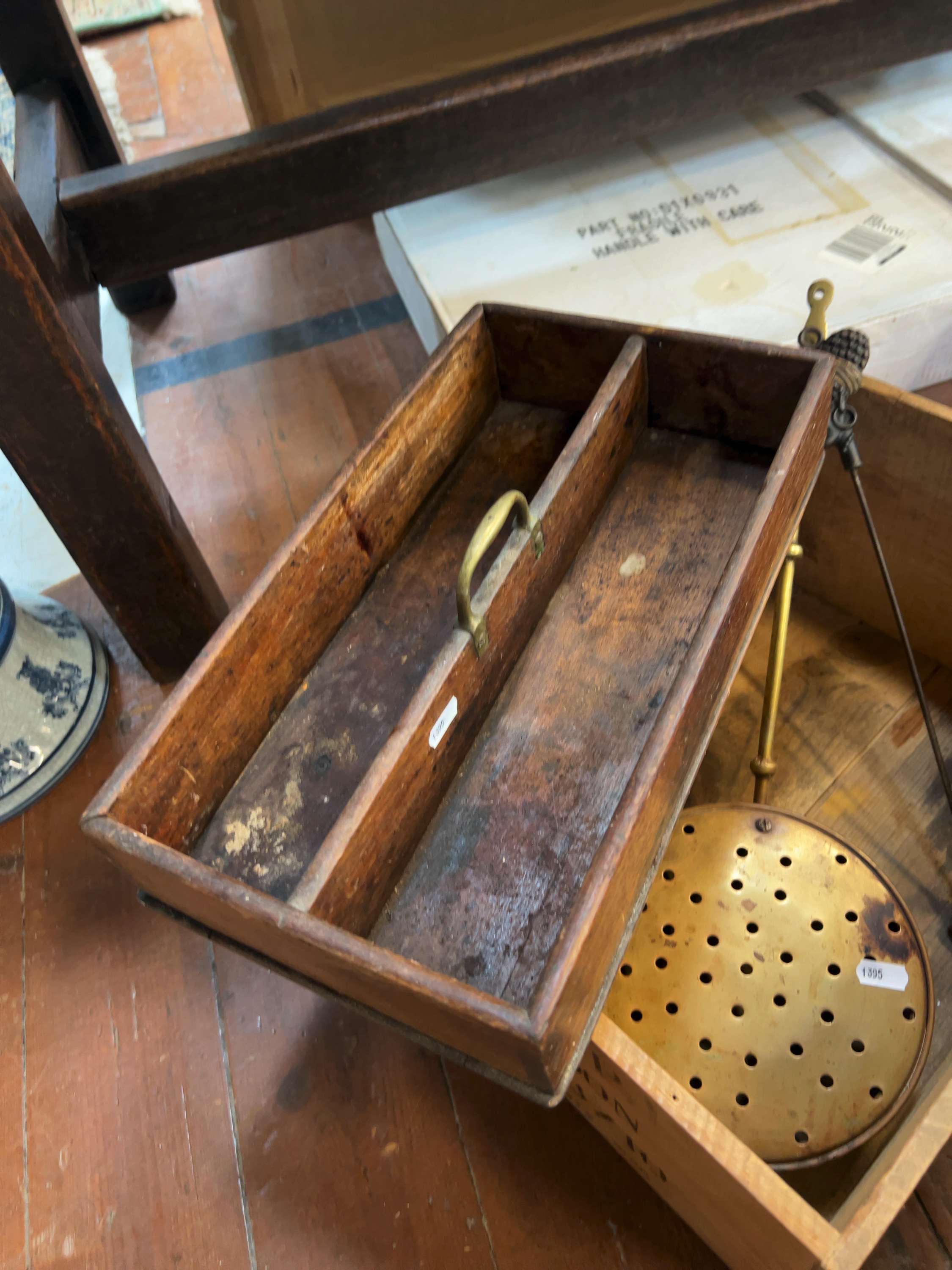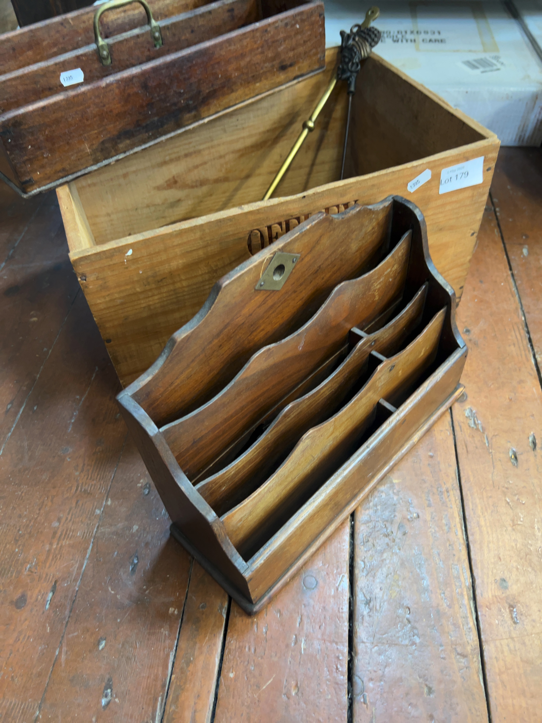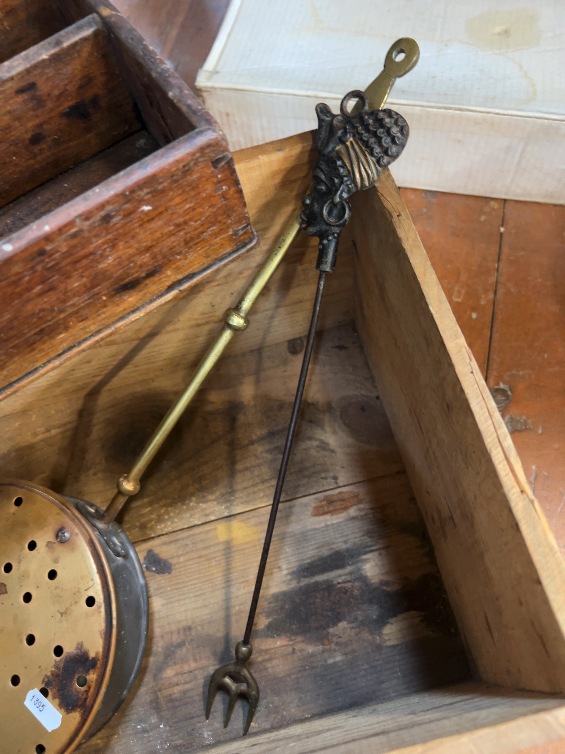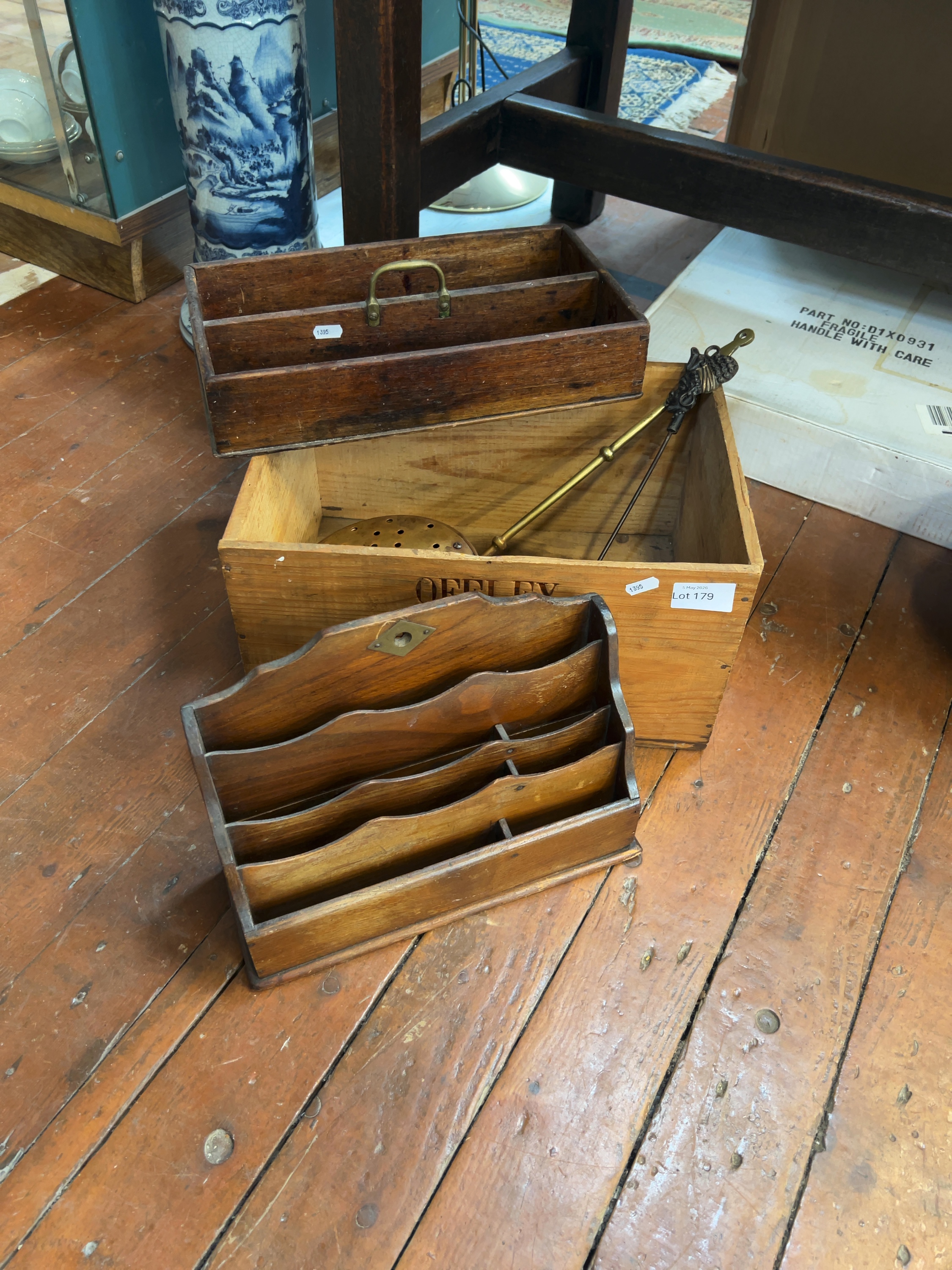 A group of assorted domestic and utilitarian items comprising wooden storage pieces and decorative metalware. The lot includes a three-tiered stationery rack in the Victorian style, a twin-compartment wooden cutlery carrier with a central divider, and large rectangular pine packing crate is stencilled with the name OFFLEY in black serif lettering, associated with the Portuguese port wine producer. The metalware consists of a brass bed warmer and a toasting fork.