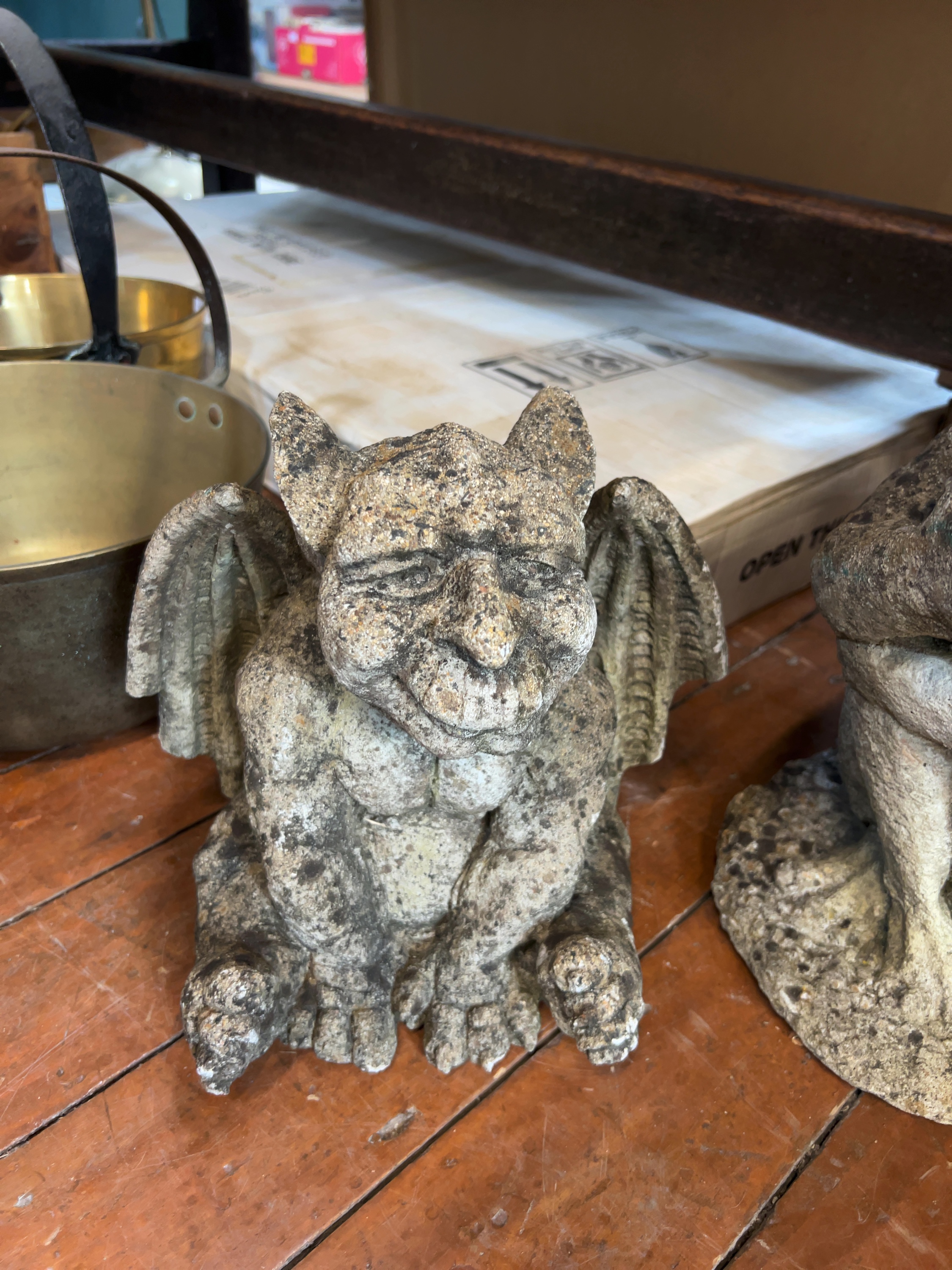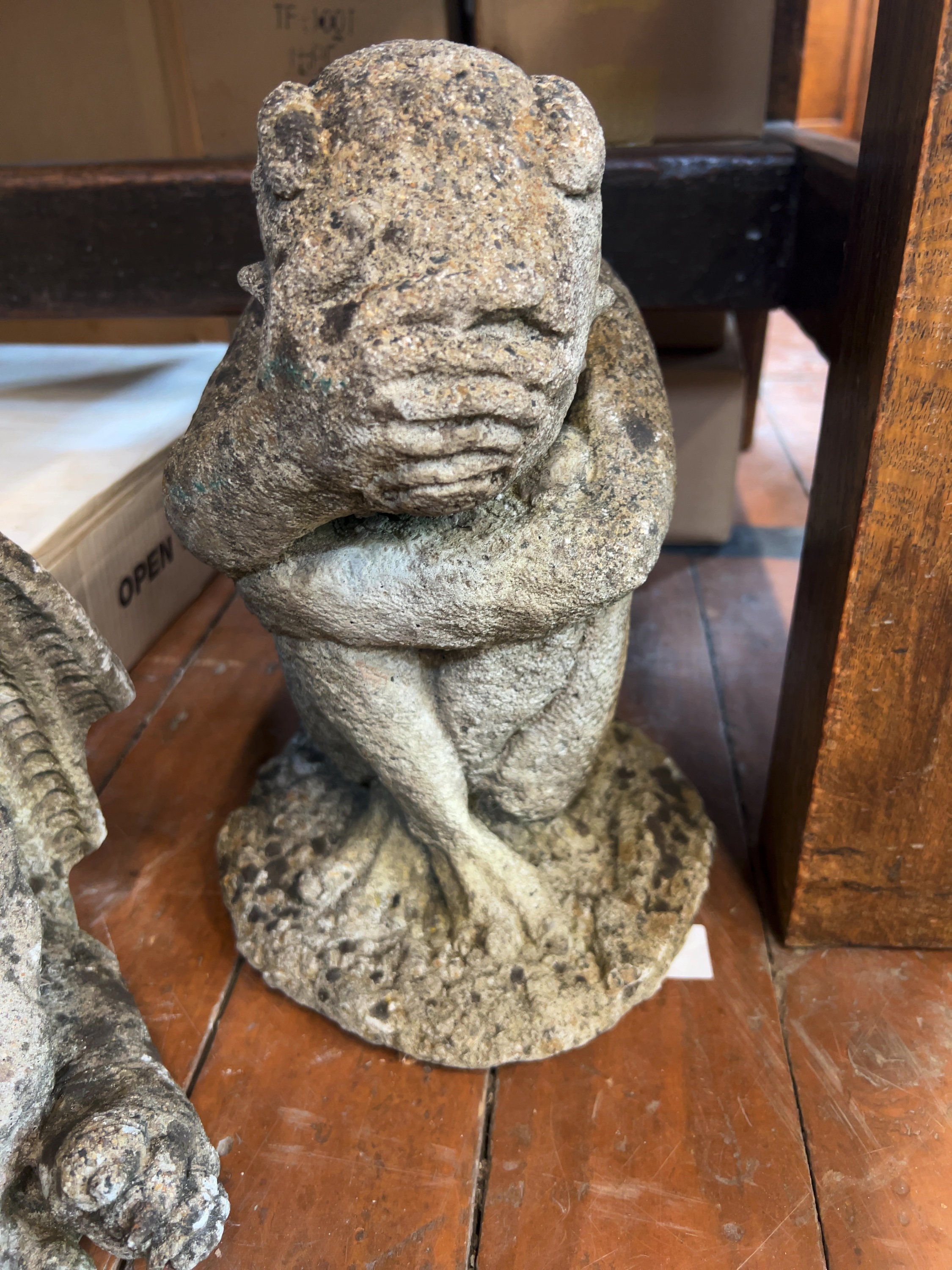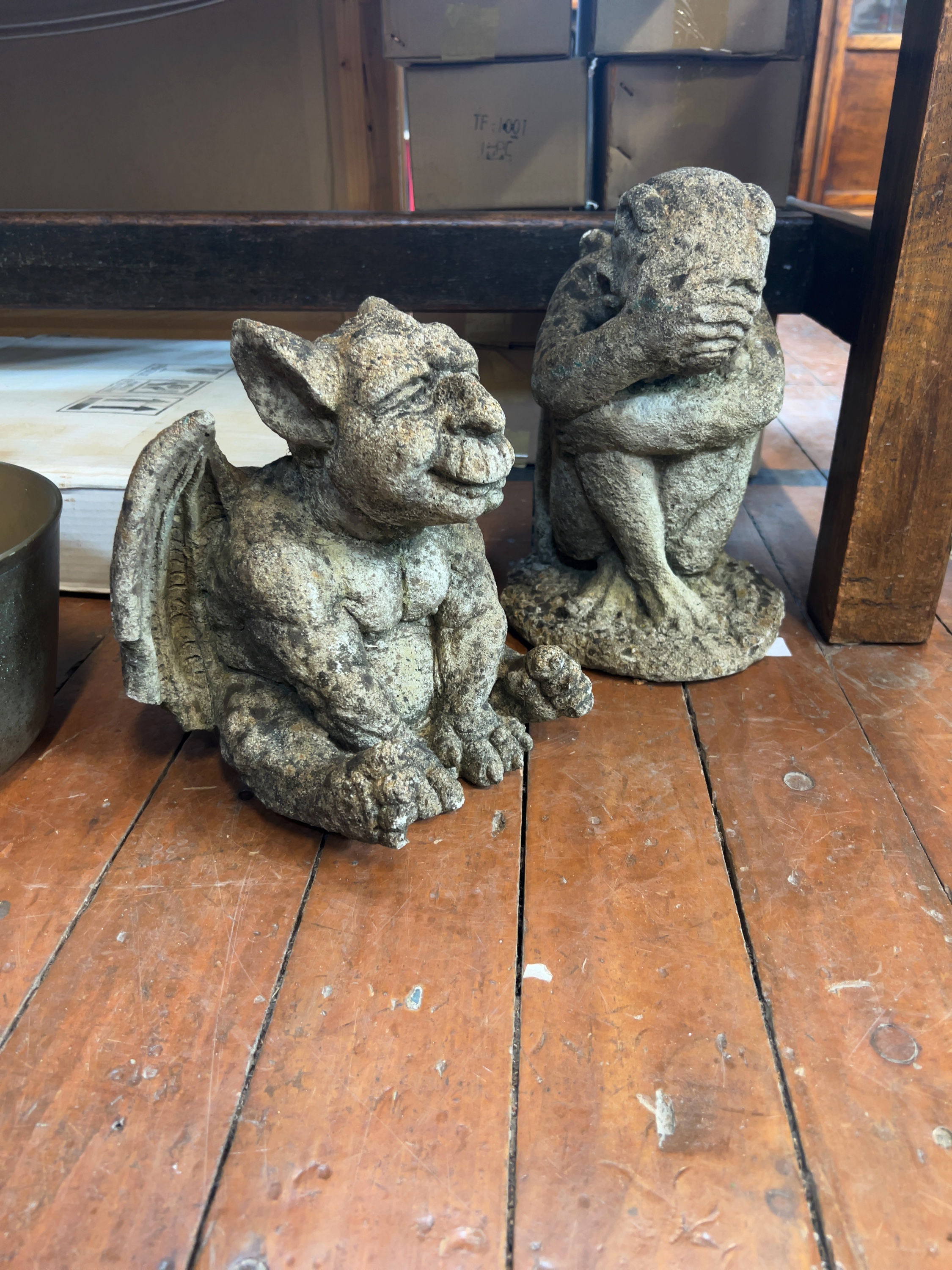 A pair of weathered garden figures of grotesque form, constructed from composite material. No maker’s marks, model numbers, or signatures are visible on either piece.