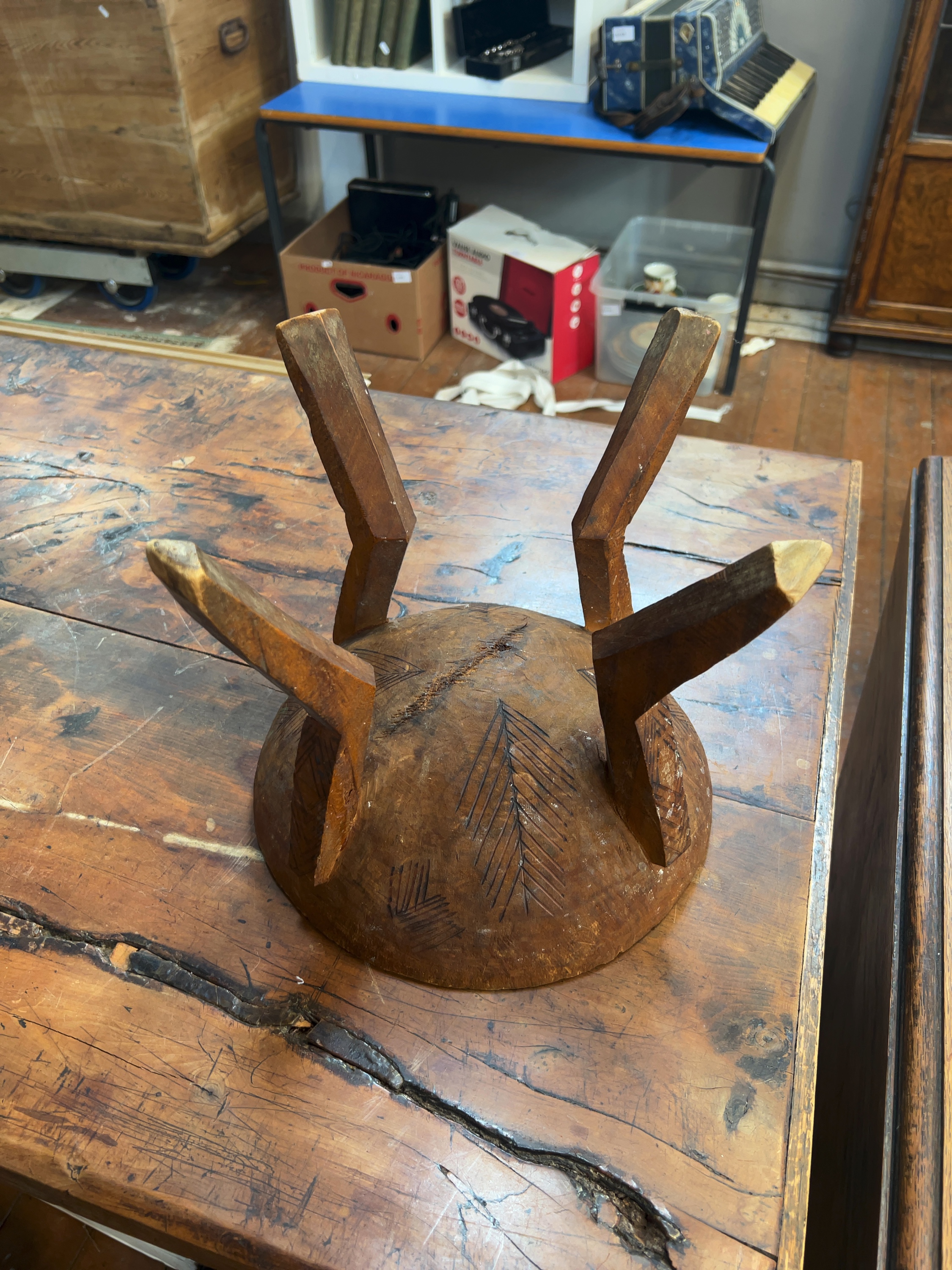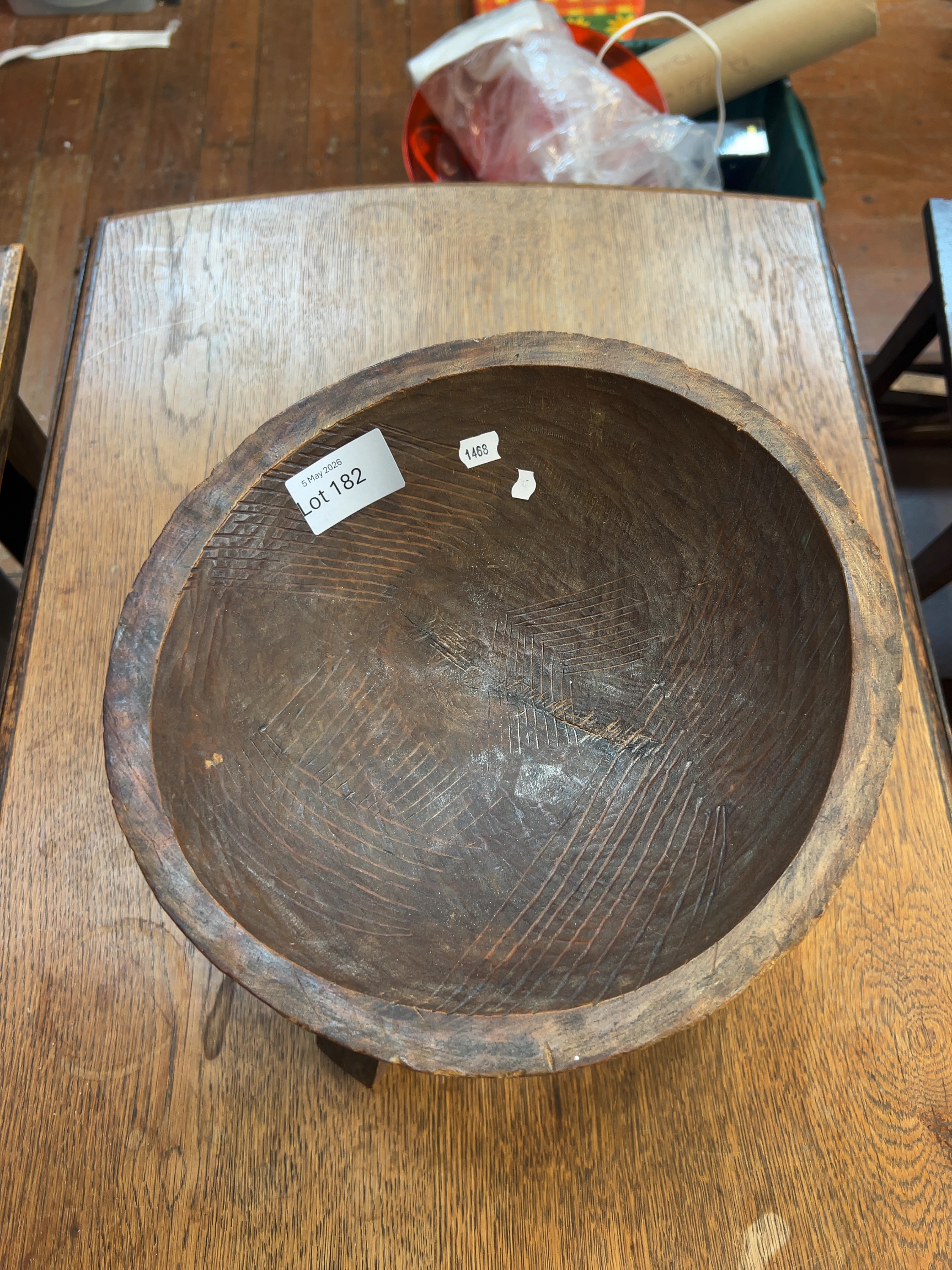 The piece is in good ethnographic condition, showing signs of age and traditional use. There are visible stable shrinkage cracks, also known as checking, to the body and base, which are typical for older hand-carved hardwood objects. The rim shows minor nicks and surface wear consistent with its utilitarian history.
