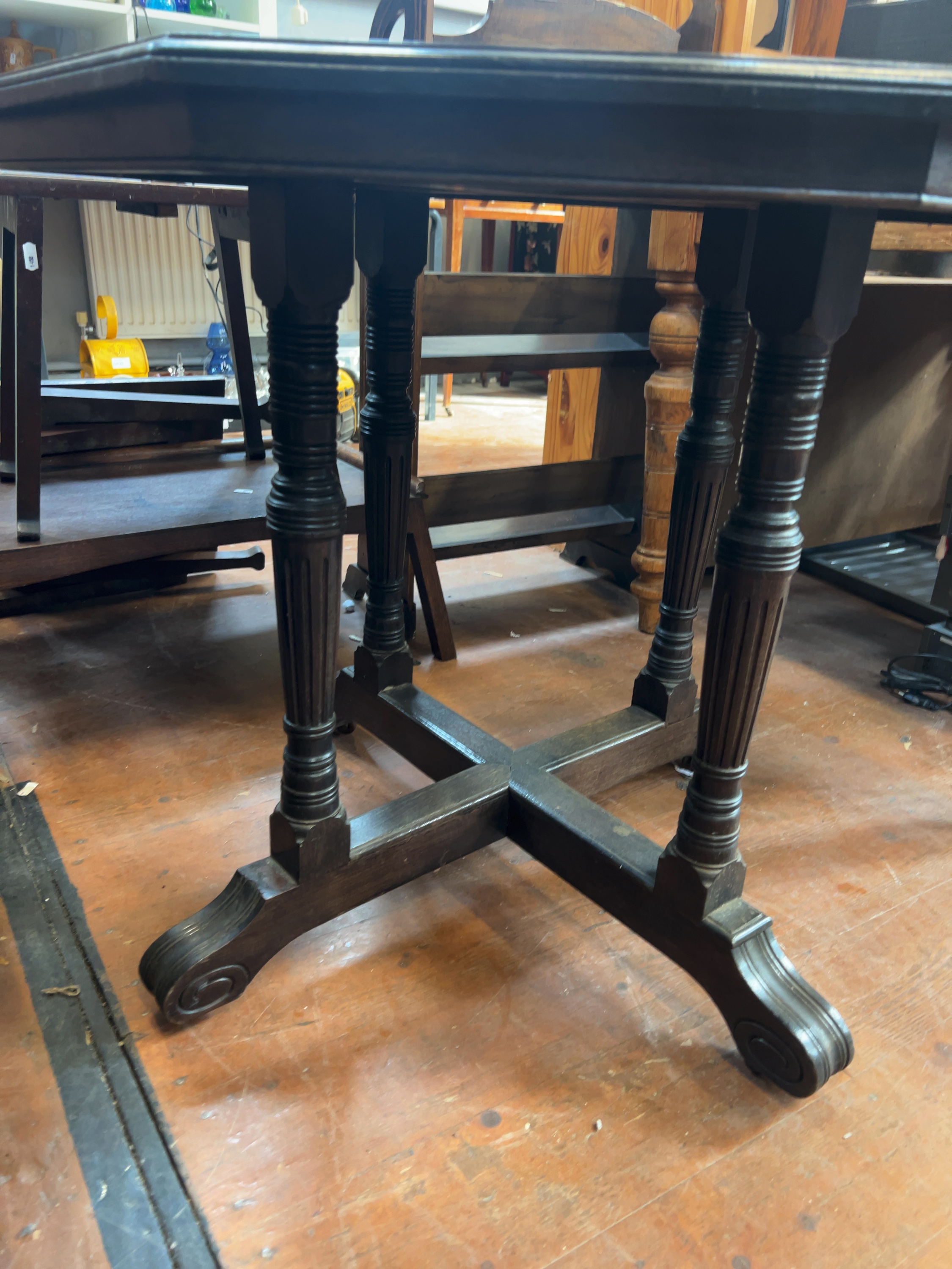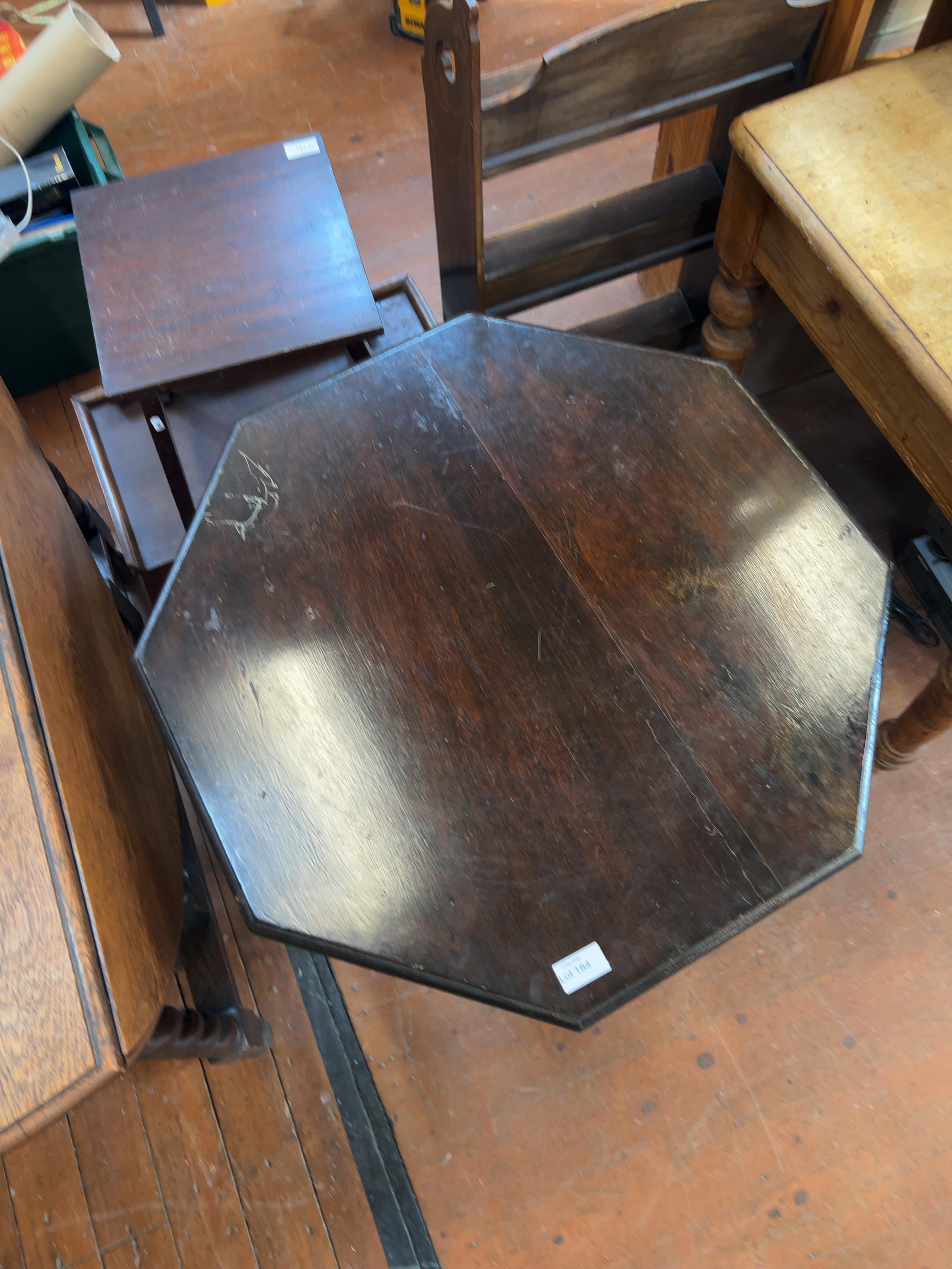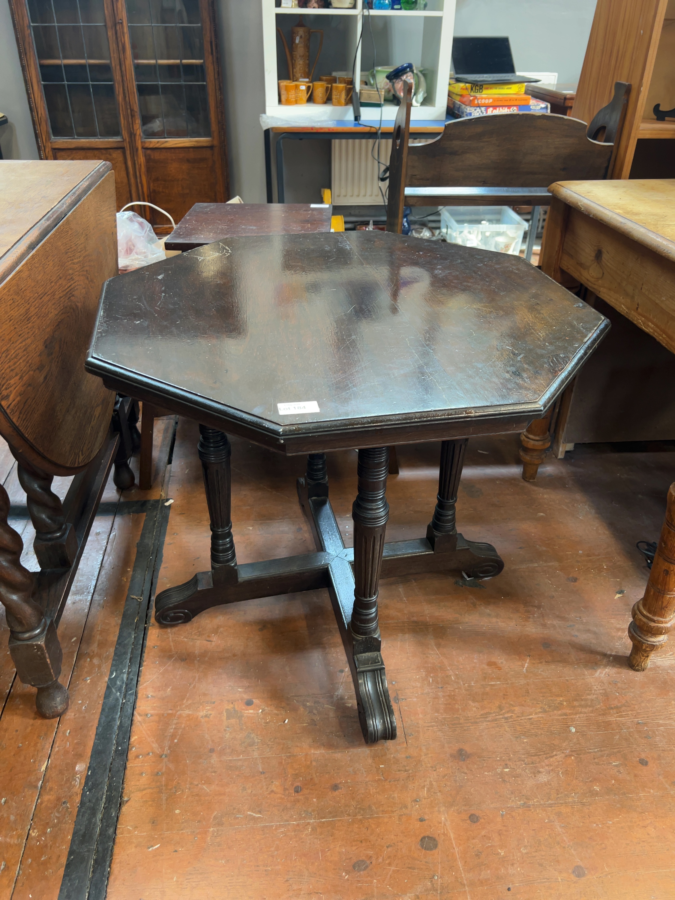 This octagonal centre table is crafted in the Jacobean Revival style from a dark-stained wood, likely oak.