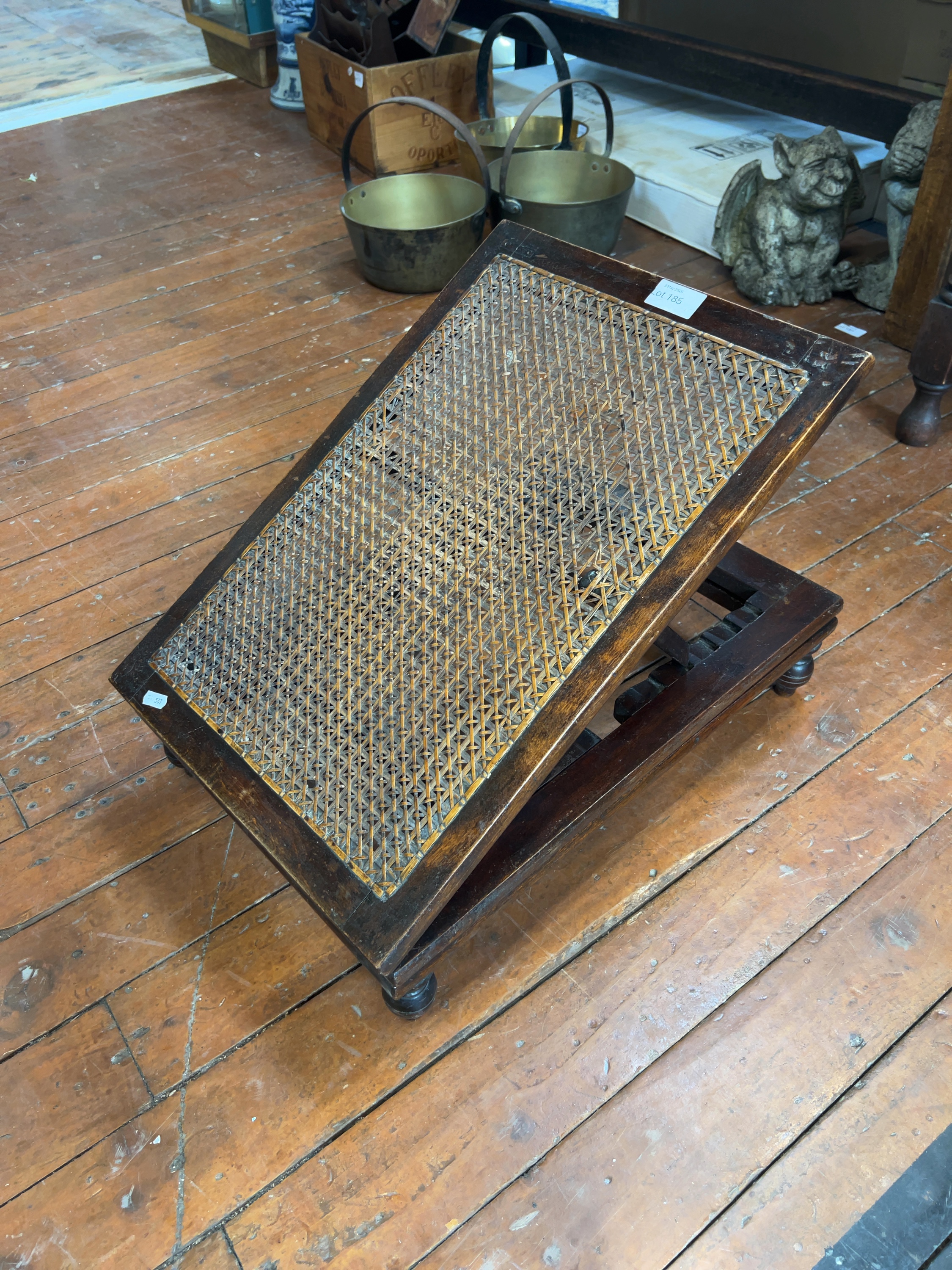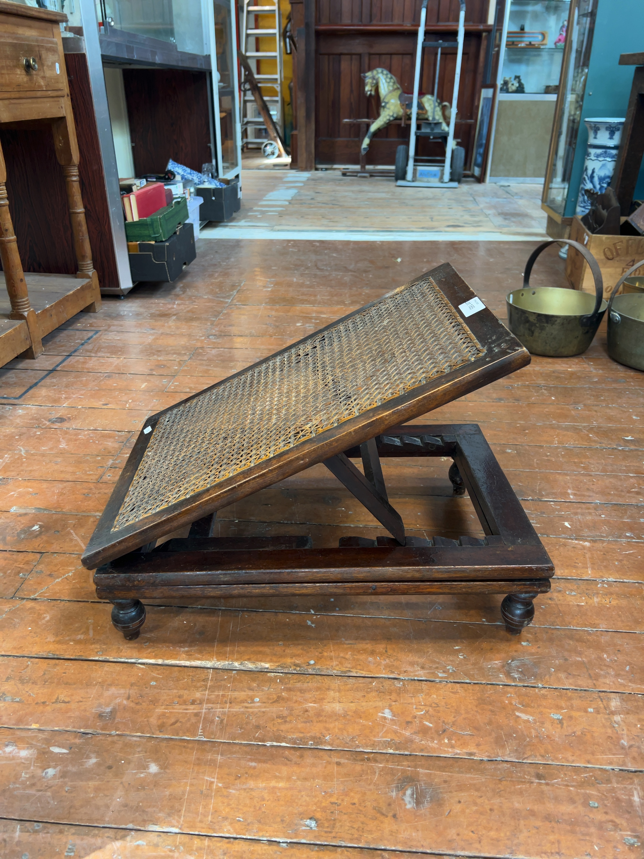 An adjustable Victorian metamorphic gout stool or backrest, constructed from mahogany with a dark stained finish. While visually similar to pieces produced by specialist manufacturers such as J. Carter or Hooper of London, no maker’s mark is present on this example.