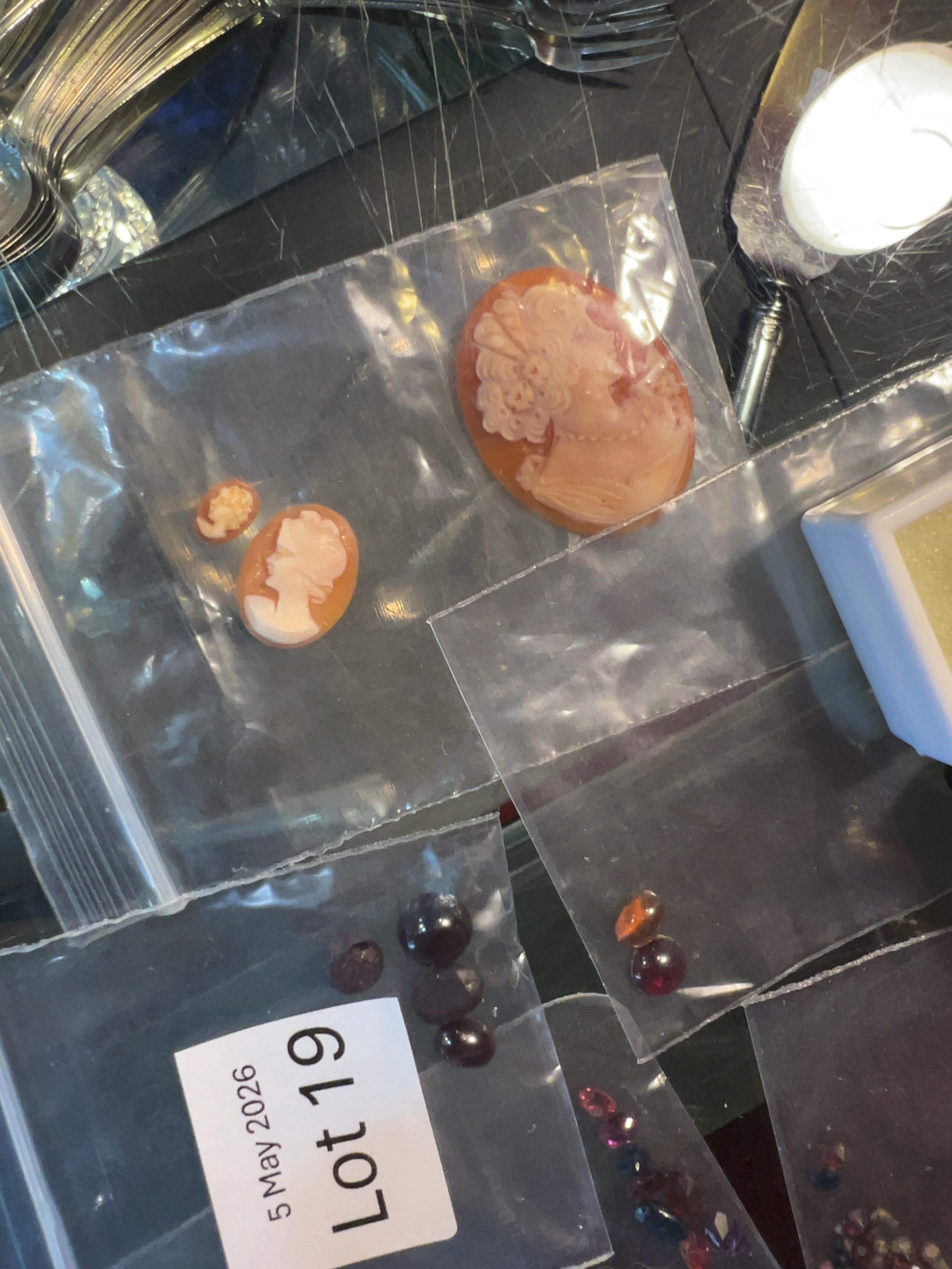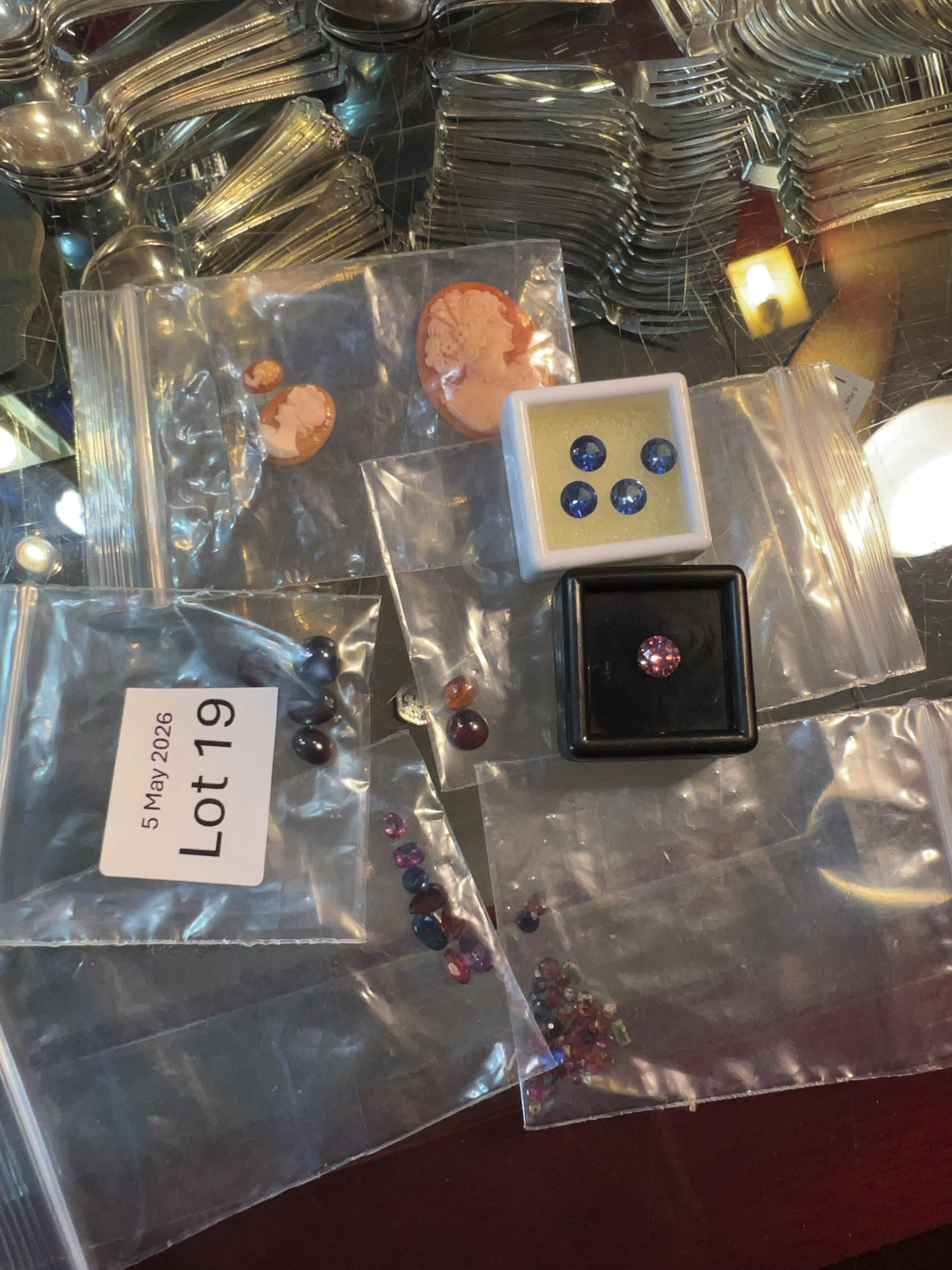 This lot comprises an assortment of loose gems and unmounted cameos presented in display cases and individual packets. The collection includes four round brilliant-cut stones of a vibrant mid-blue hue, appearing to be sapphires, housed within a white plastic display case. A separate black display case contains a single round brilliant-cut stone of an intense pinkish-red hue, appearing to be a ruby, spinel, or pink sapphire. The lot further contains multiple packets of mixed faceted and cabochon stones in various shades including deep red, purple, green, and blue, appearing to include garnets and other semi-precious species. Also included are three unmounted carved shell cameos of graduated sizes, each featuring a classic female profile in white relief against a brownish-orange ground. One packet includes a printed label identifying the items as part of Lot 19 for an auction dated 5 May 2026.