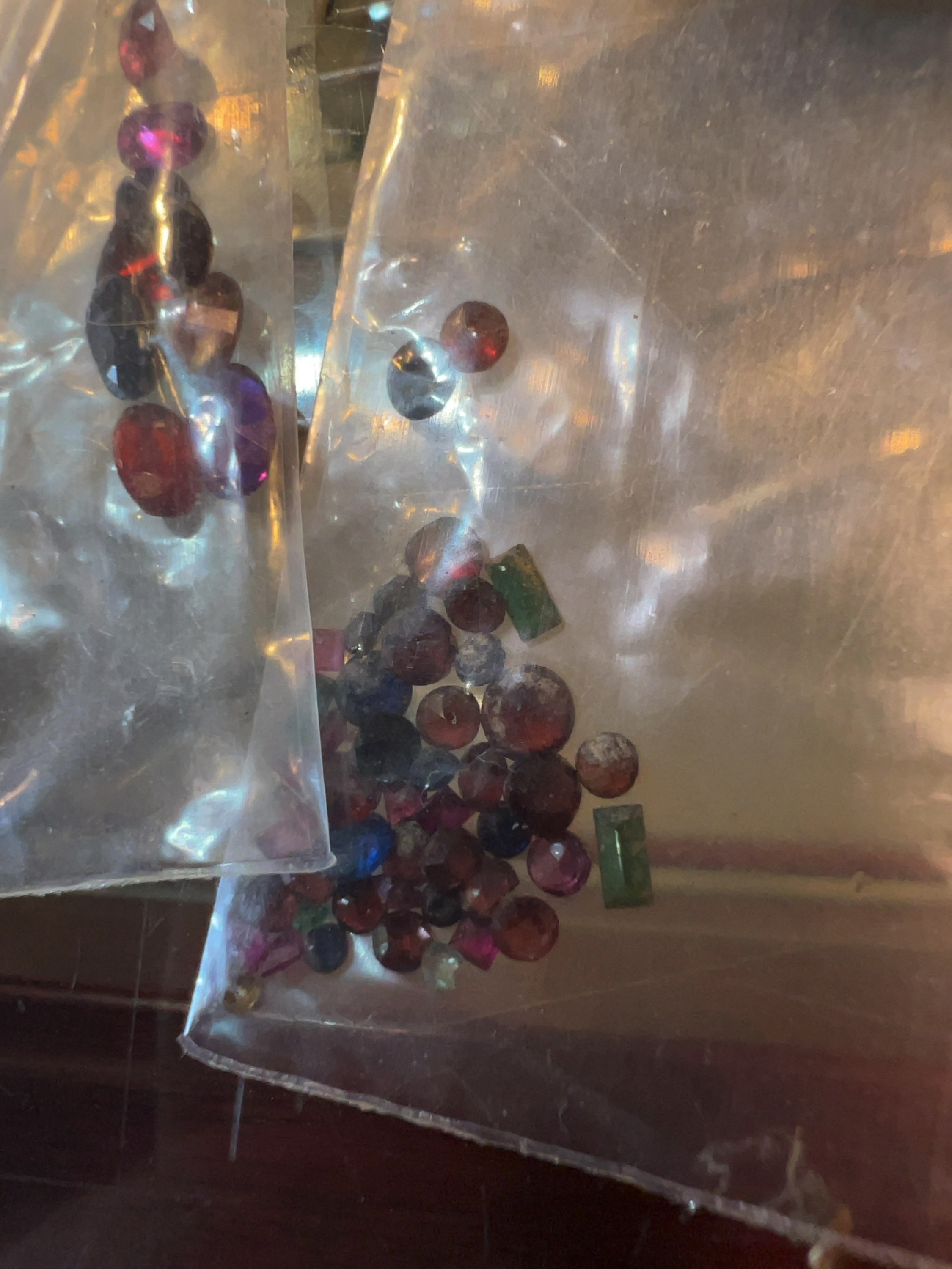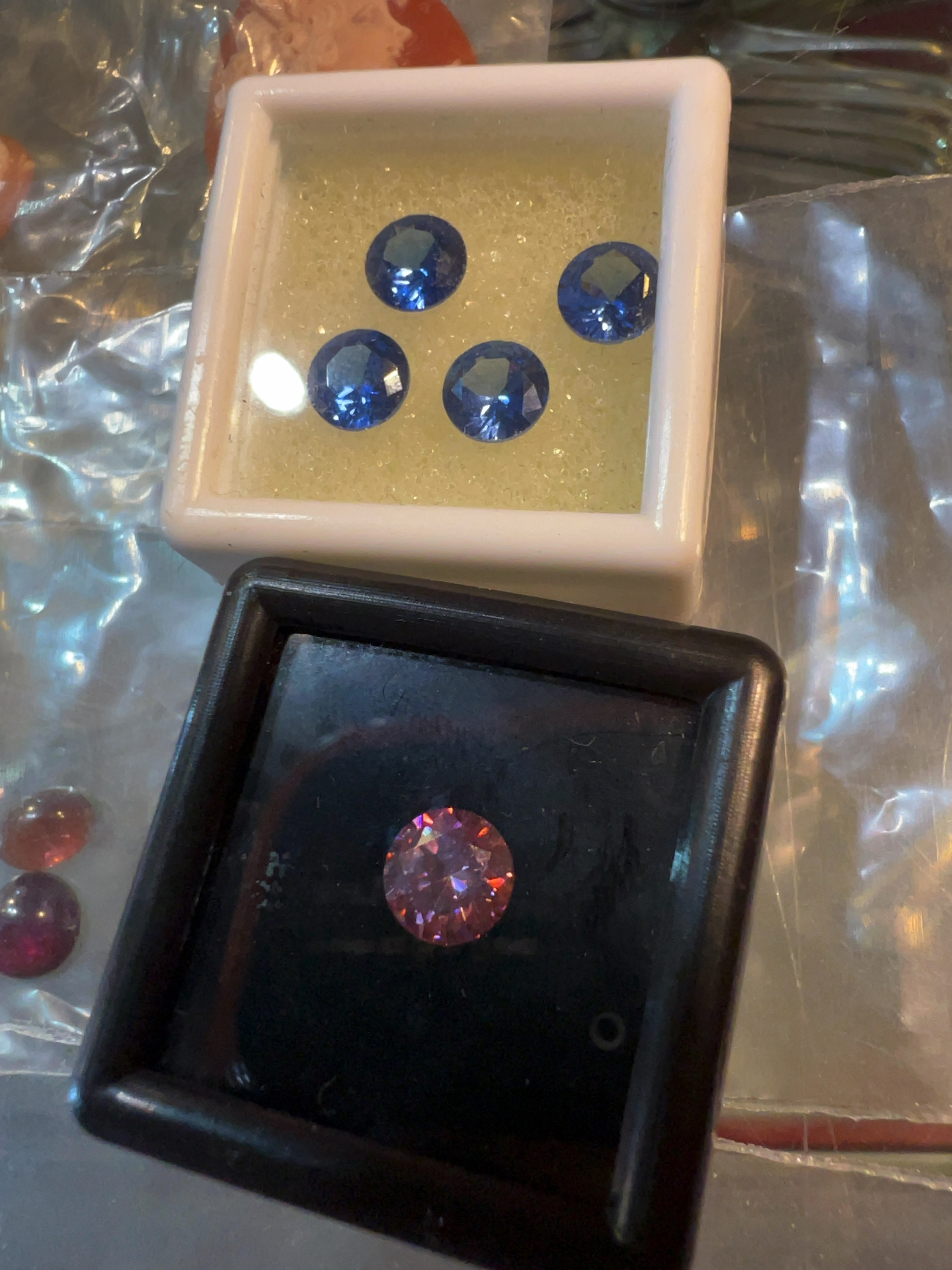 Faceted stones in cases: approximately 4mm to 7mm in diameter.
