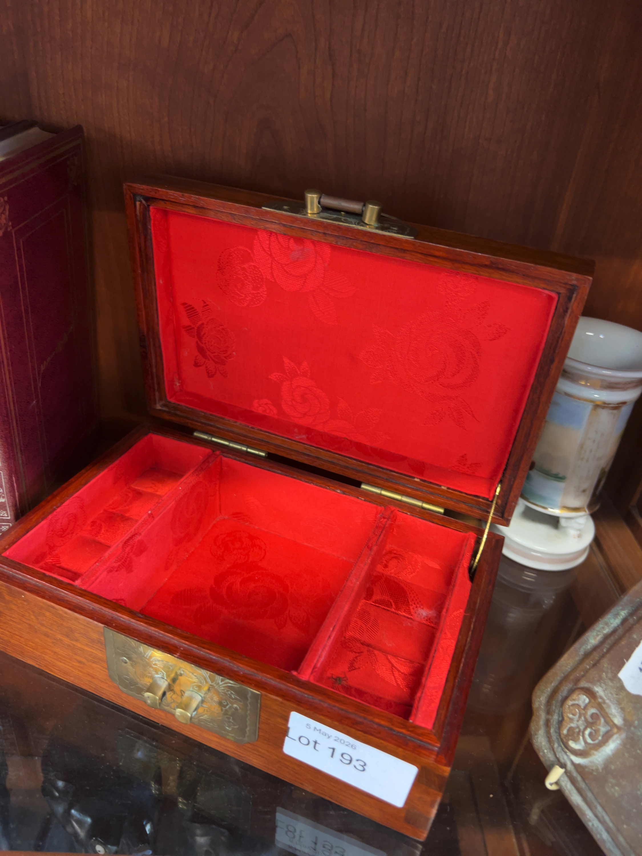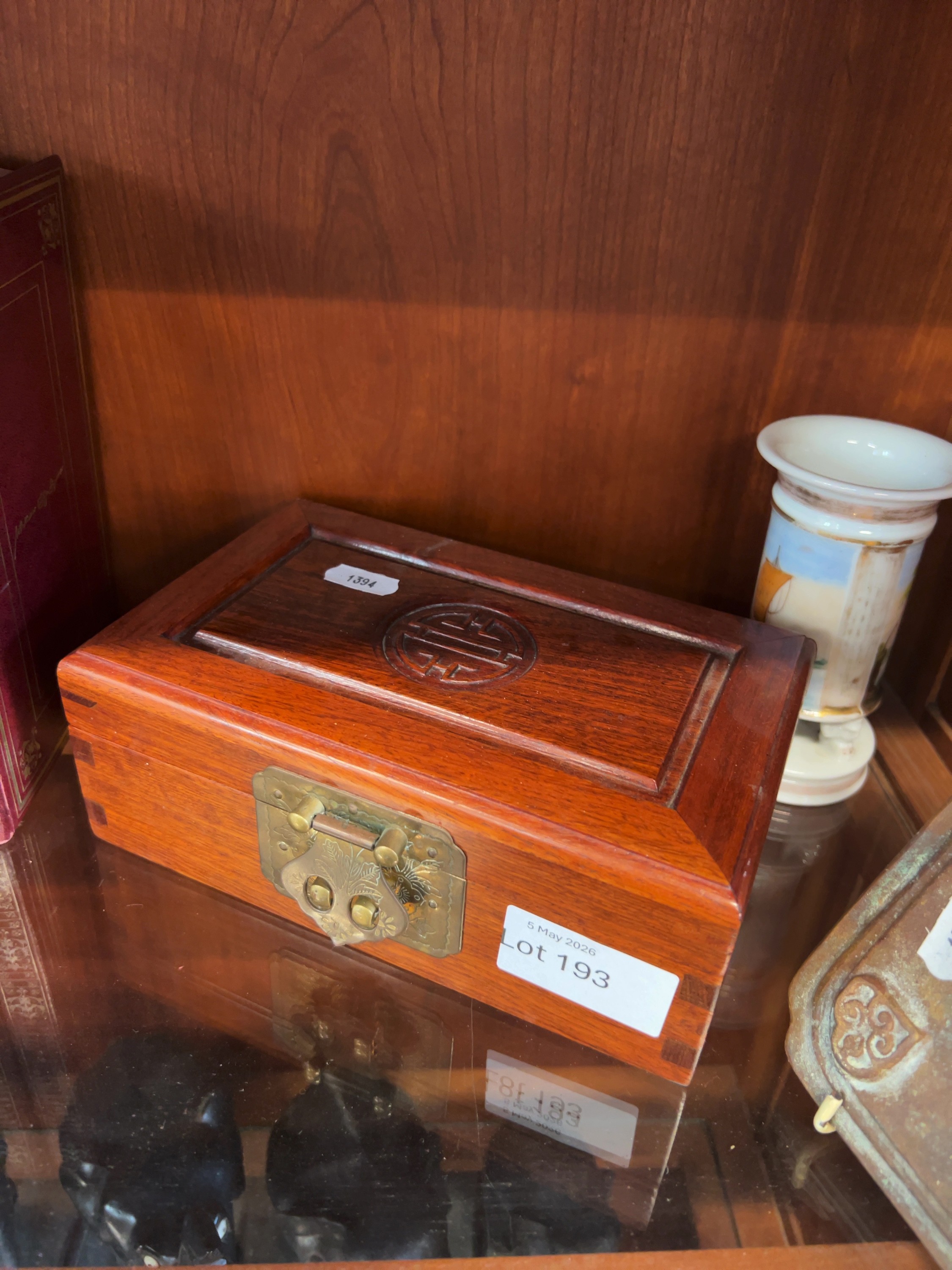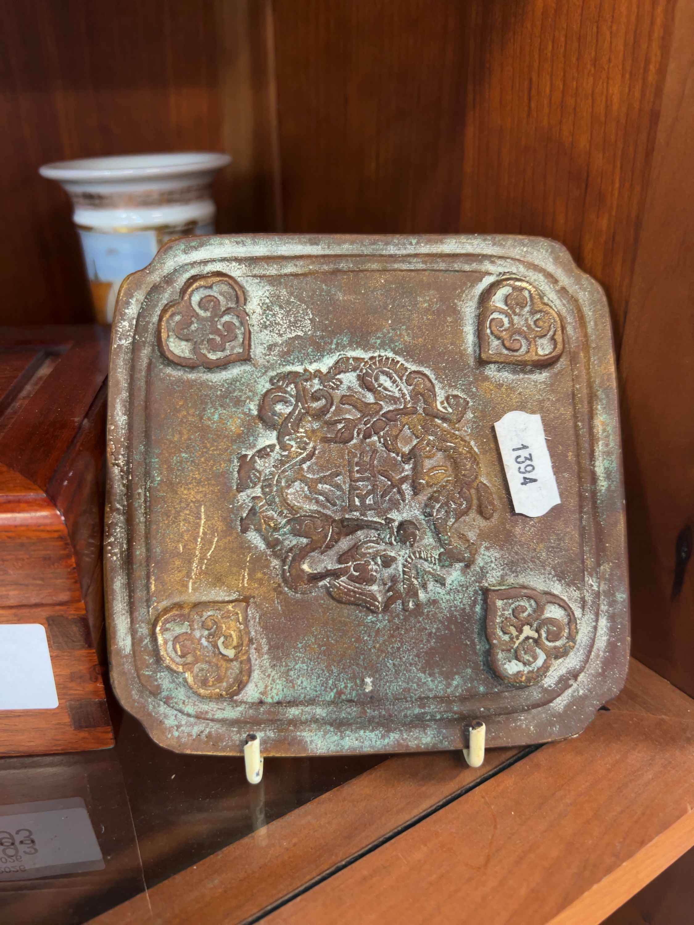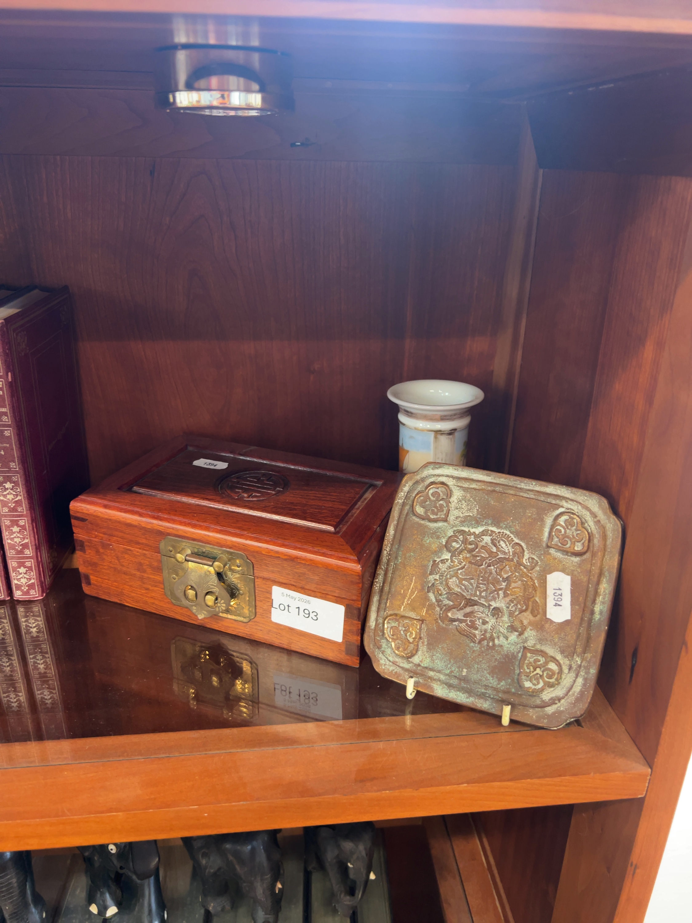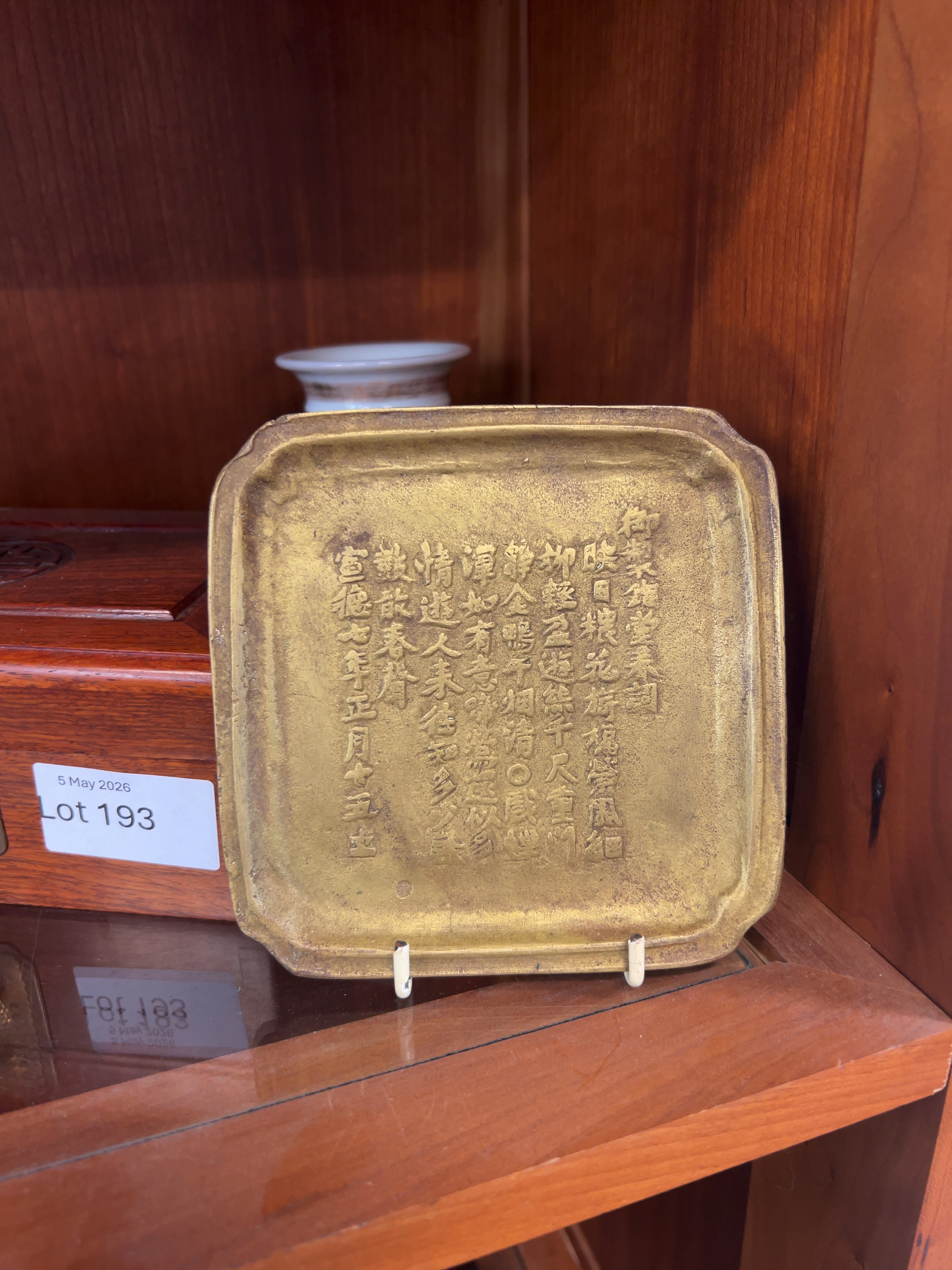 This lot consists of two Chinese decorative objects. The first is a rectangular jewellery box constructed from a dark reddish-brown hardwood, possibly rosewood, with visible dovetail joinery. The second item is a square cast bronze plaque with indented corners. Inscribed 御製 (Imperial production) and concludes with the date 宣德七年正月十五日 (Xuande 7th Year, 1st Month, 15th Day). While this references the reign of the Xuande Emperor (1425–1435) of the Ming Dynasty, the mark is apocryphal, and the plaque likely dates to the late 19th or early 20th century.