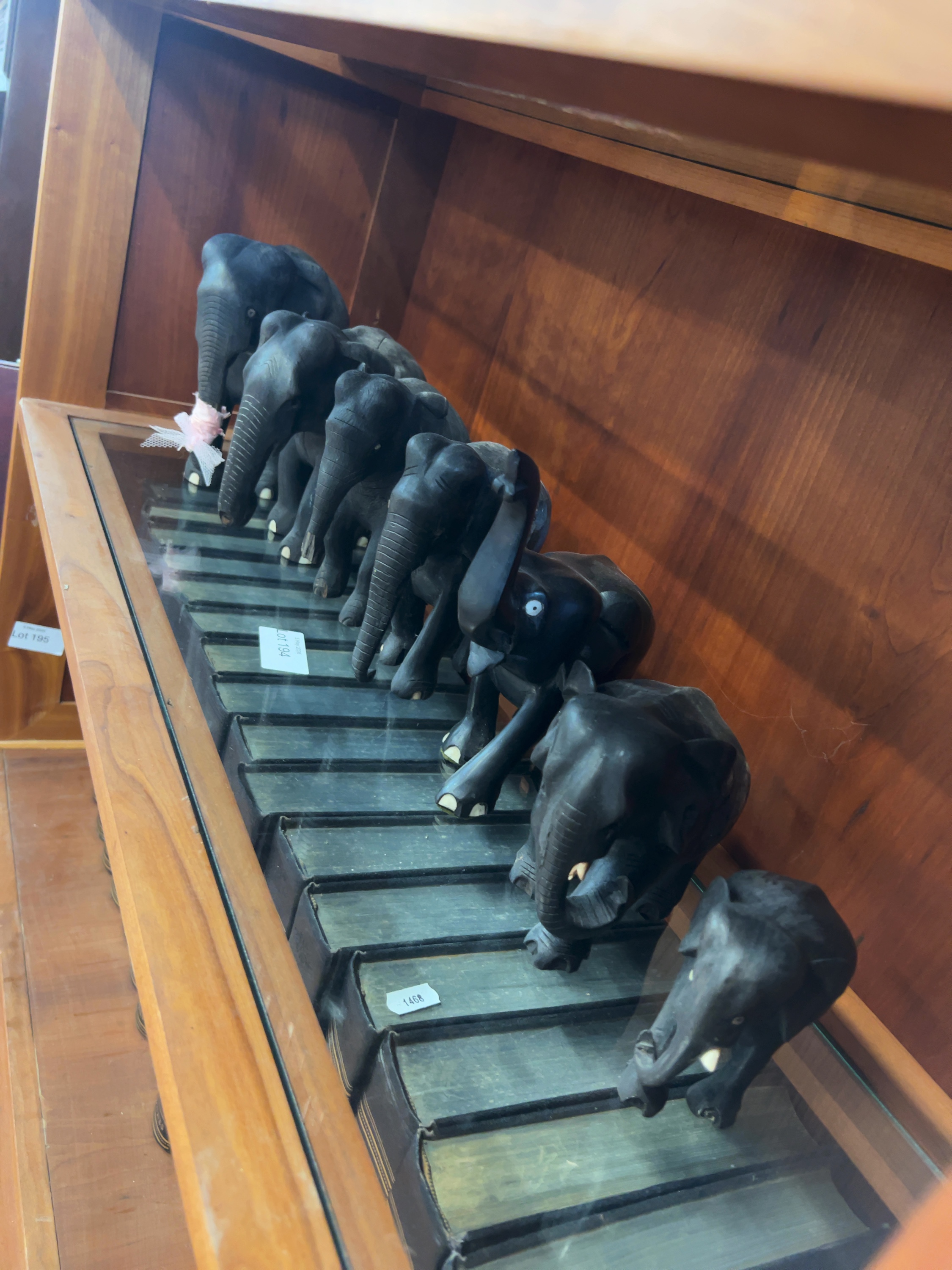 A collection of eight hand-carved elephant figurines of graduated sizes, crafted from a dense dark hardwood commonly identified as ebony. No maker’s marks or signatures are visible.