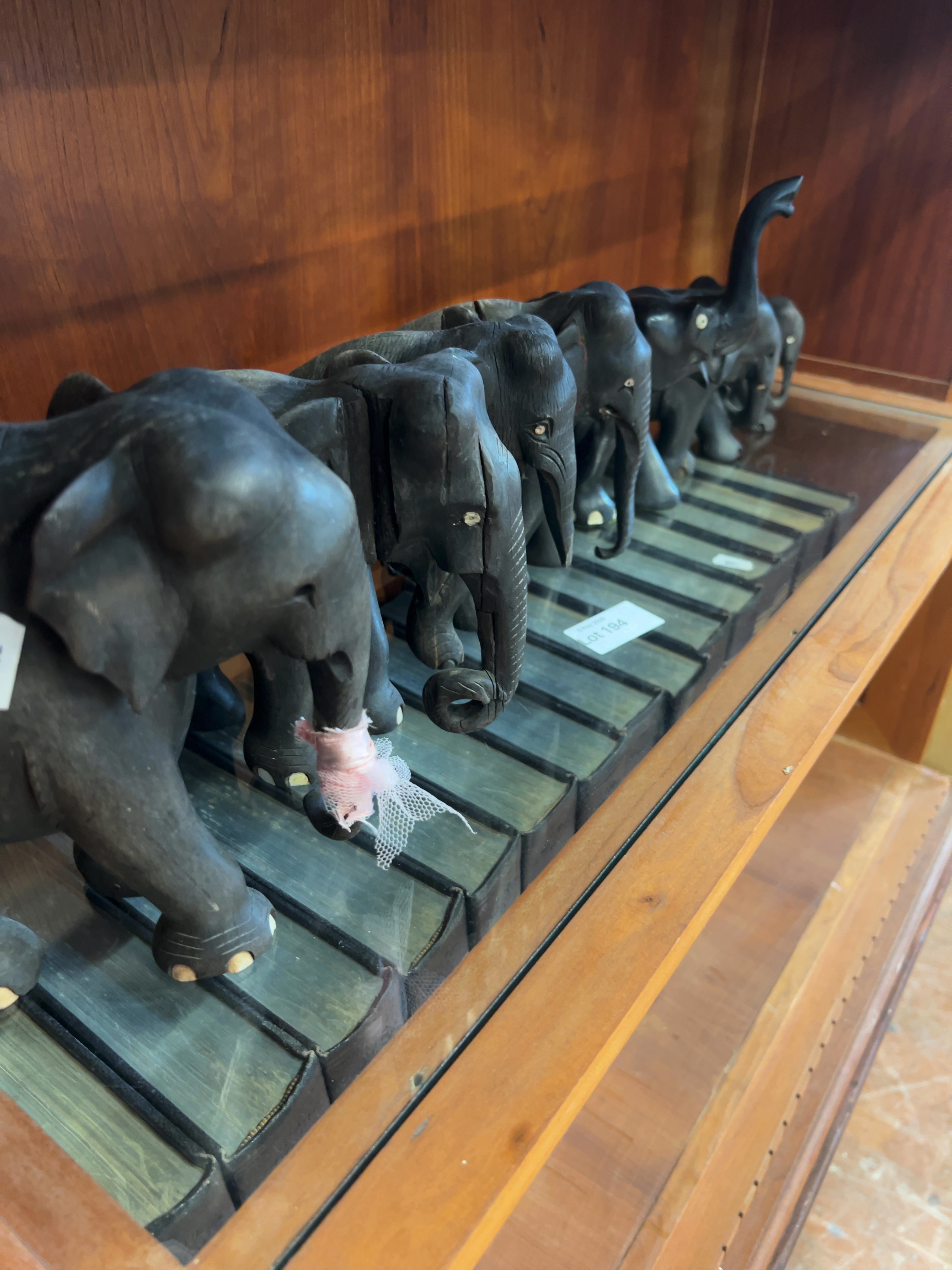 The figures show general signs of age and handling, including surface dust and minor surface wear. Several elephants are noted to have missing or damaged tusks. The carving exhibits natural variations and minor imperfections inherent to hand-crafted work.