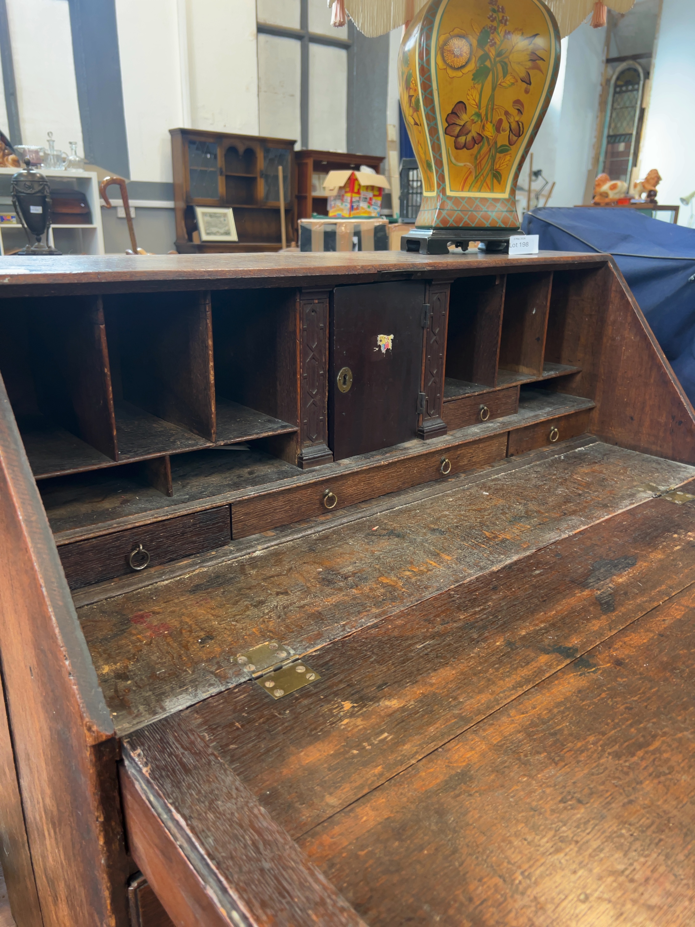 The bureau shows significant signs of age and heavy historic use consistent with the 18th century. The interior writing surface and exterior fall-front display extensive scratching, staining, and numerous historic ink marks. There is general scuffing, chipping, and wear to the edges of the carcase and the bracket feet. The drawers and lopers appear functional, though they show typical wear to the runners and sides. The wood has developed a deep, dark patina with various surface abrasions throughout.