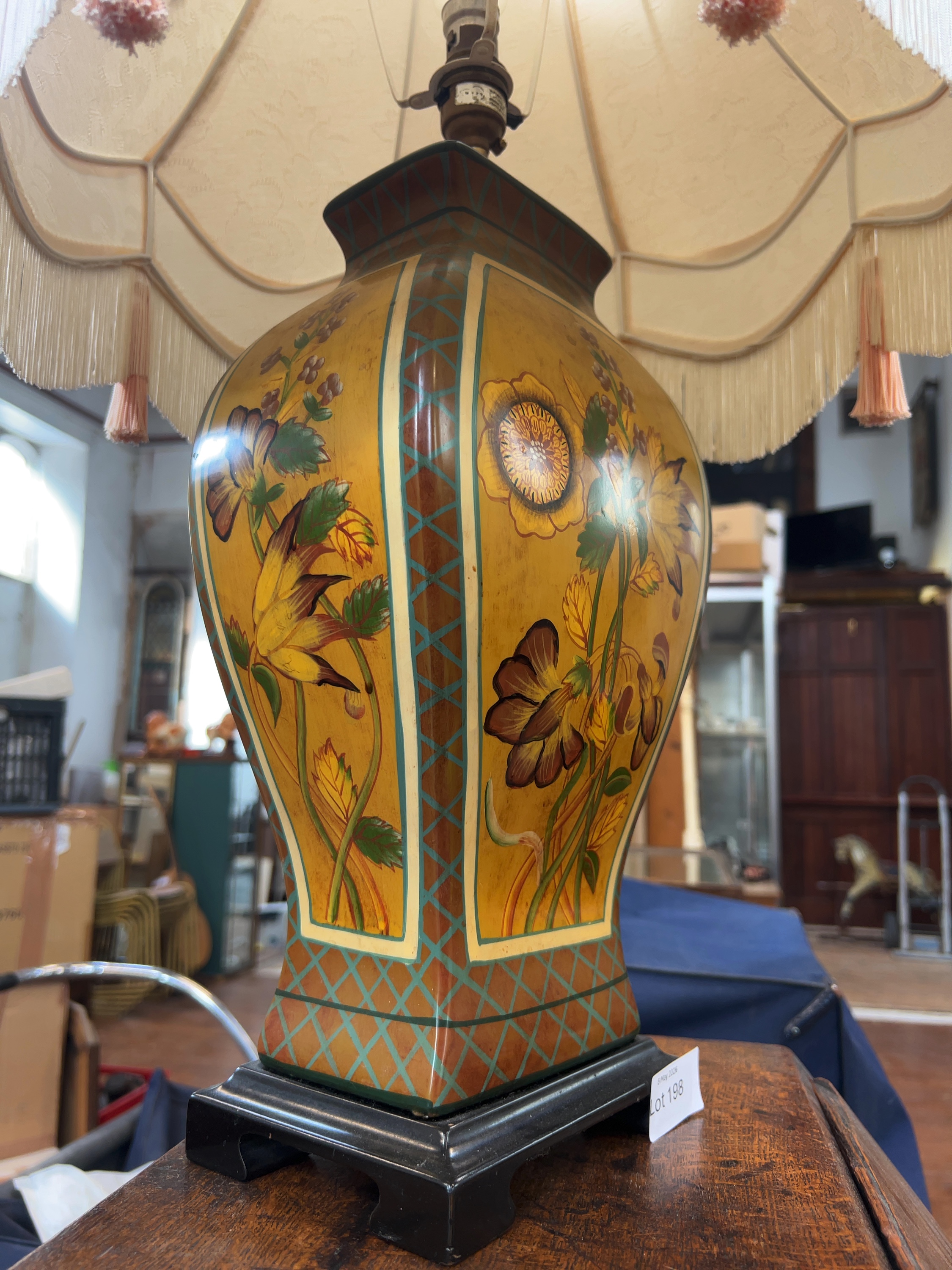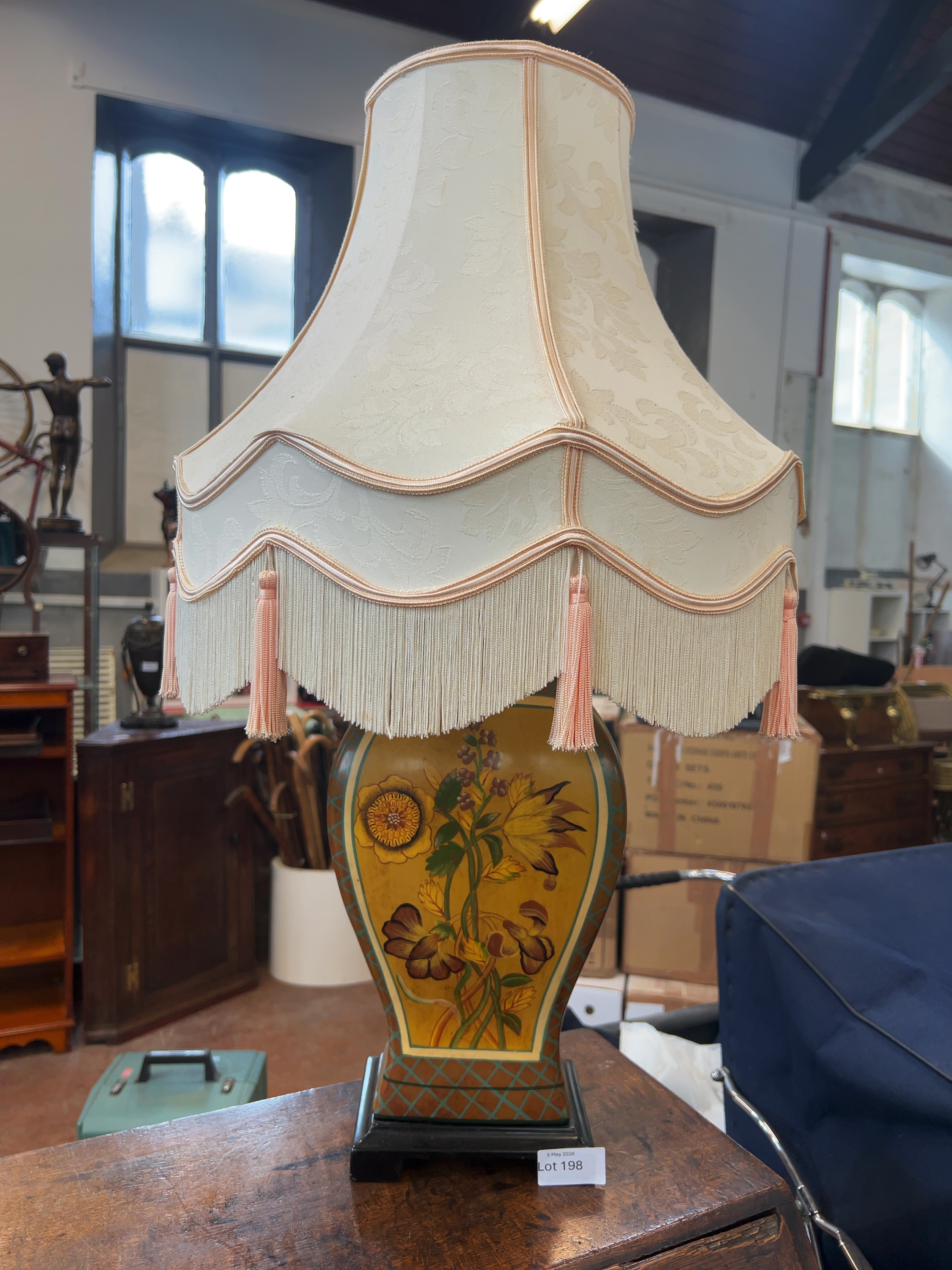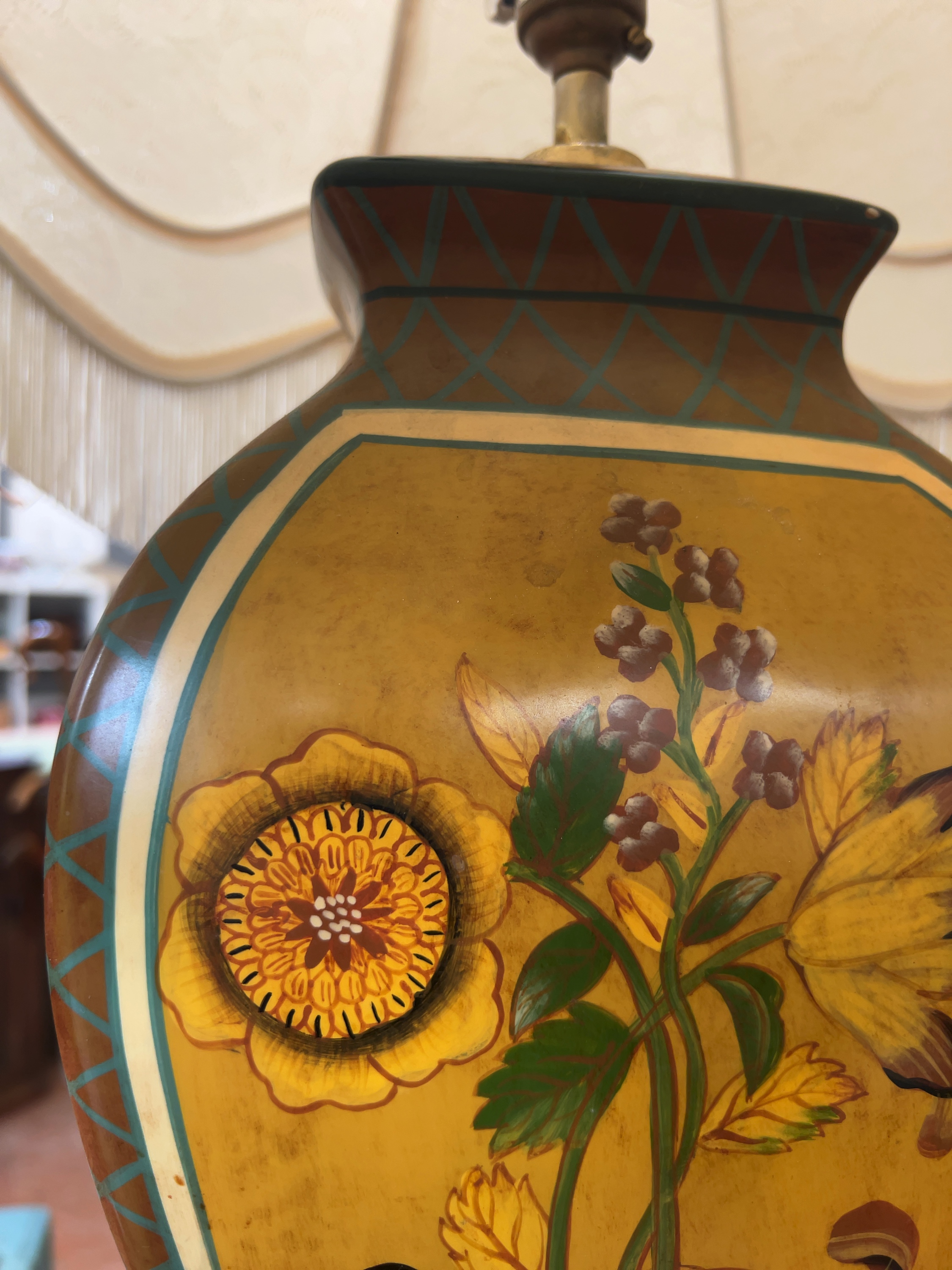A vintage ceramic table lamp of baluster form featuring hand-painted floral decoration paired with a large, cream-coloured fabric shade featuring a woven damask floral pattern. This item is sold as an untested decorative object. It is recommended that the lamp be inspected and rewired by a qualified electrician before use to ensure compliance with modern safety standards. No maker marks, stamps, or labels are visible.