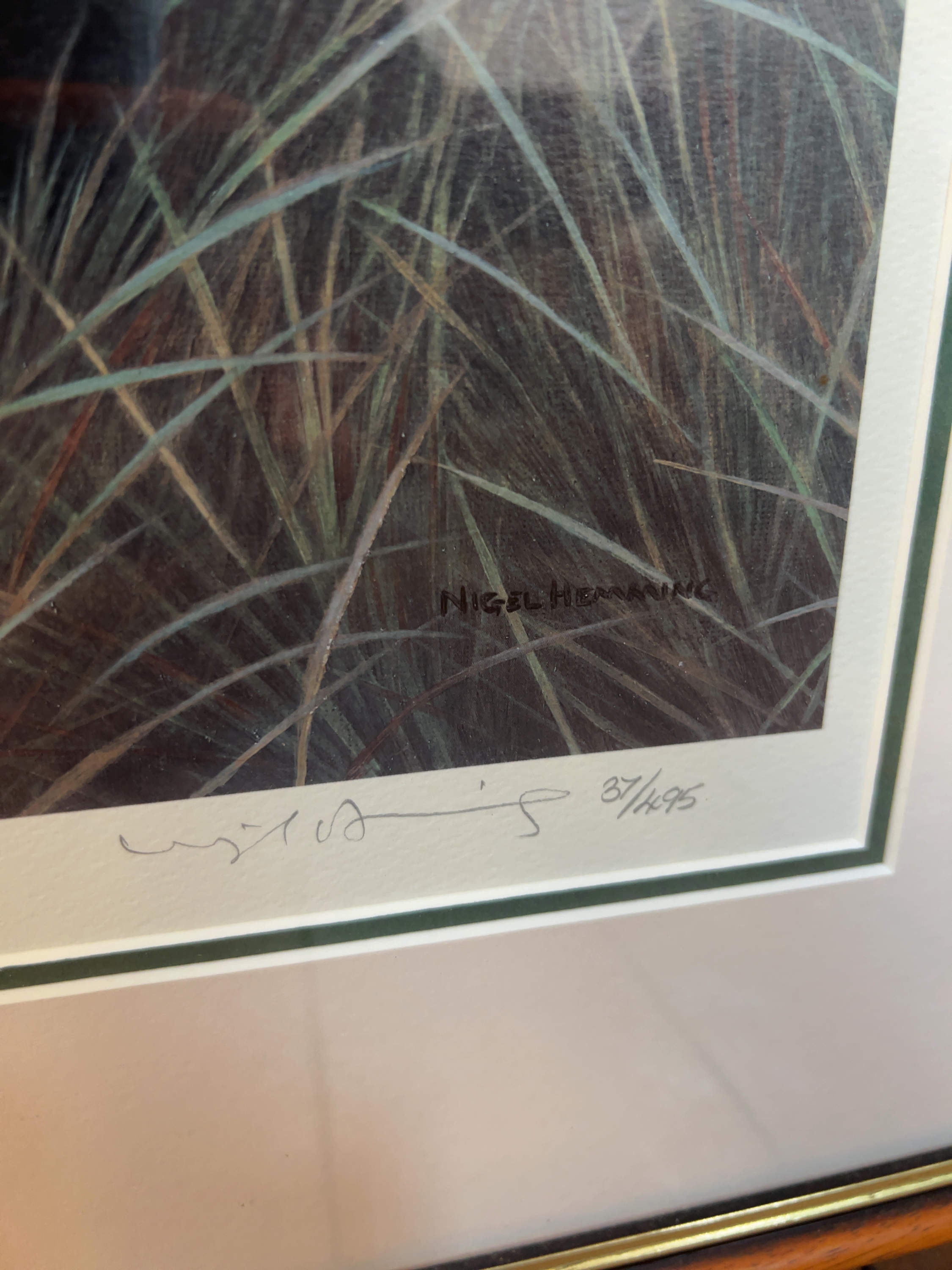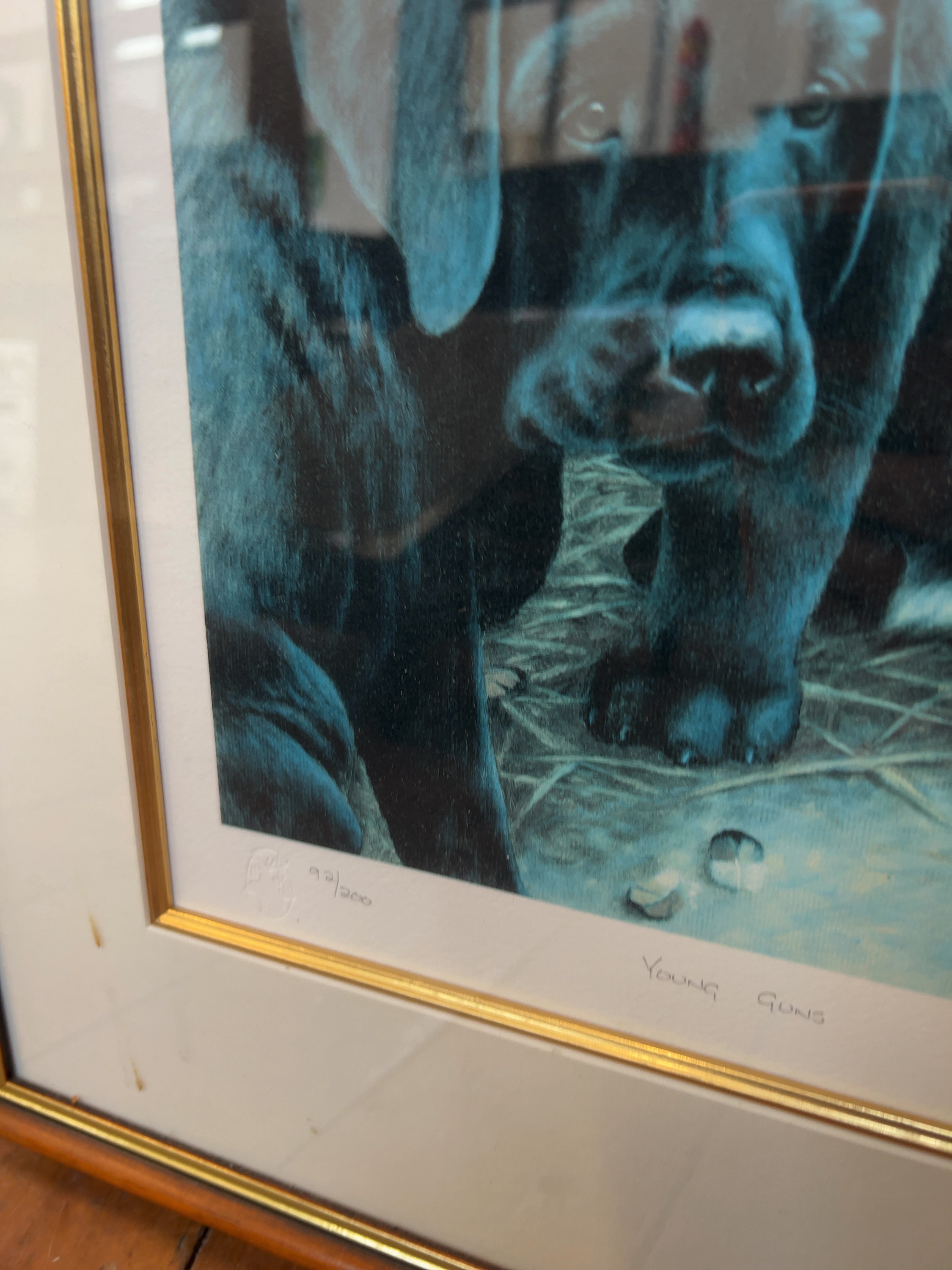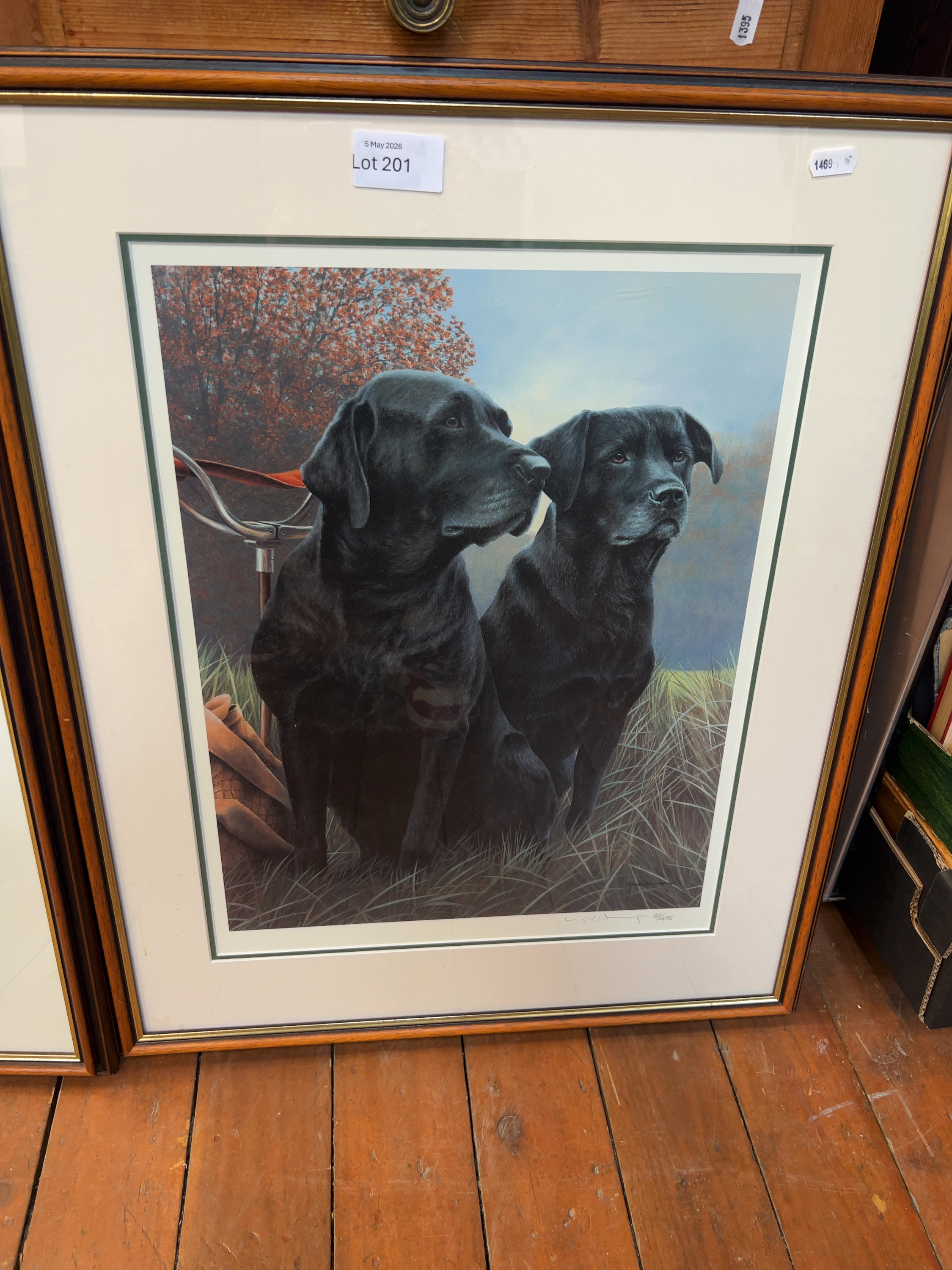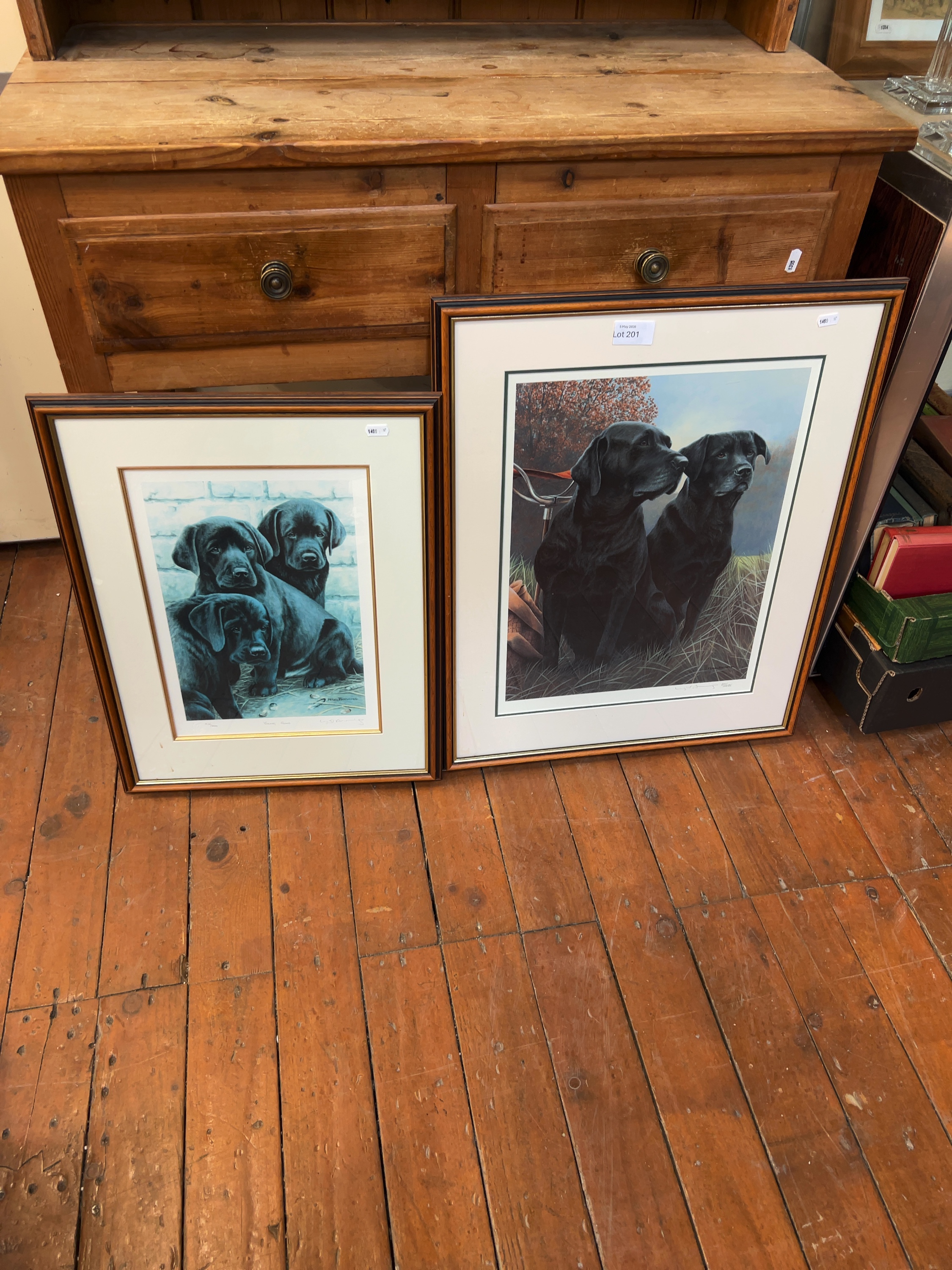 A pair of limited edition offset lithographic prints on paper after Nigel Hemming (British, b. 1954), both depicting black Labrador retrievers. The first print, titled in pencil Young Guns, numbered 97/200; a circular blind stamp is also present in this corner. The second print depicts two adult black Labradors in a field setting and is hand-signed in pencil Nigel Hemming and numbered 87/495.
