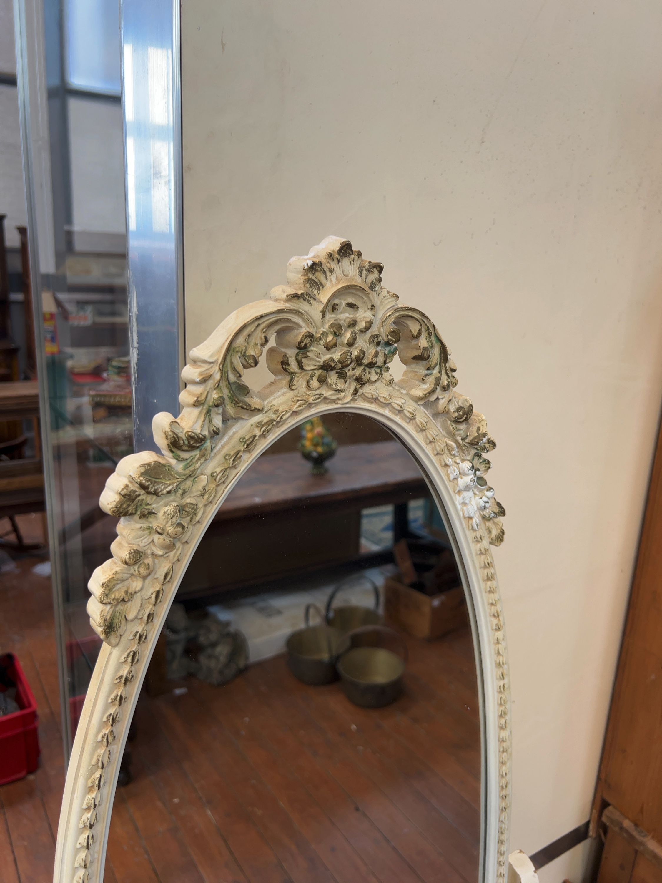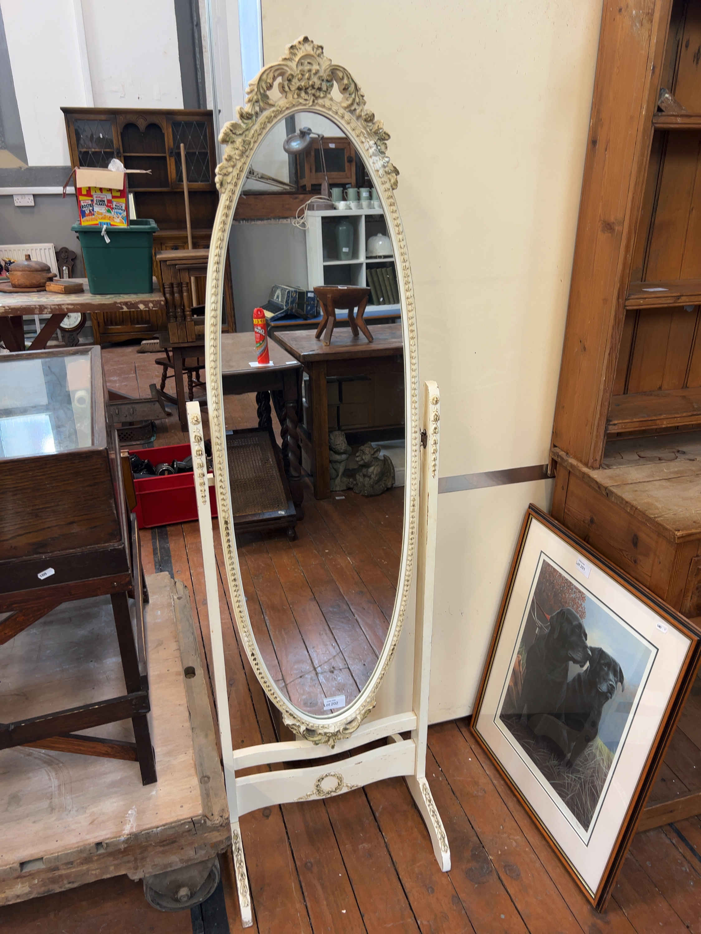 A free-standing oval cheval dressing mirror in the Rococo Revival style 20th-century reproduction in the French Provincial taste.