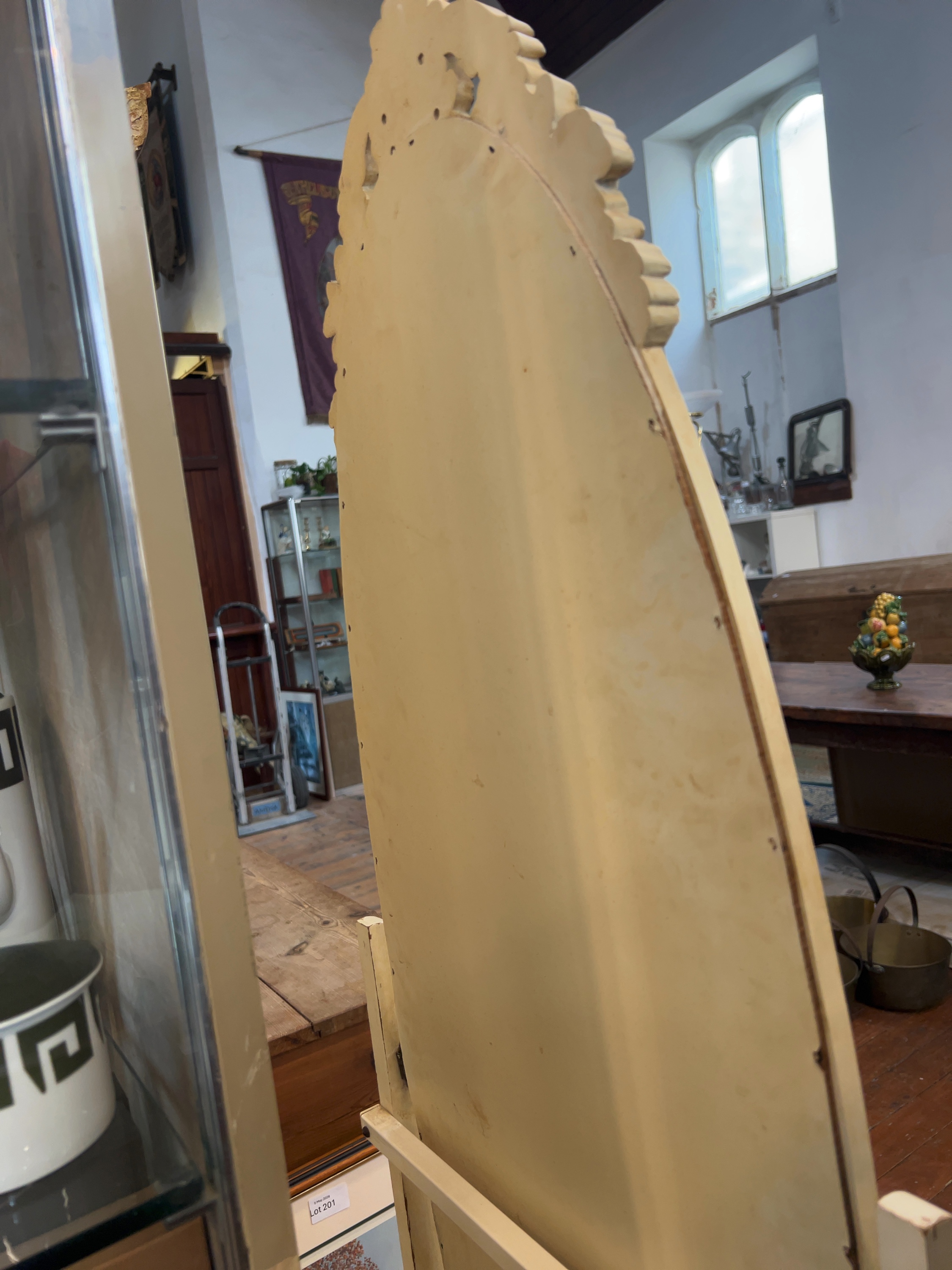 The frame and stand are in good structural condition. The painted and gilded finish is intentionally distressed to provide an aged appearance. The mirror plate is in good overall condition with no significant visible foxing or silvering loss. No major chips or losses to the carved elements are apparent.
