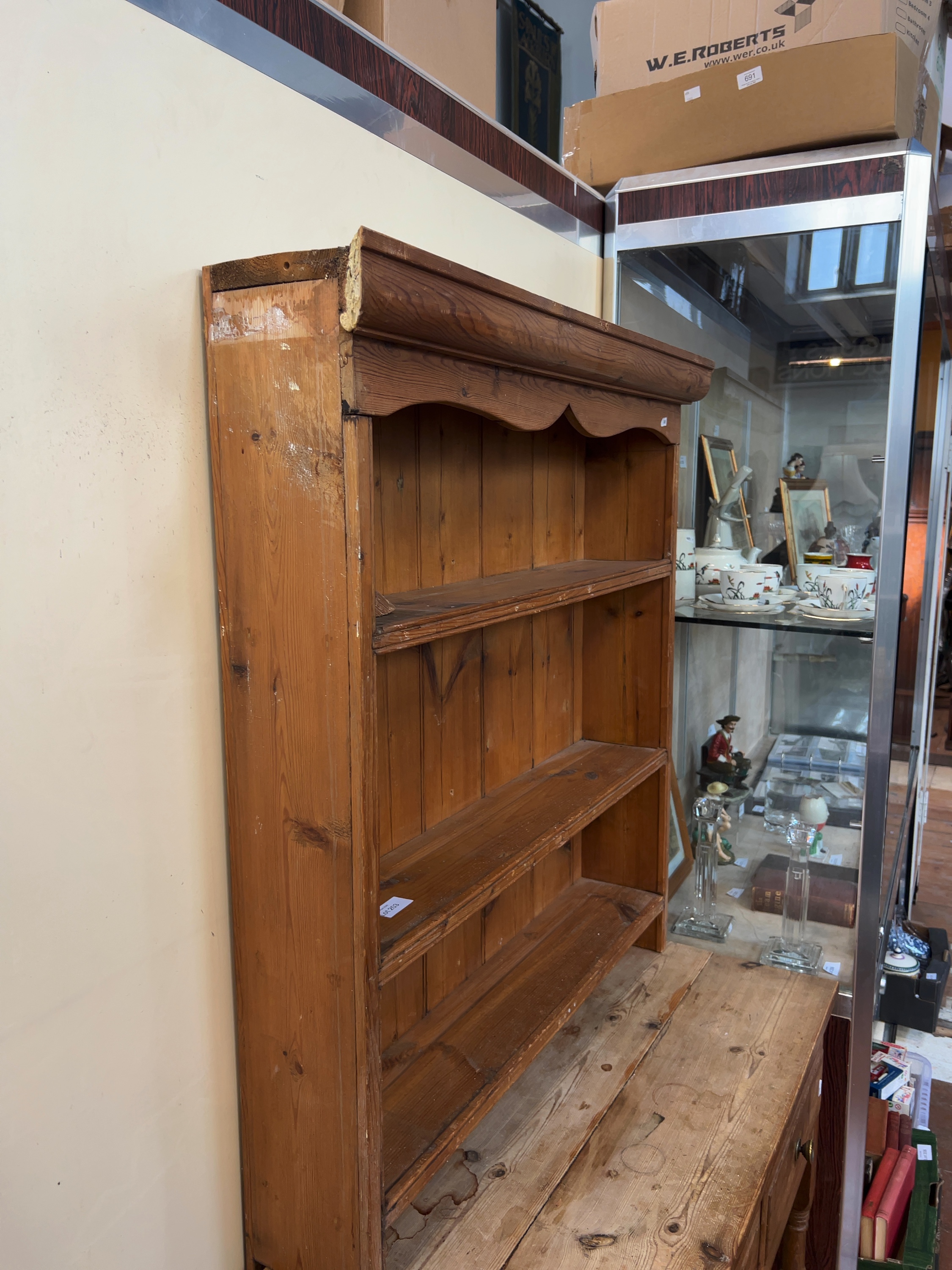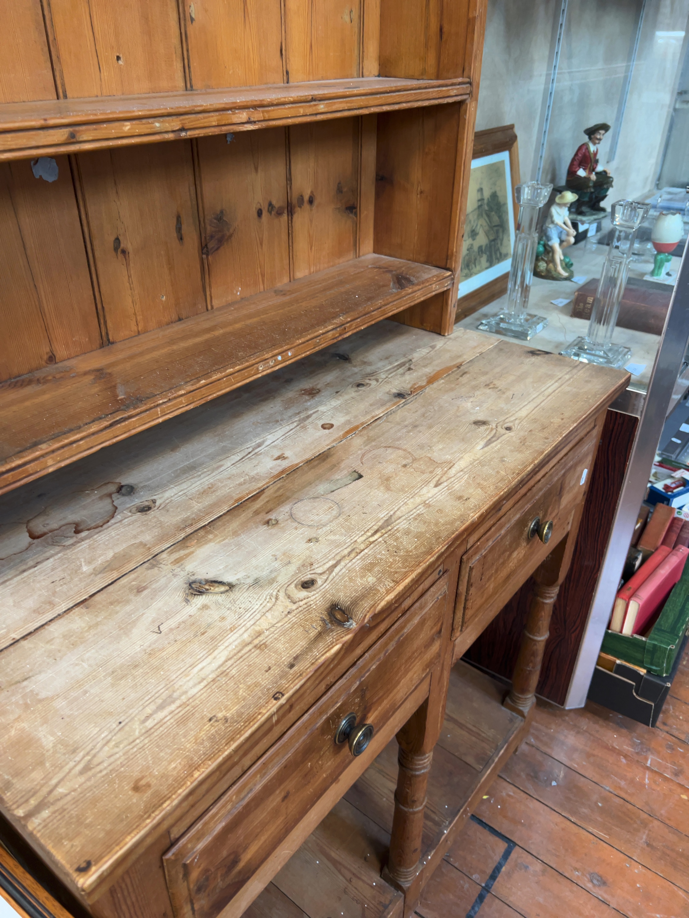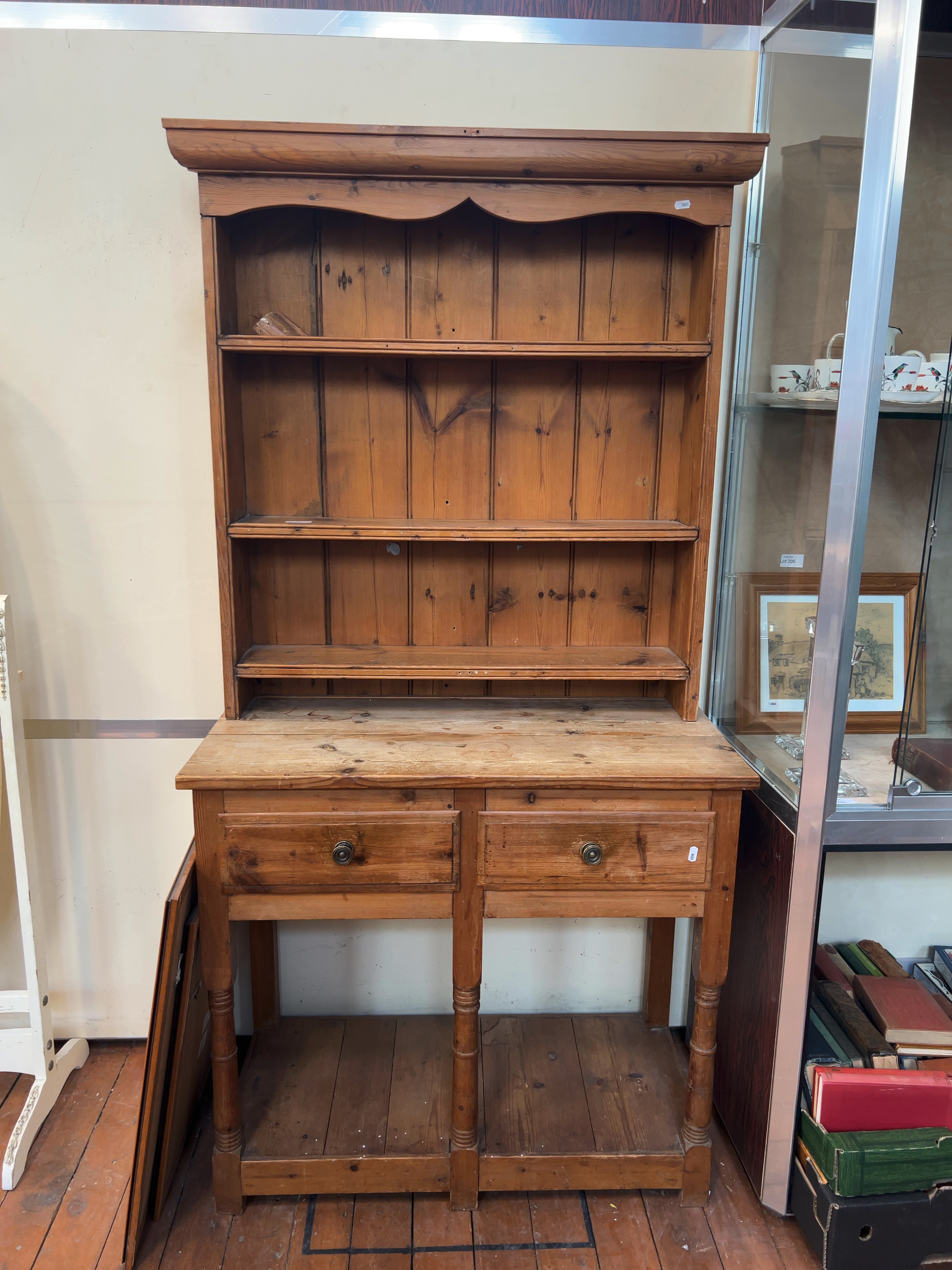 This is a two-part country pine dresser, commonly known as a Welsh dresser, designed in a traditional farmhouse style. No maker’s marks or stamps are visible on the item.