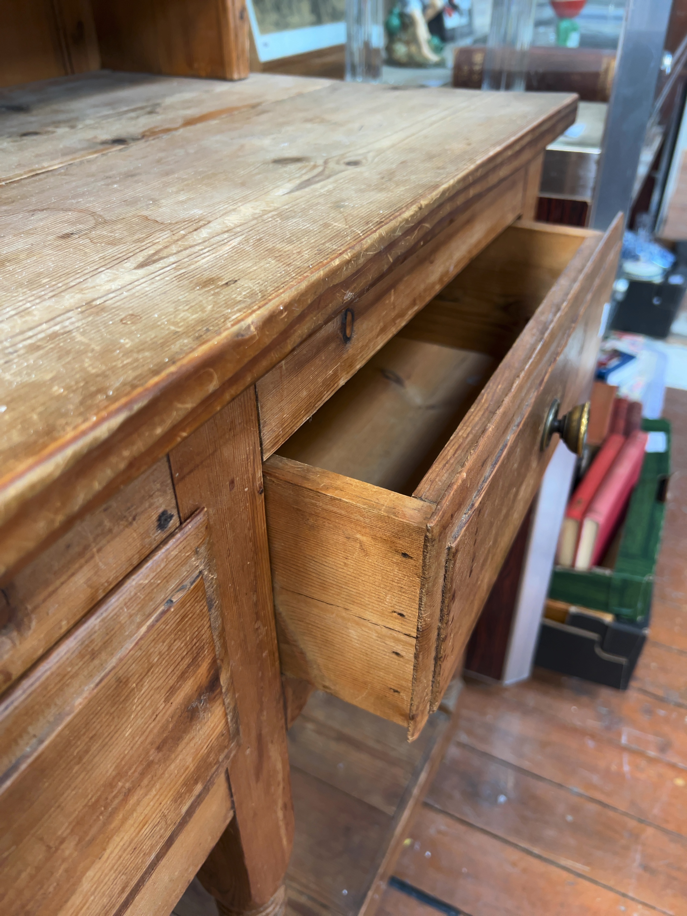 The item is in a well-used, rustic condition consistent with age and utilitarian use. The top surface of the base shows significant signs of wear, including multiple water rings, dark stains, and general surface abrasions. There is a visible loss to the moulded return on the left-hand side of the top cornice. General scuffs, scratches, and minor indentations are present throughout the woodwork. Some separation is visible between the planks of the base top. The drawer hardware appears original and remains functional.