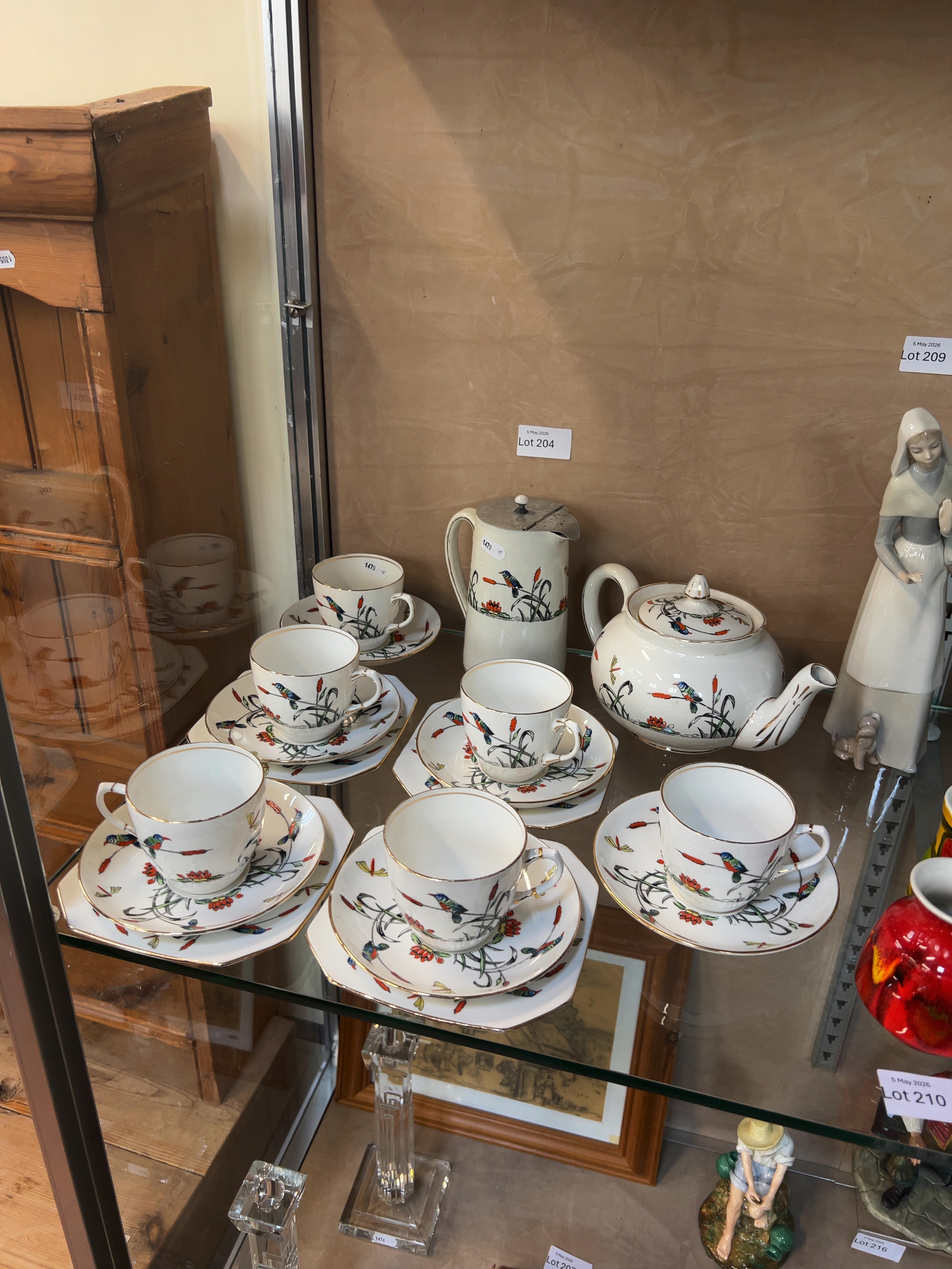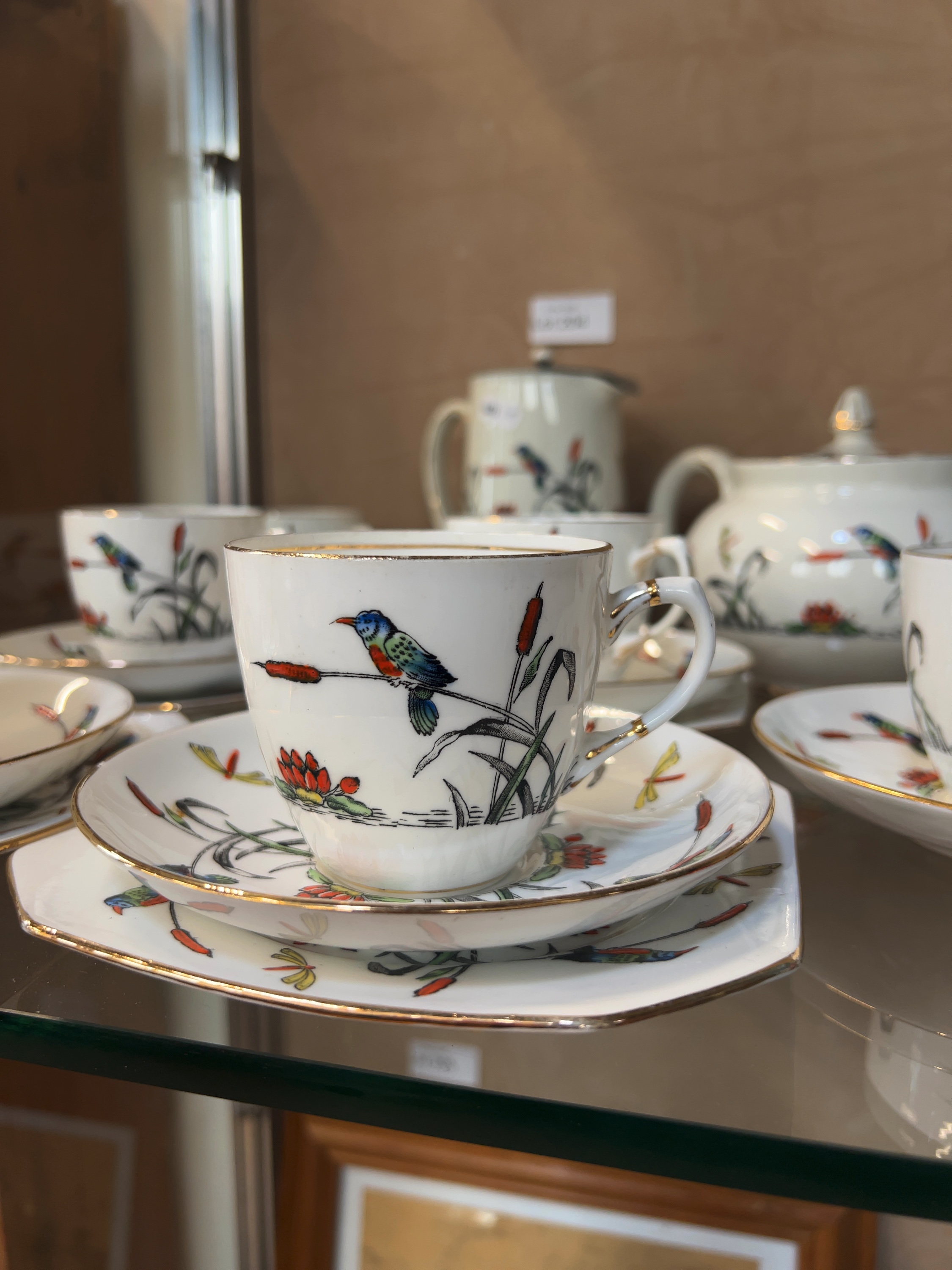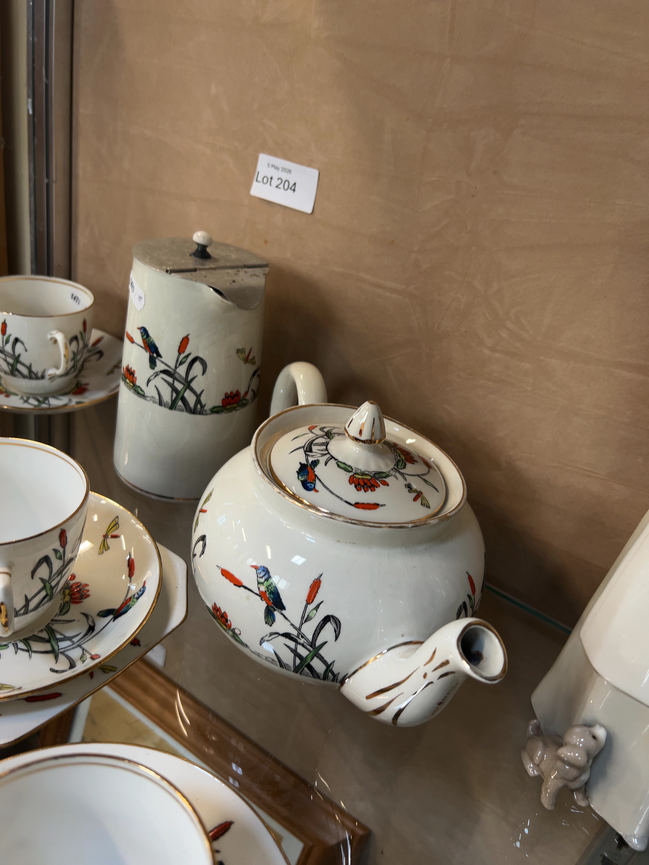 The set is in generally good vintage condition. There is visible fine age-related crazing to the glaze of the teapot and some other components. Minor instances of gilt wear are present on the rims, consistent with age and use. Light surface staining and shelf wear are visible on the footrims. No major chips, cracks, or restorations are apparent.