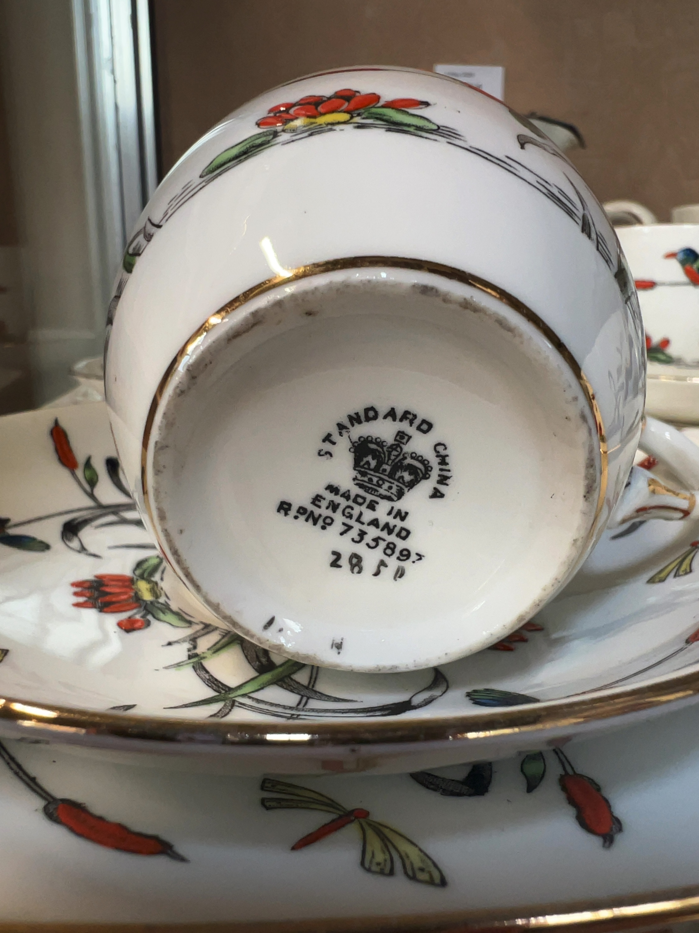 A set of bone china tableware by Chapmans (Longton) Ltd, produced under the Standard China trade name. The collection is decorated in the Kingfisher pattern (pattern number 2811), includes a globular teapot with a domed lid, a tall tapering lidded jug with a hinged metal cover, teacups, saucers, and octagonal side plates with clipped corners. The bases bear a printed backstamp in black consisting of a crown above the words MADE IN ENGLAND and RD NO 733897, with the pattern number 2811 below. The registered design number dates the pattern to approximately 1928, placing the manufacture in the Art Deco period.