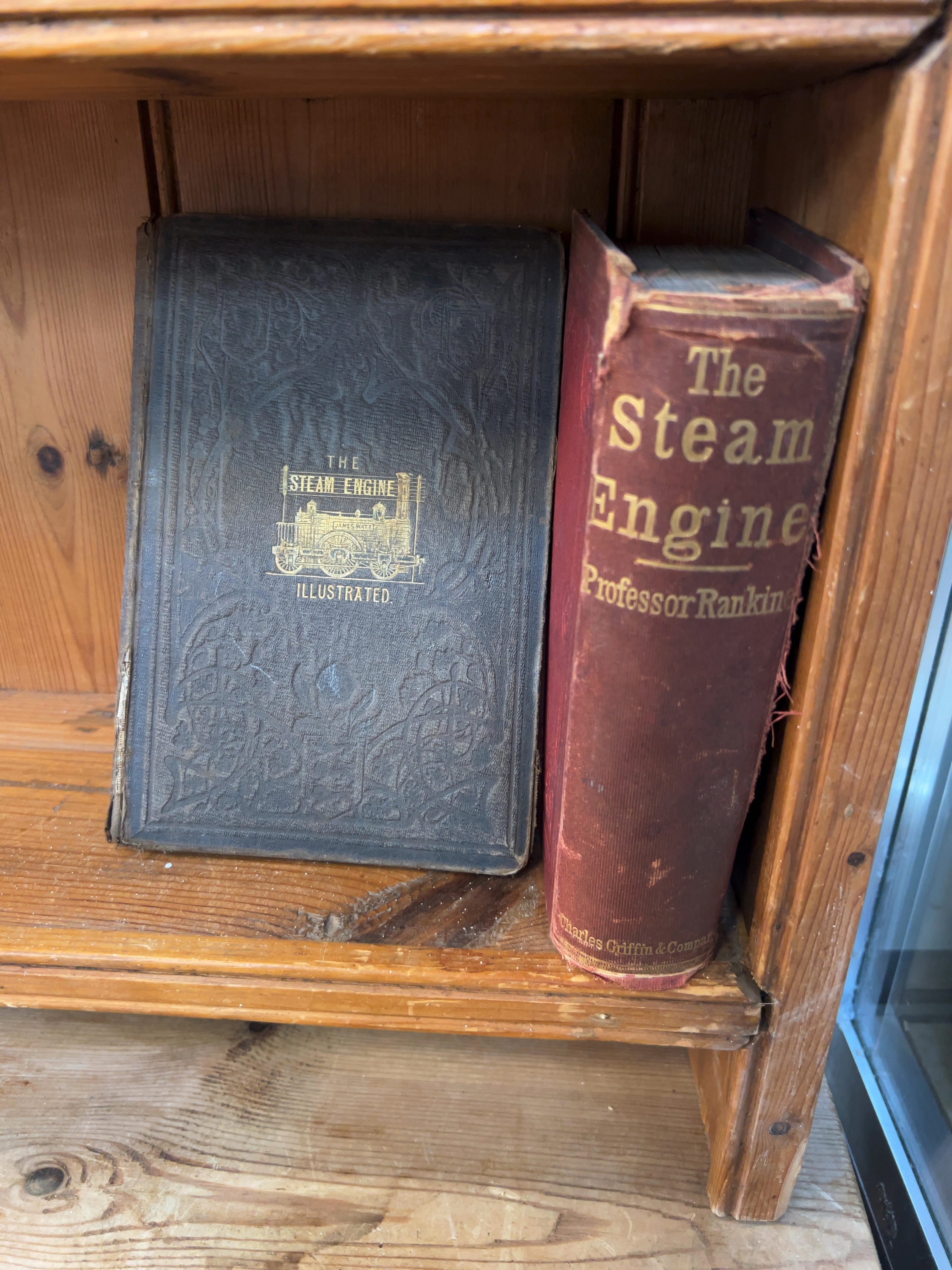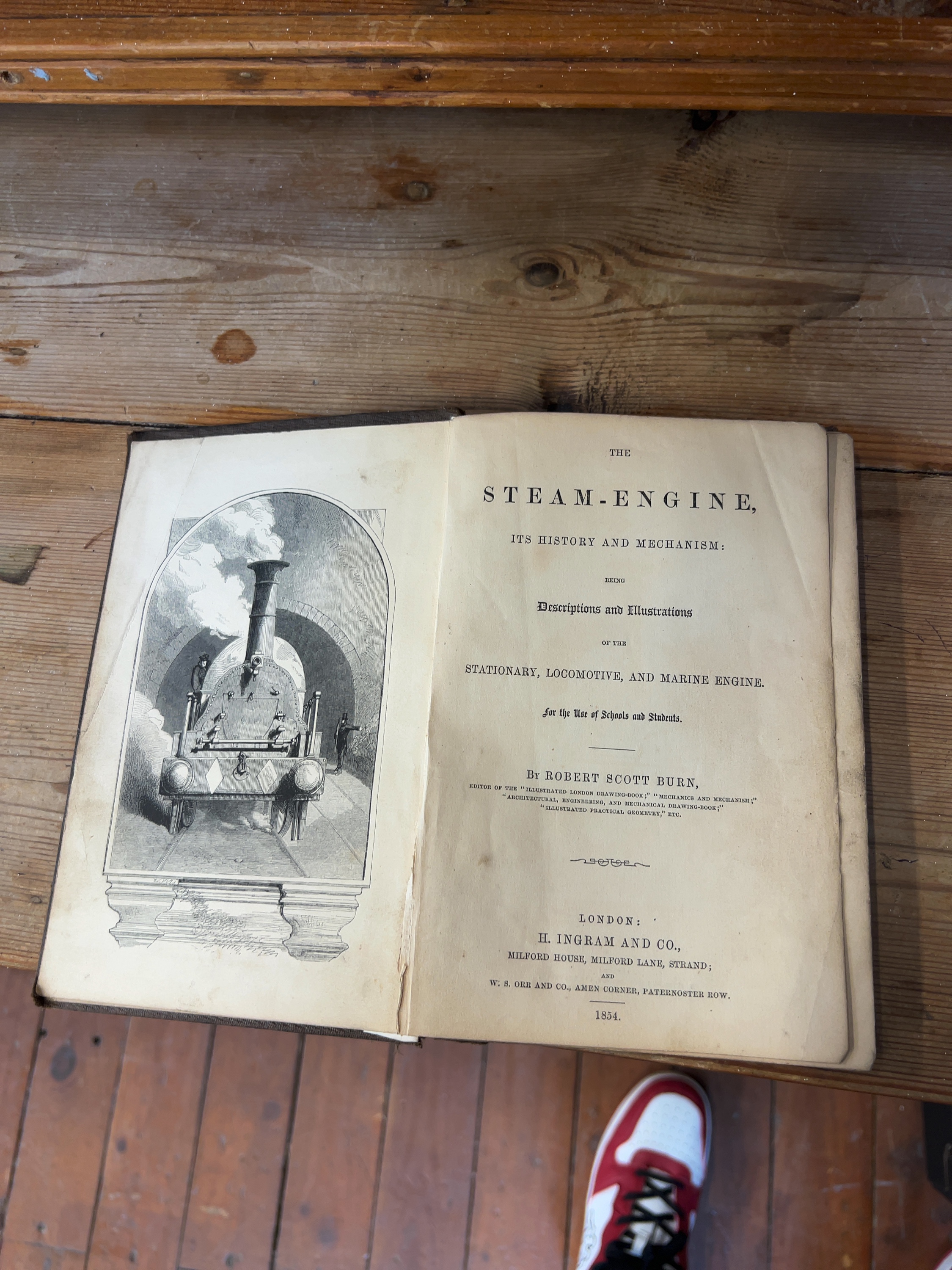 Two separate mid-19th century technical volumes concerning the history and operation of steam engines. The first volume is Robert Scott Burn, The Steam-Engine, Its History and Mechanism: Being Descriptions and Illustrations of the Stationary, Locomotive, and Marine Engine. London: H. Ingram and Co., 1854.