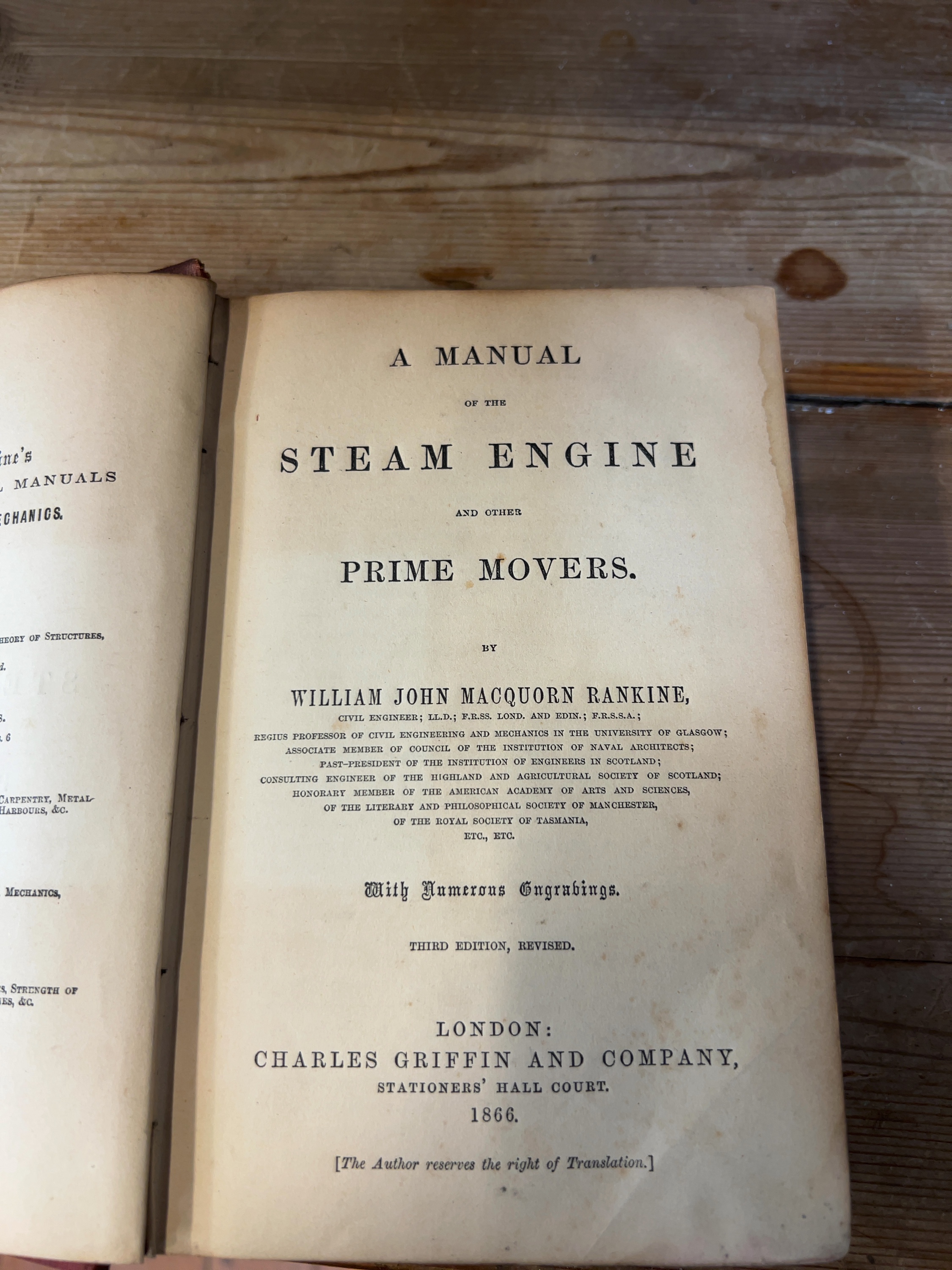 The second volume is William John Macquorn Rankine, A Manual of the Steam Engine and Other Prime Movers. London: Charles Griffin and Company, 1866. Third edition, revised. Both volumes contain numerous engravings and technical illustrations.