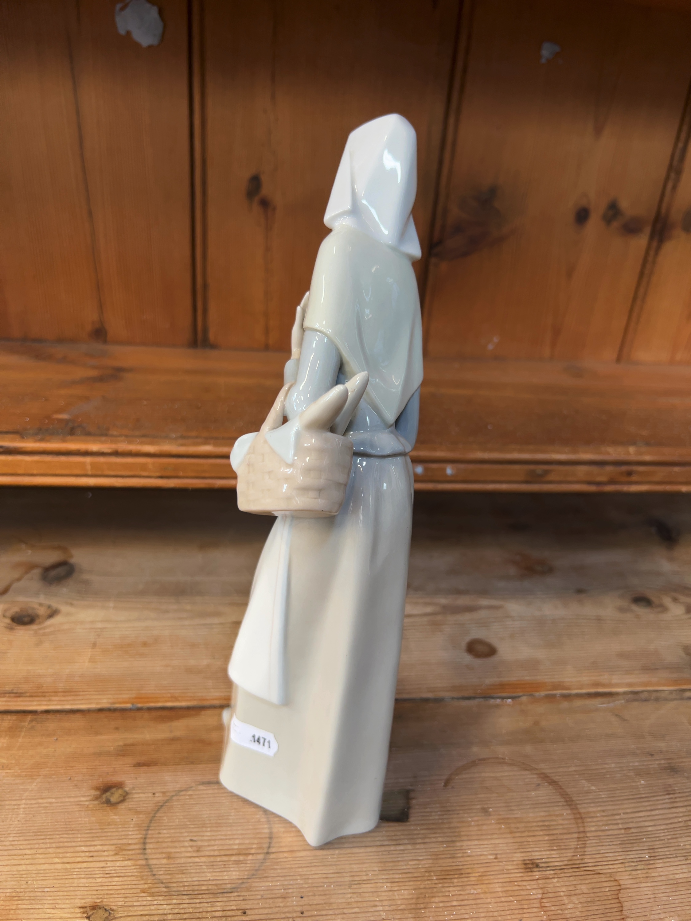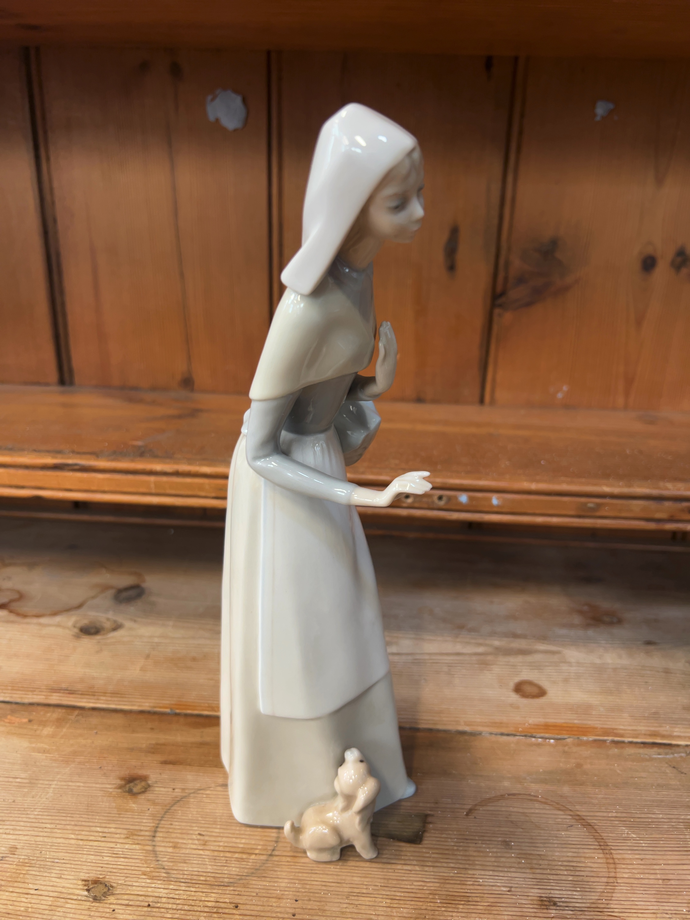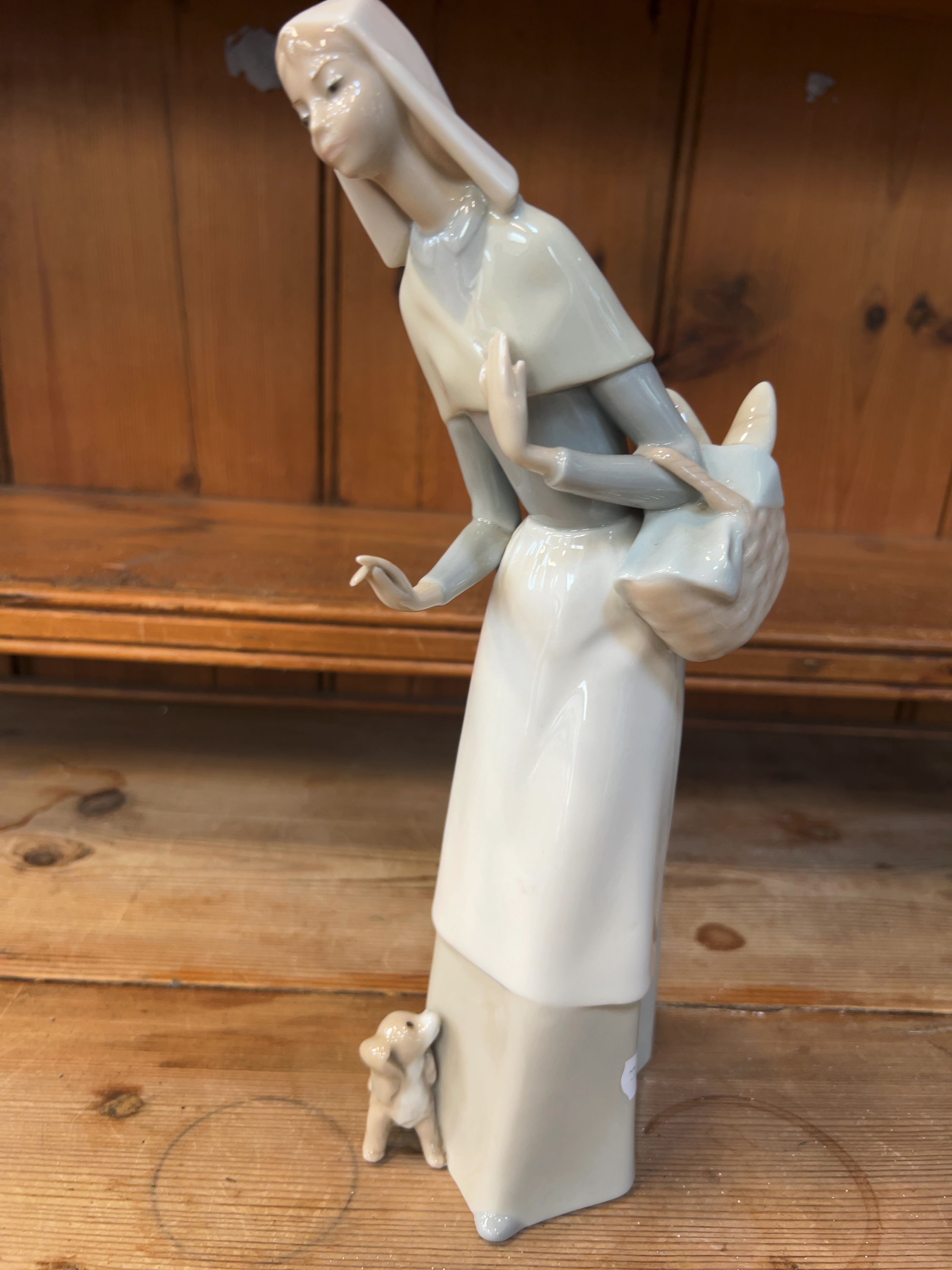 The figurine is in excellent condition. Close inspection confirms that the fingers on both hands, the basket handle, the dog\'s ears, and the edges of the habit are all intact with no visible chips, cracks, or signs of restoration. Minor surface dust is present.