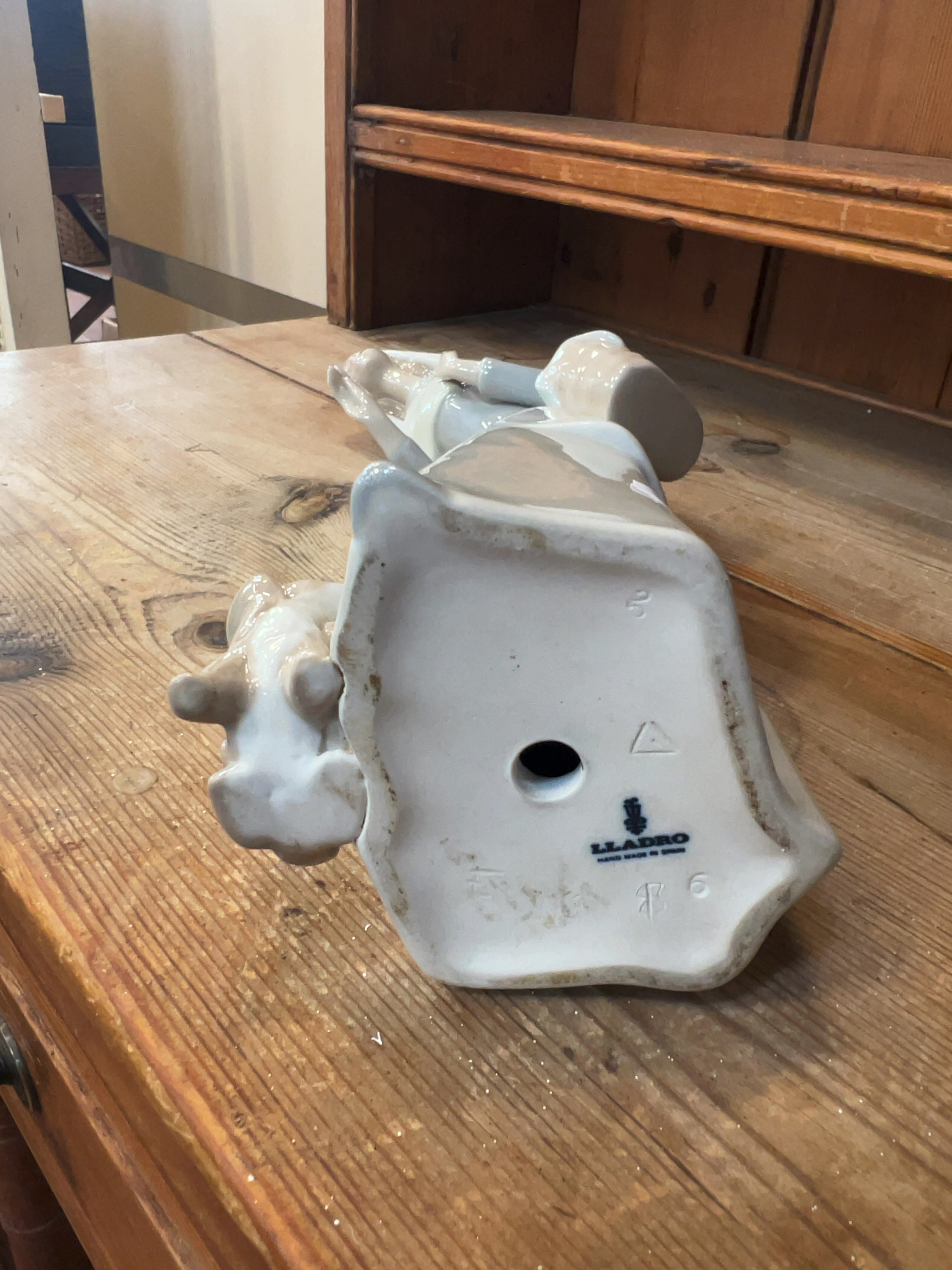 This is a Lladró glazed porcelain figurine titled Sisters’ Task, also known as Sister with Bread, identified as model number 1471. The base bears the blue printed Lladró factory mark with a stylized bell-flower logo above the text LLADRÓ and HAND MADE IN SPAIN. Additional impressed and incised marks include the character S, a triangle with a central mark, a cursive monogram, and the number 6.