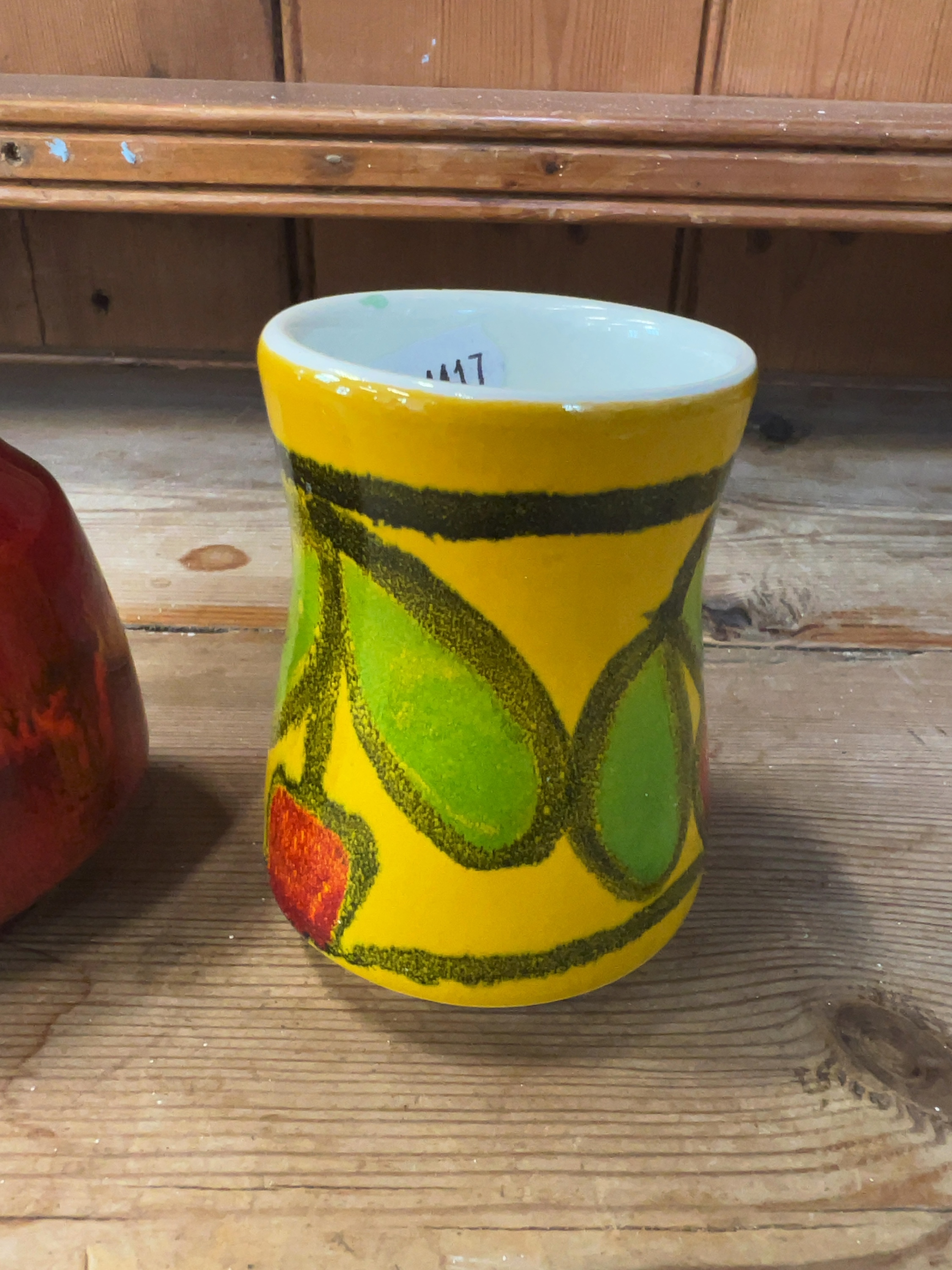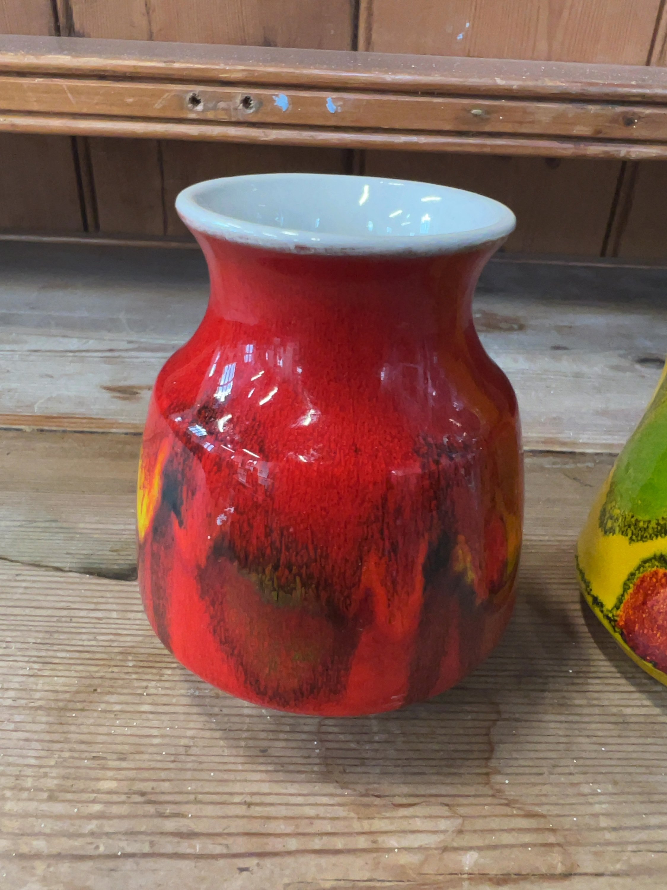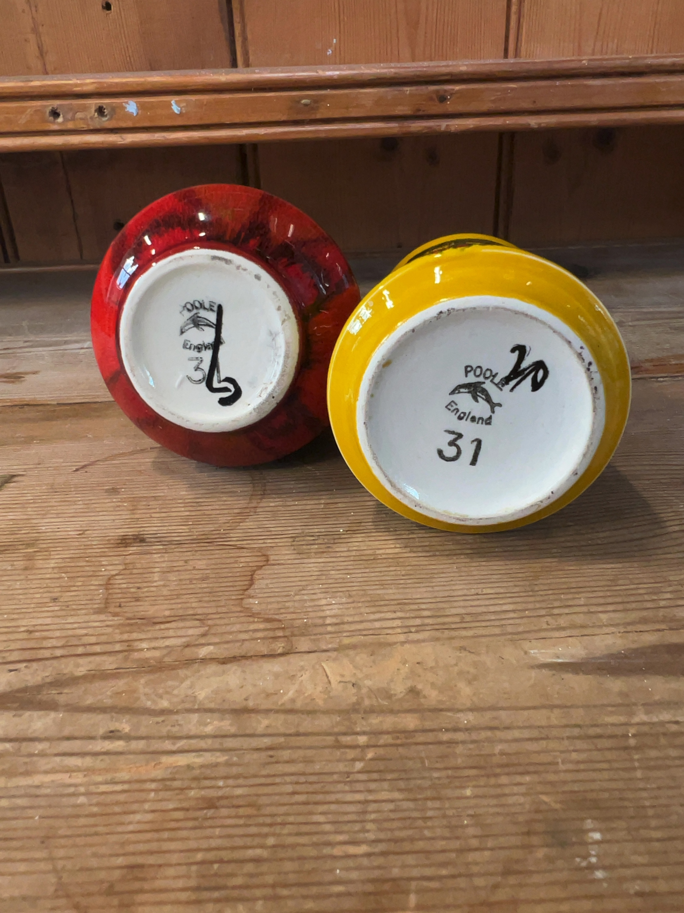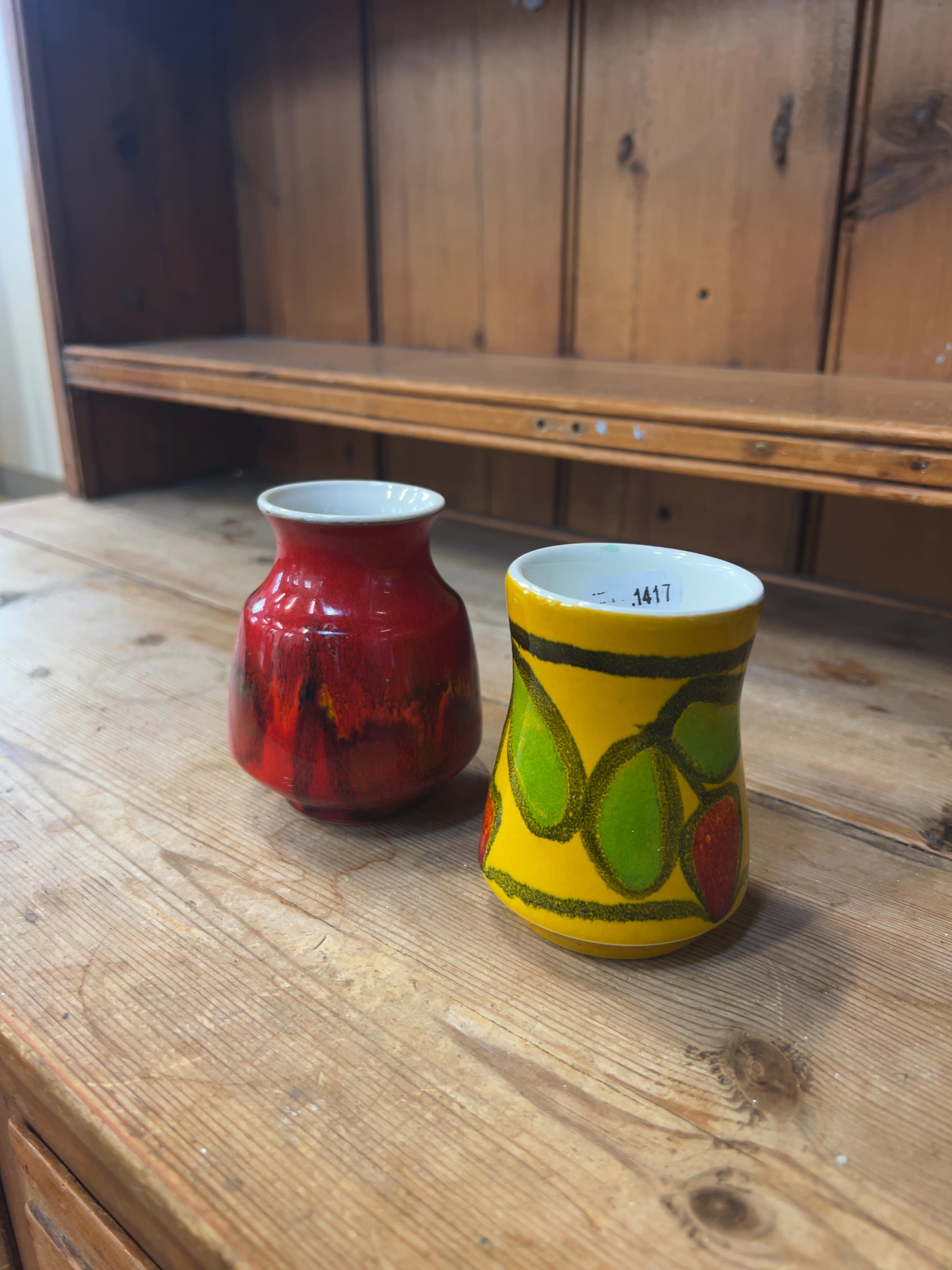 Both vases appear to be in good condition. There are no visible chips, cracks, or signs of restoration. Minor shelf wear is present on the unglazed foot rims. The yellow vase has a small paper auction label adhered to the interior rim.