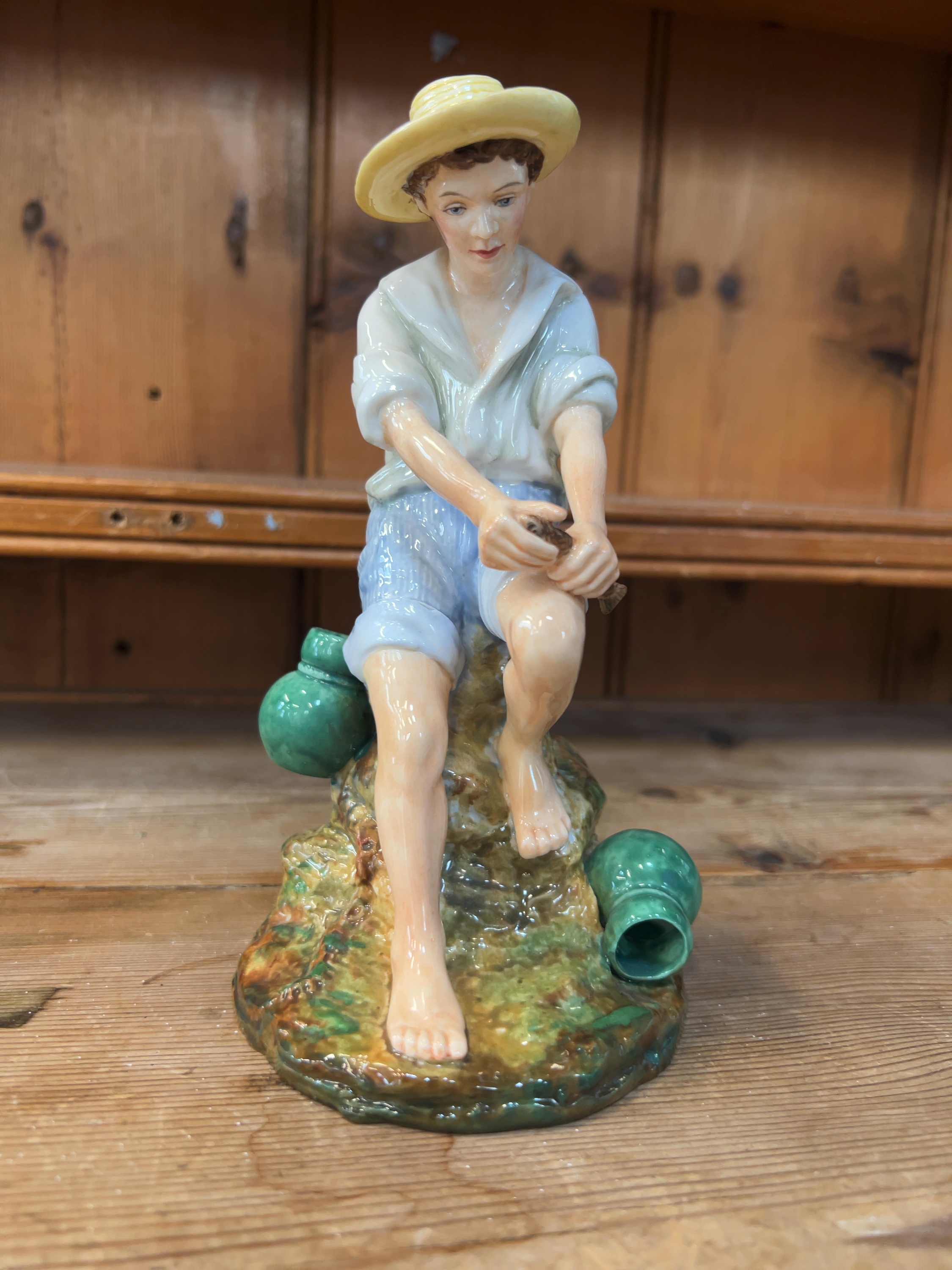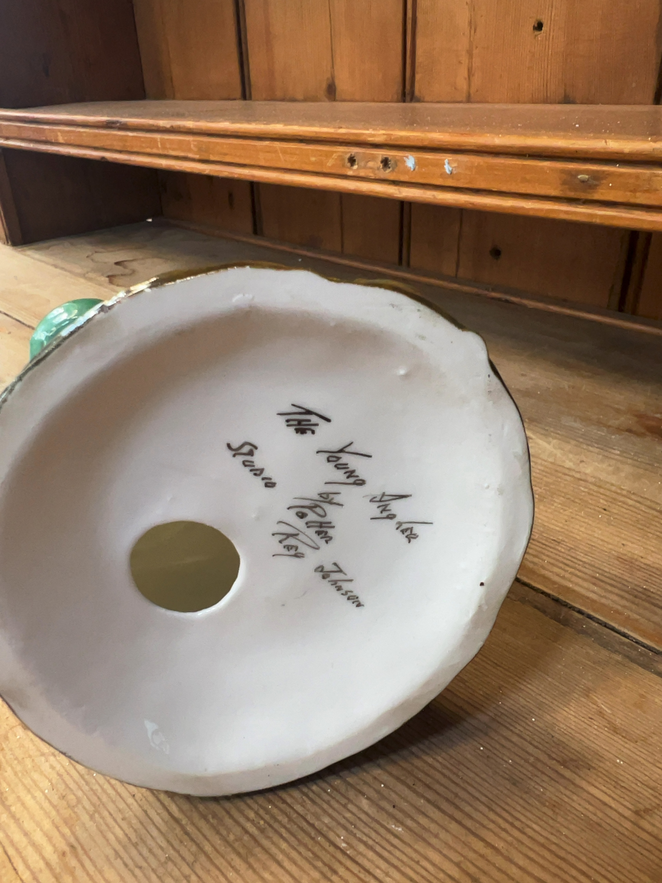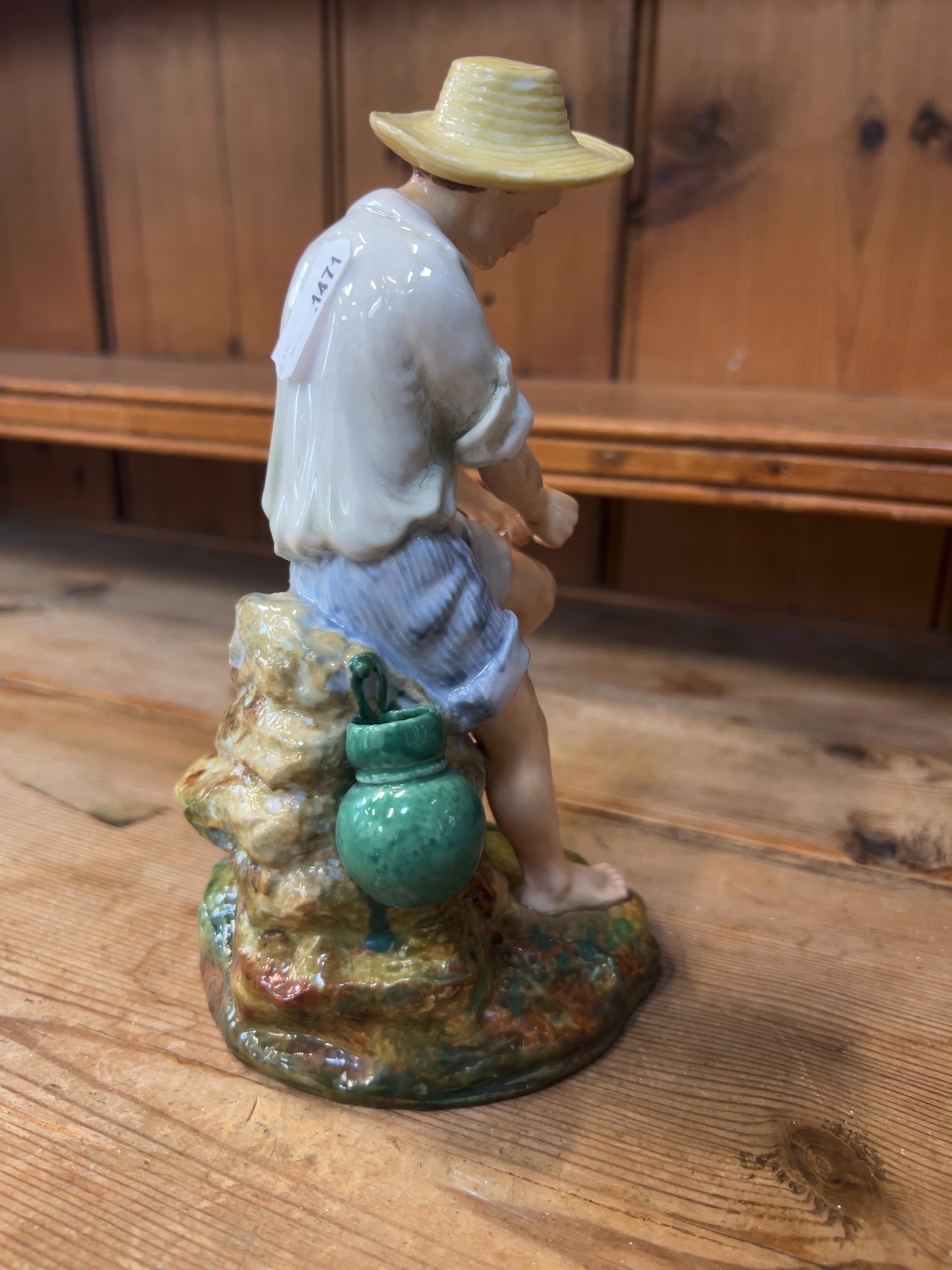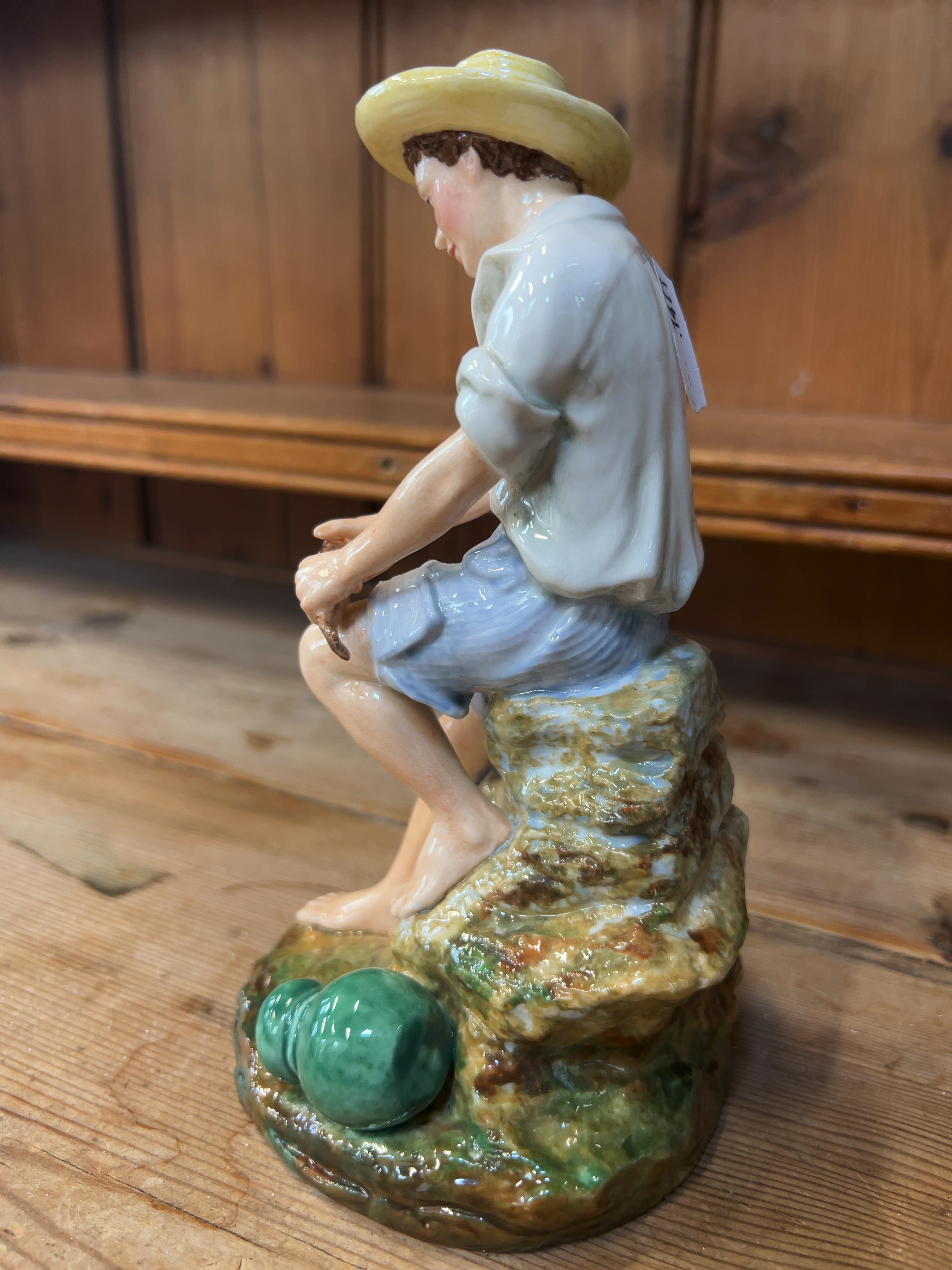 A glazed ceramic studio pottery figurine titled The Young Angler, produced by Reg Johnson. The underside of the base features a circular aperture and a handwritten inscription in black ink which reads: The Young Angler by Potter Studio Ray Johnson. The figurine is finished with a lustrous polychrome glaze.