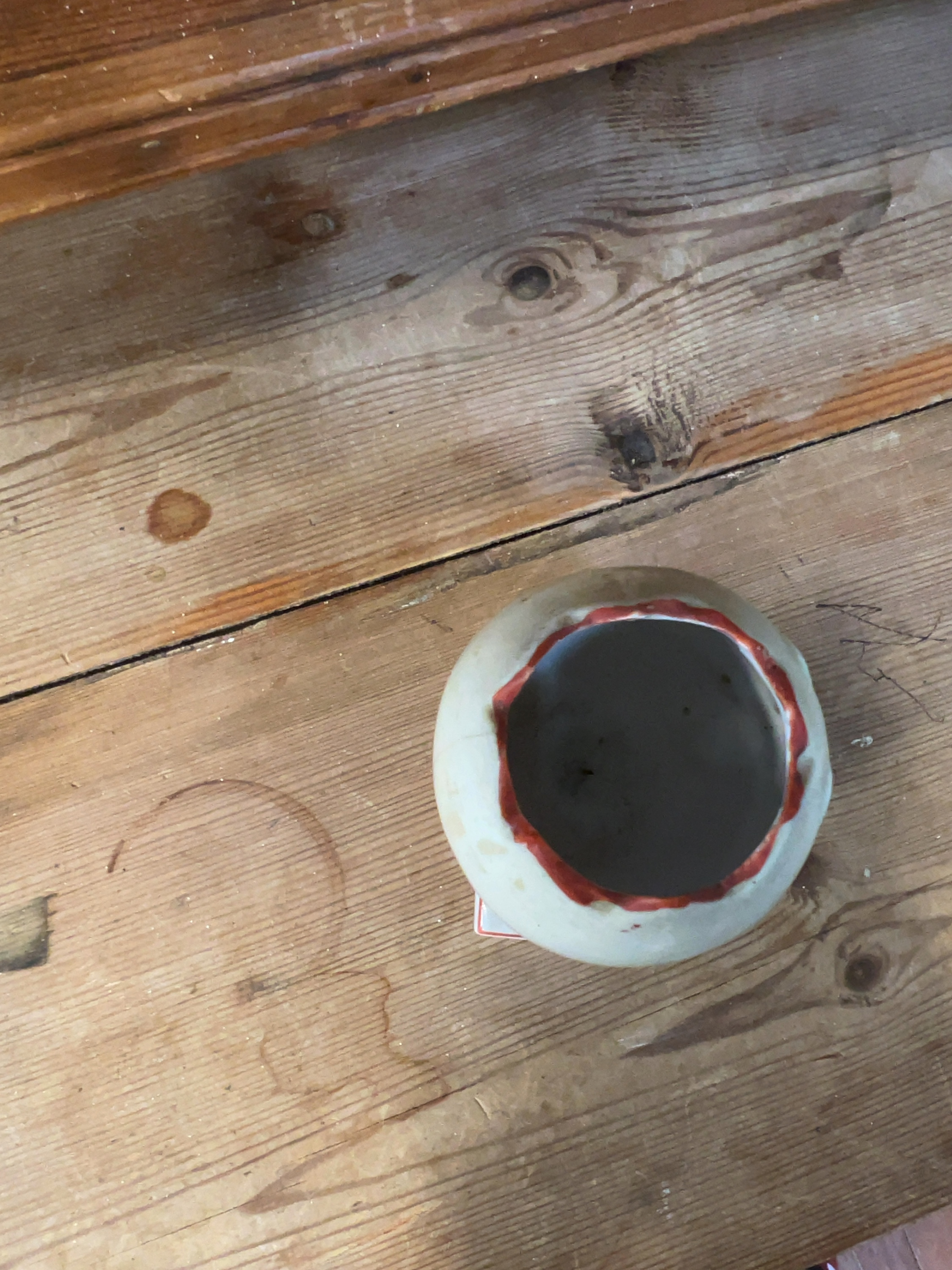 The item shows signs of age and significant wear. A prominent vertical hairline crack runs down the back of the egg-head from the rim. There is noticeable wear to the over-glaze polychrome decoration, particularly on the character\'s nose and around the jagged top rim. The piece exhibits fine surface crazing throughout and minor staining, especially to the underside of the base.