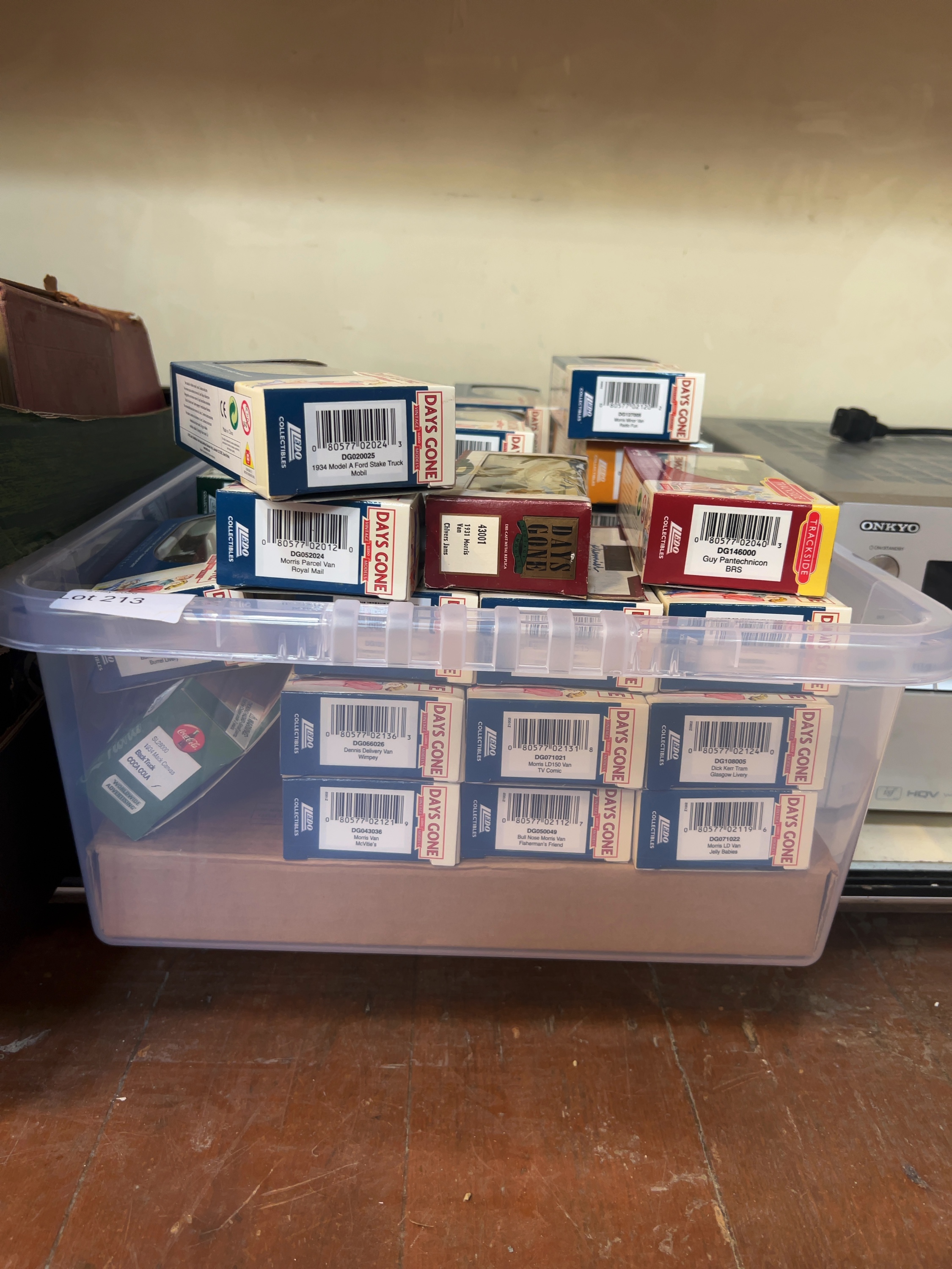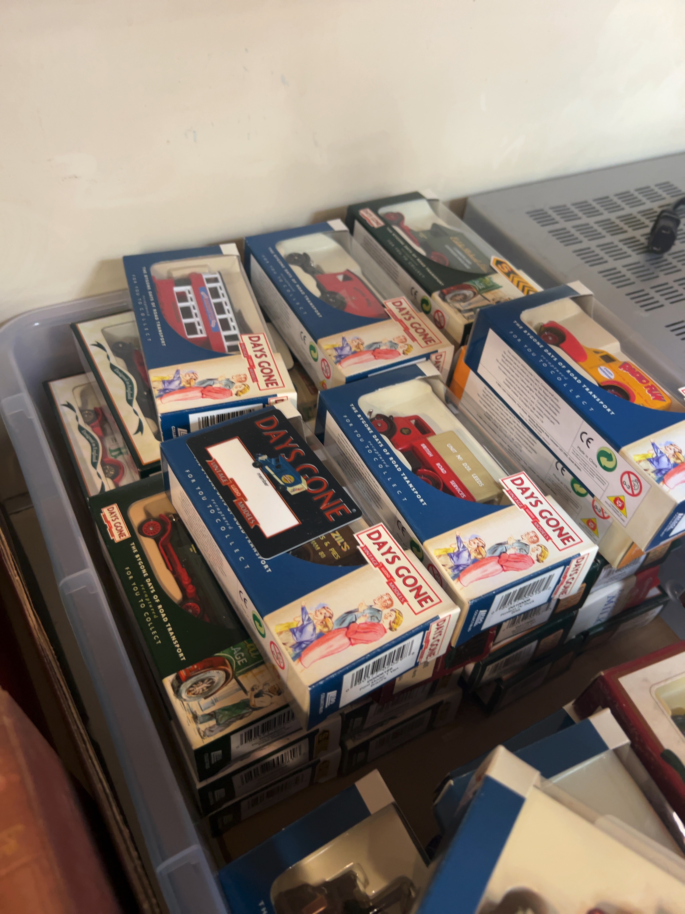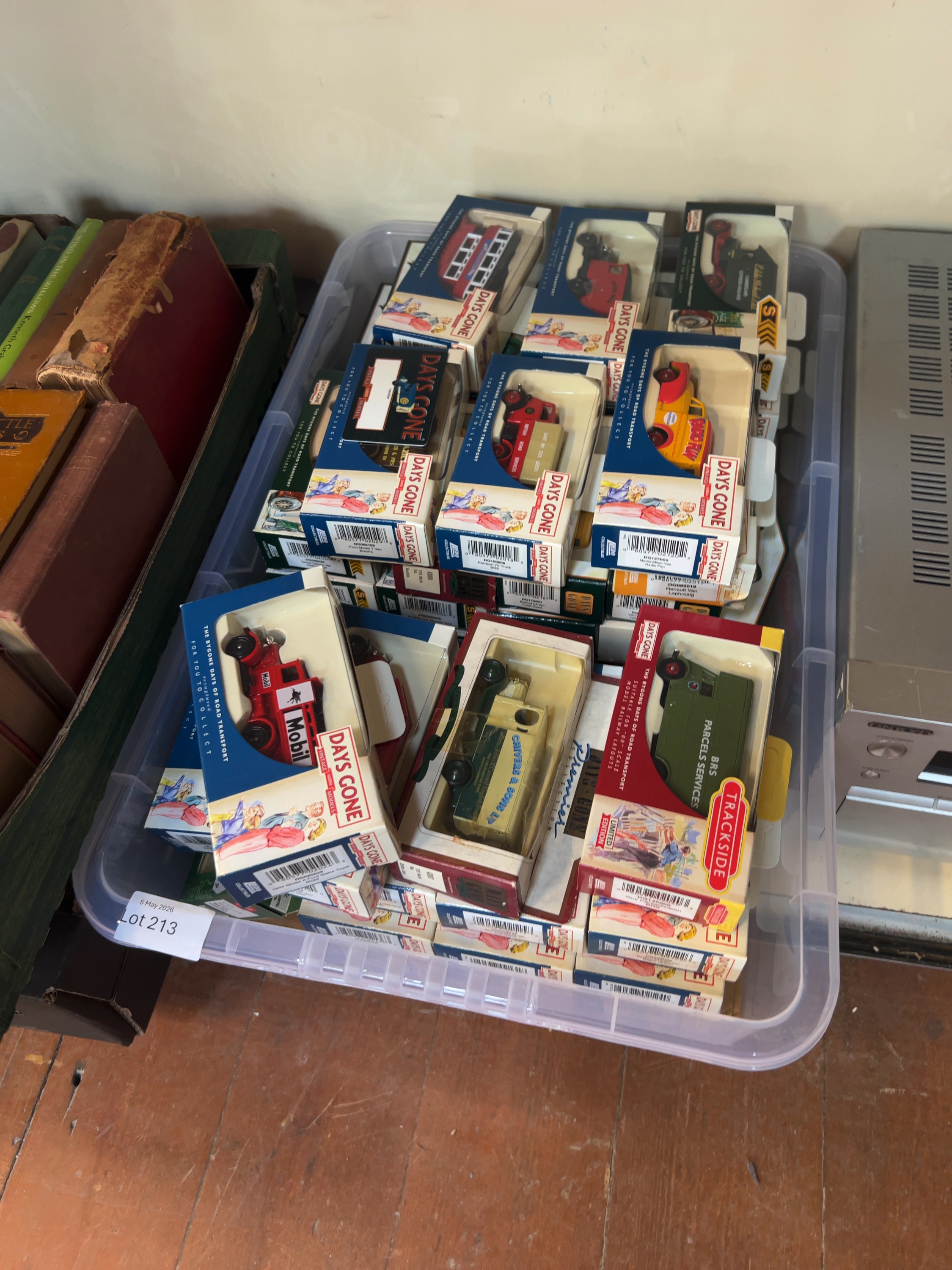 A large collection of die-cast model vehicles manufactured by Lledo, primarily from the Days Gone and Trackside series. The lot contains approximately 30+ vehicles representing various vintage commercial vans, trucks, and buses.