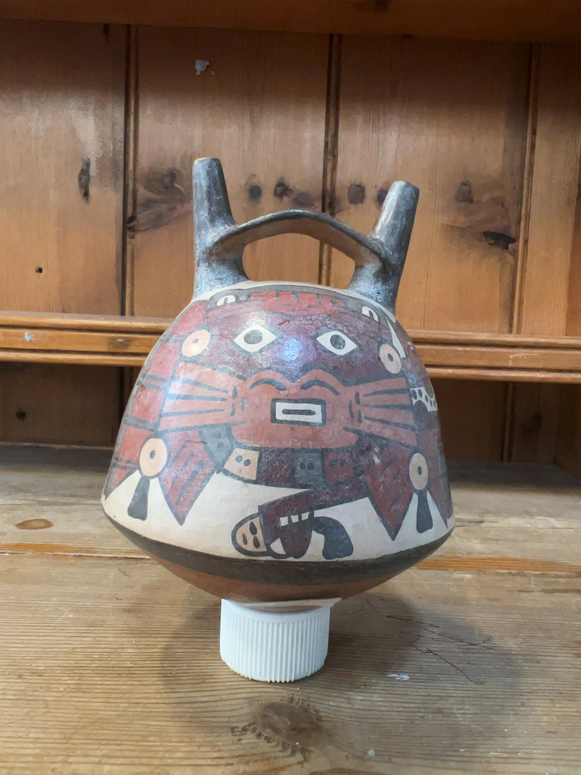 A polychrome ceramic vessel of the Nazca culture from the South Coast of Peru, dating to the Early Intermediate Period, circa 100 BCE to 800 CE. T; no maker’s marks or signatures are present on the artefact itself.