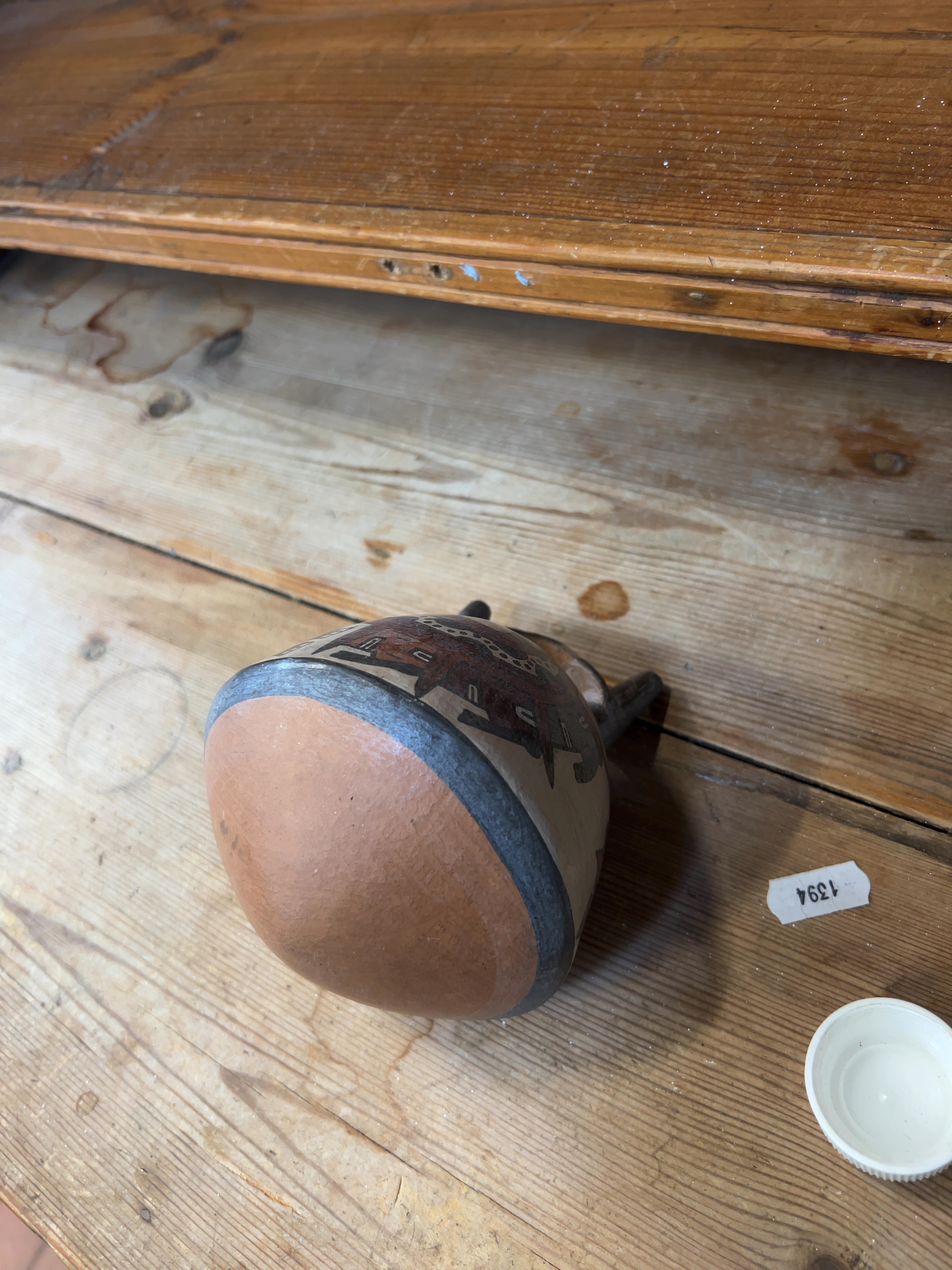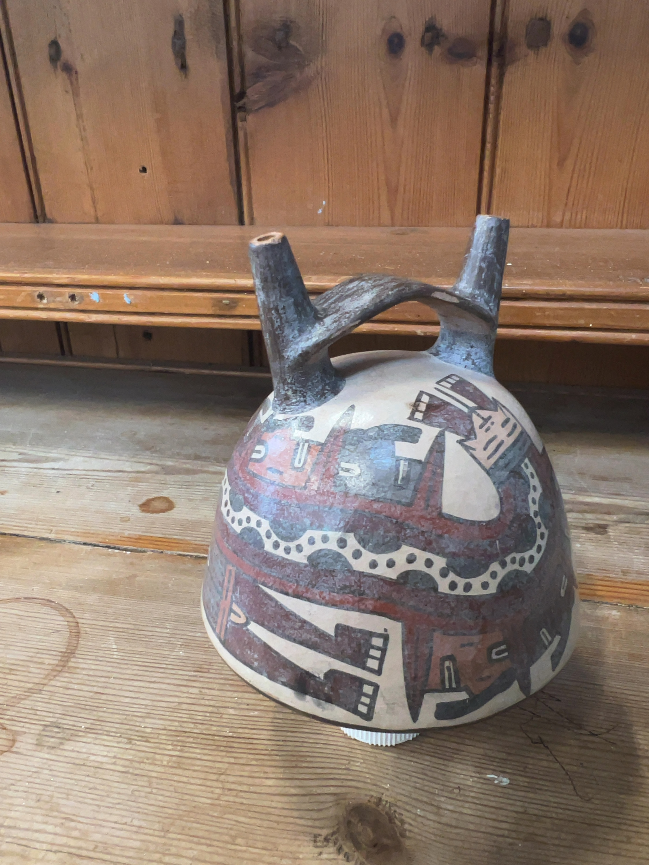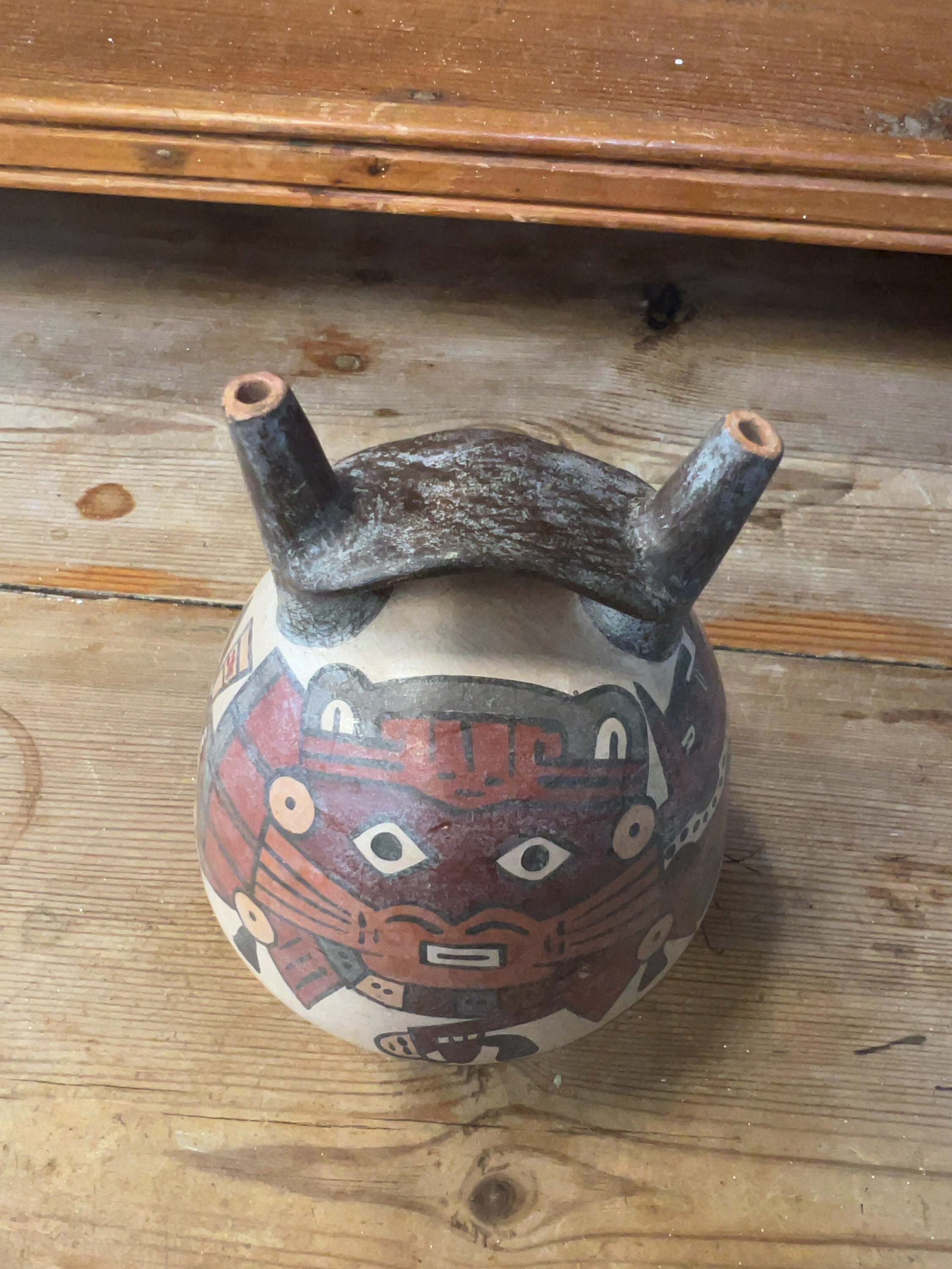 The vessel exhibits signs of wear consistent with archaeological material, including general surface pitting and areas of loss to the polychrome slip. The bridge handle and spouts appear to be intact but show a darker, possibly weathered finish. Professional hands-on inspection is recommended to determine if any restoration or overpainting has occurred.