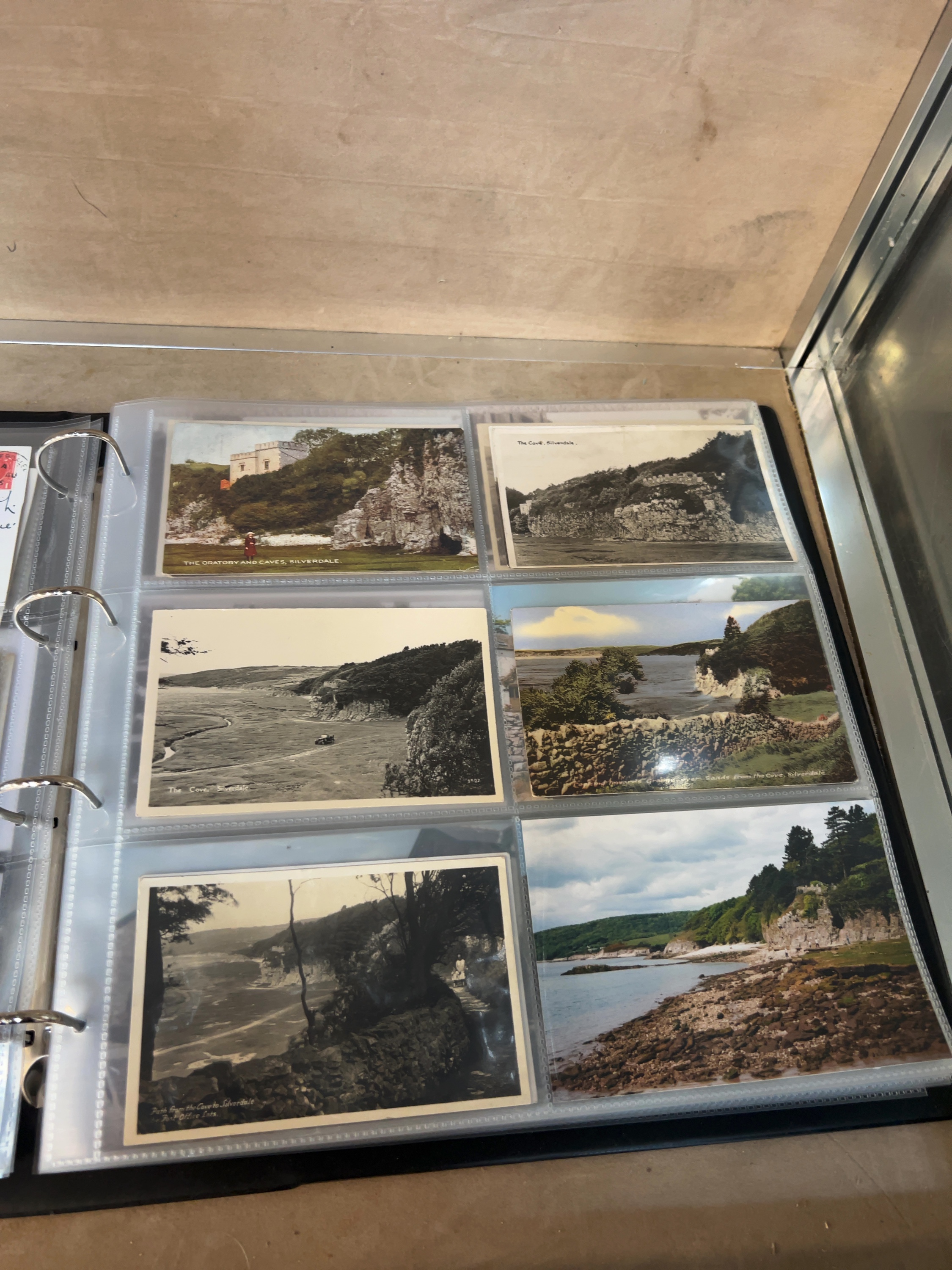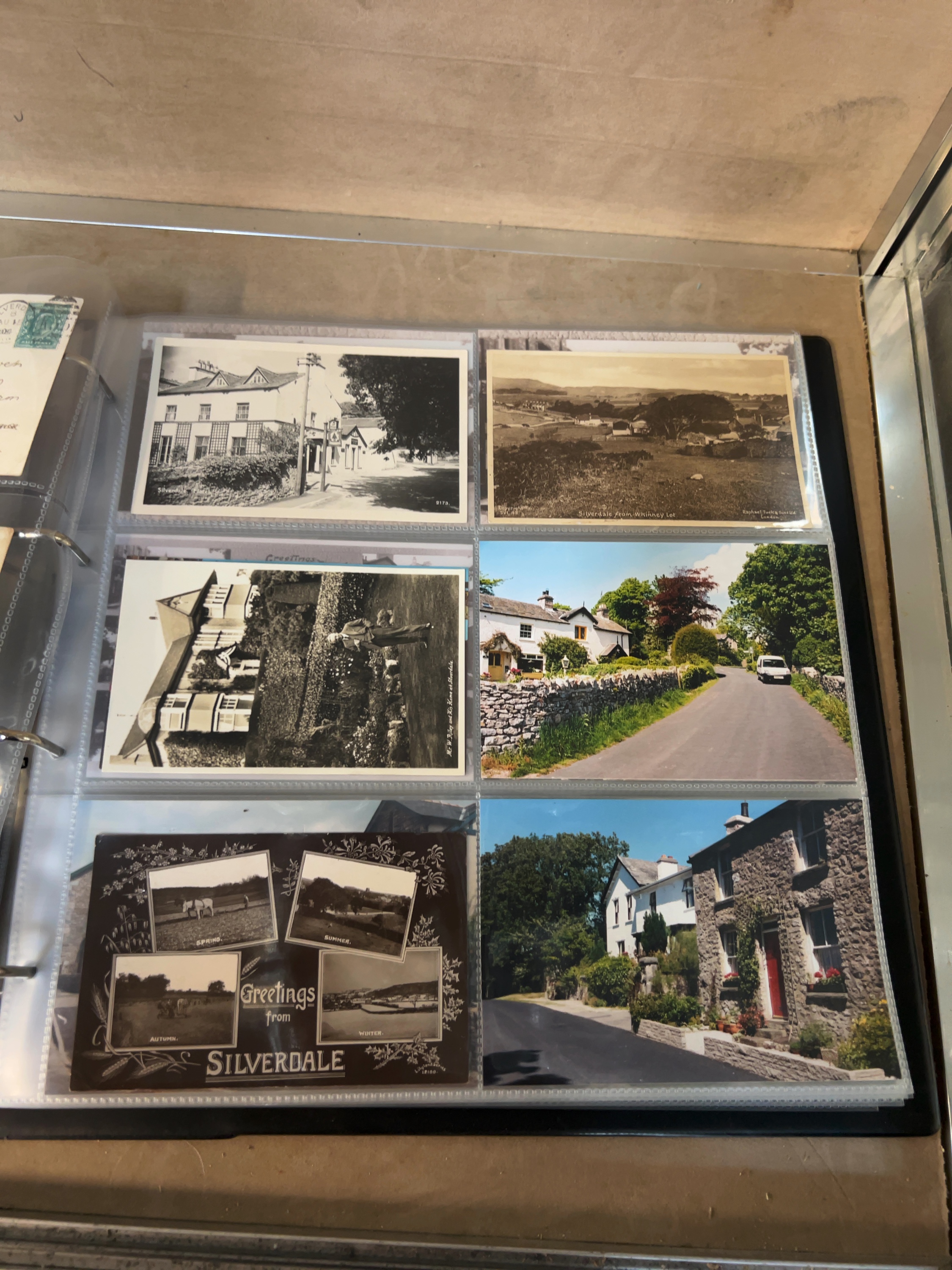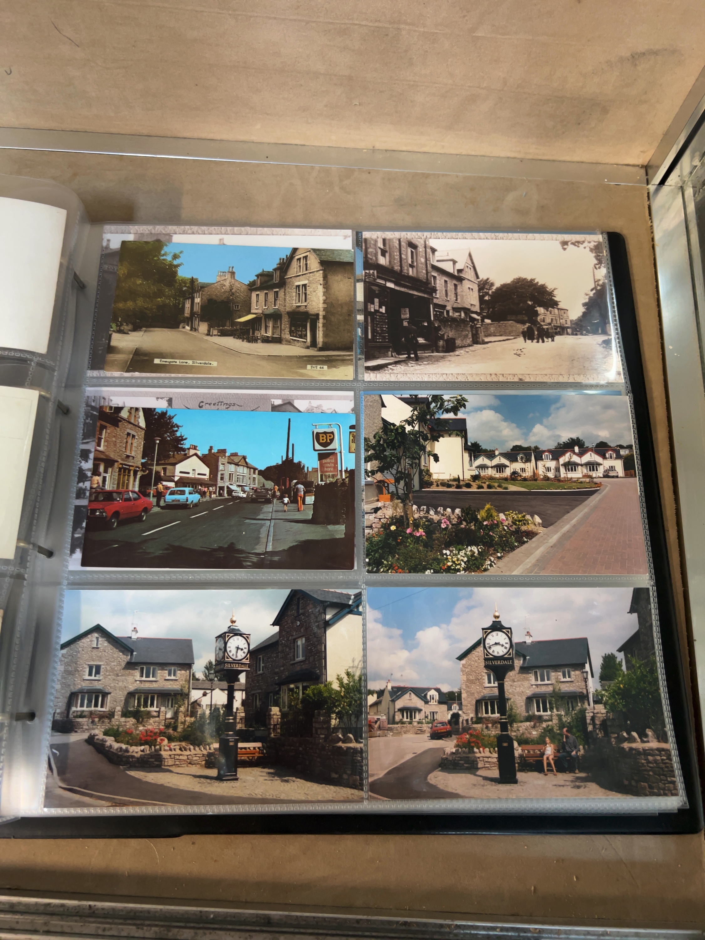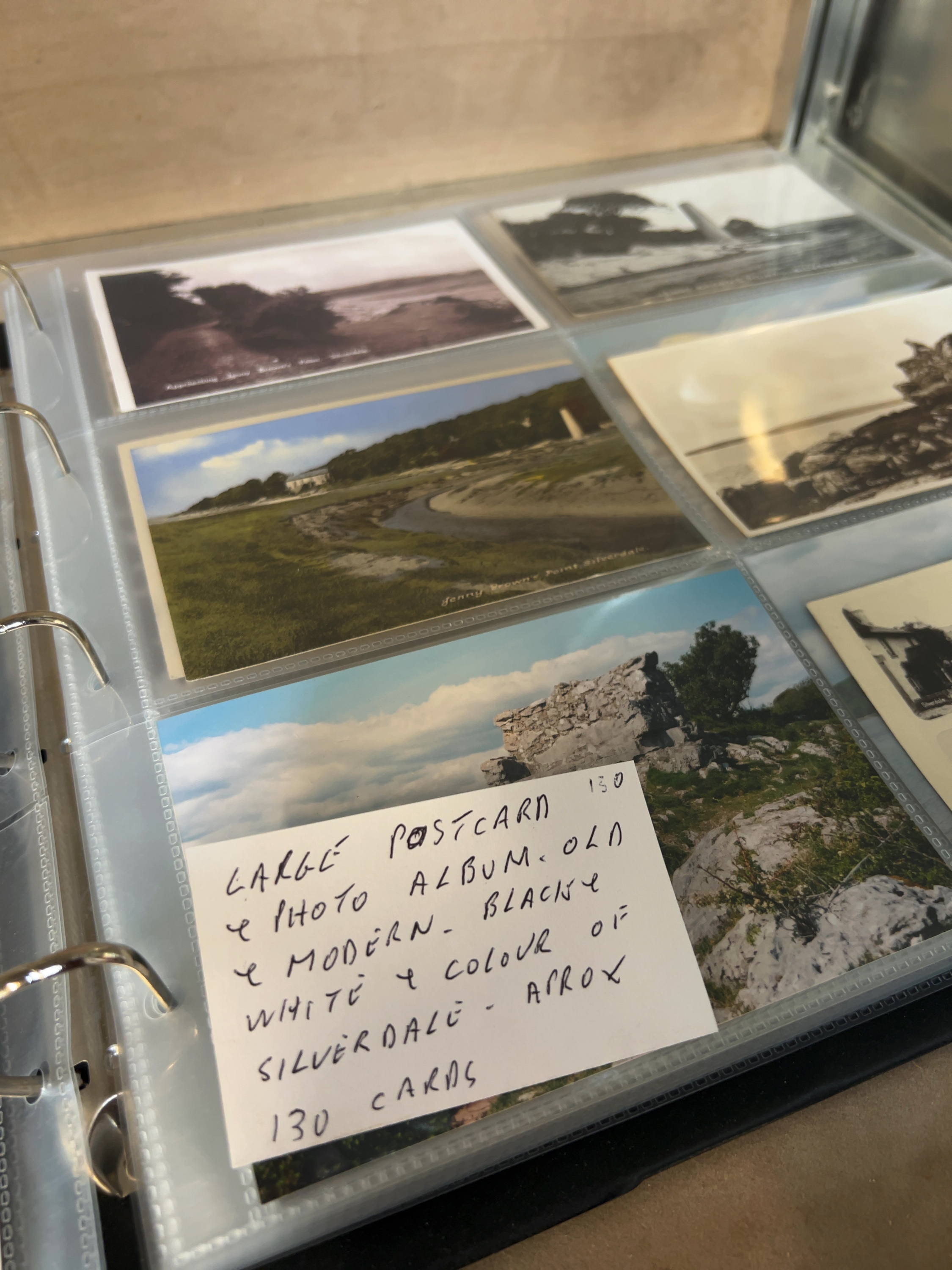 This lot comprises an extensive collection of topographical postcards focused on the village and coastal area of Silverdale, Lancashire. The collection contains approximately 130 cards, spanning from the early 20th century to more modern eras. A handwritten vendor note is included, identifying the contents as approximately 130 cards of Silverdale in black and white and colour.