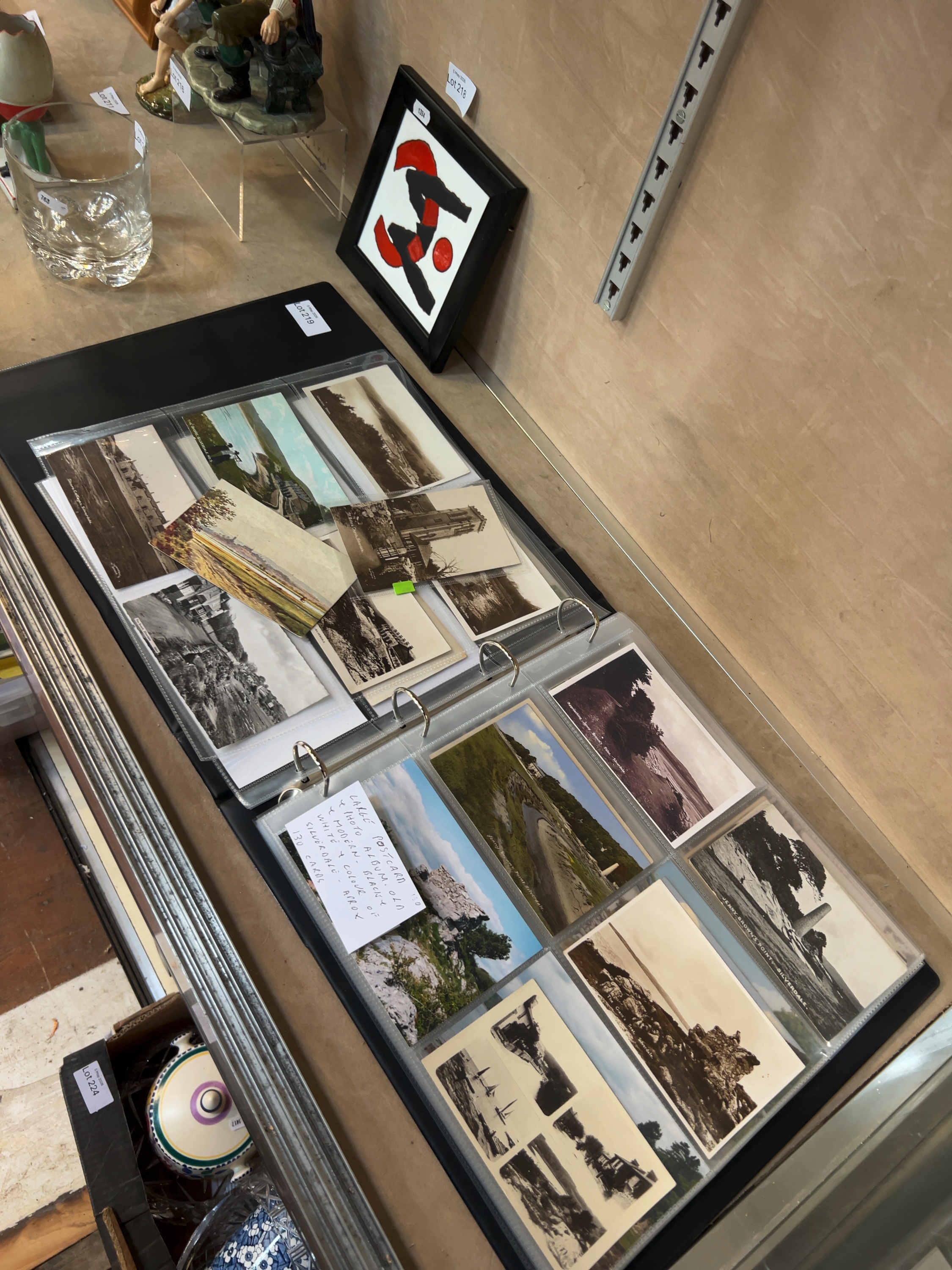 The collection is in generally good condition. Individual cards show a typical range of wear consistent with age, including light foxing, edge tanning, and minor corner bumping on early 20th-century examples. The lot includes both postally used cards with stamps and correspondence, and unused examples. The modern album and sleeves are in good functional condition.