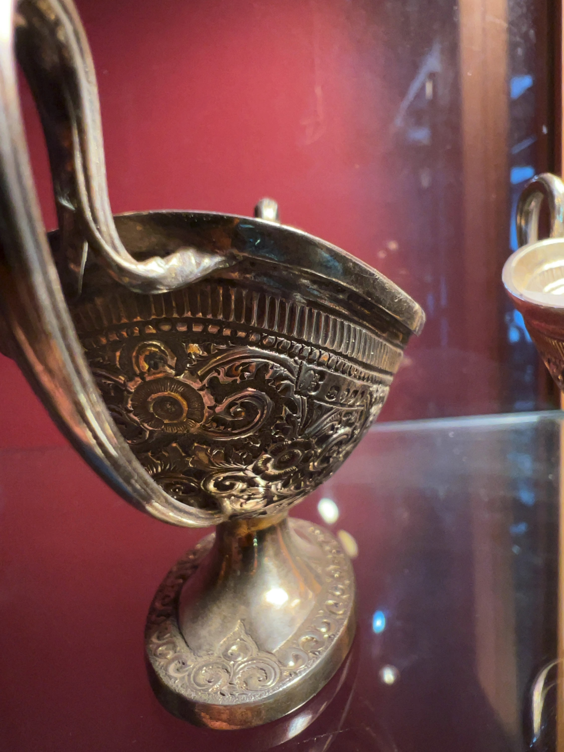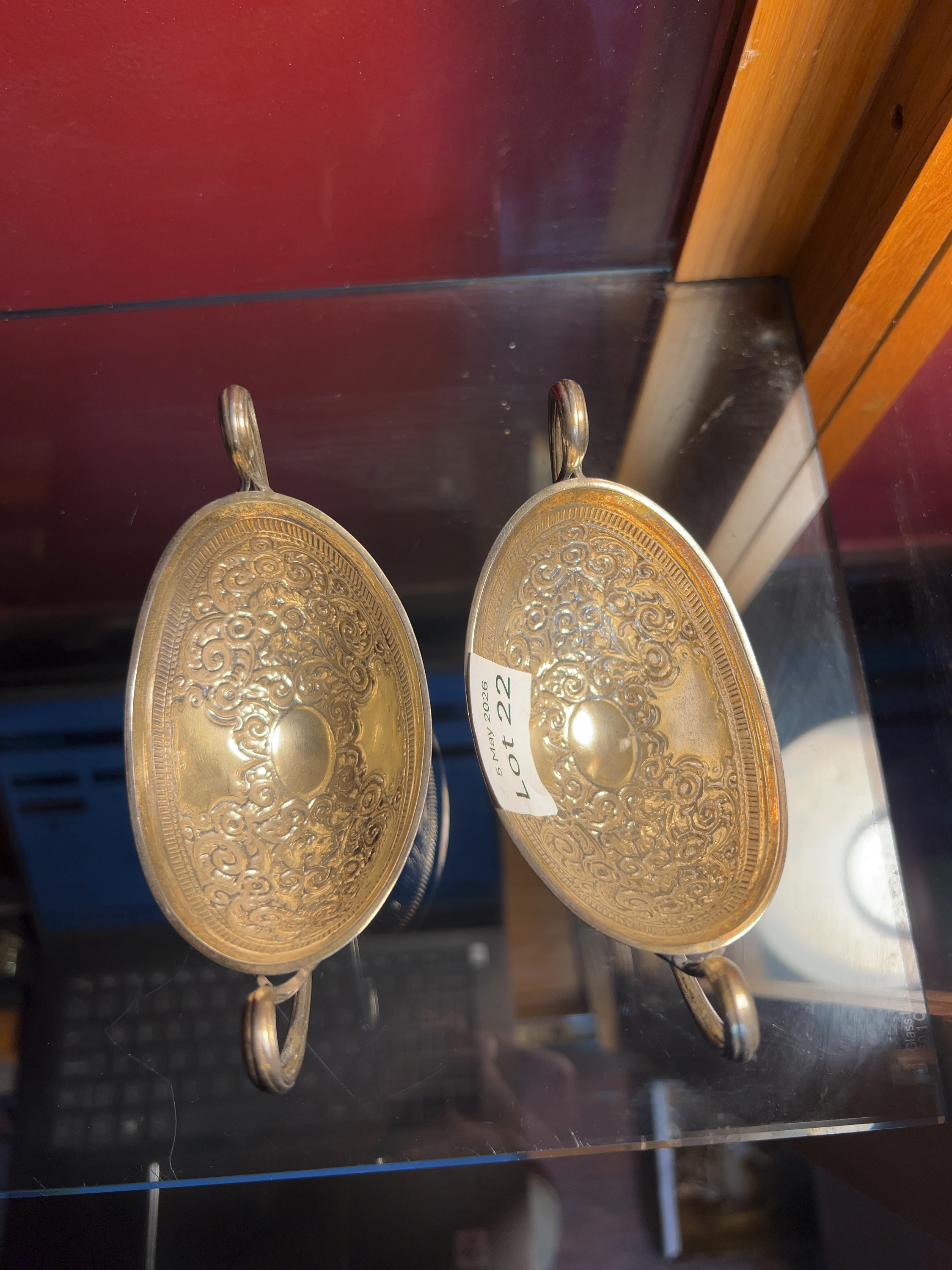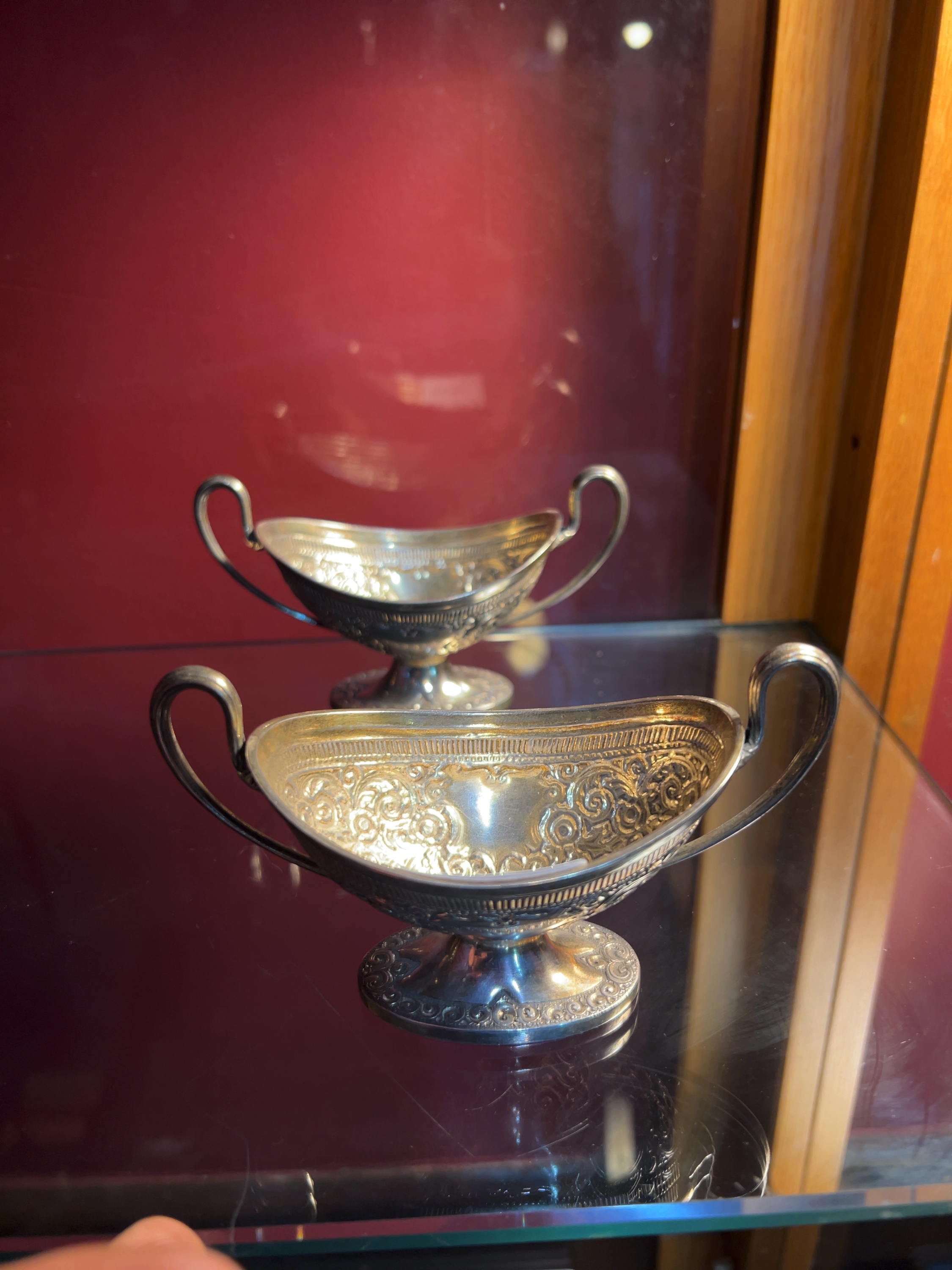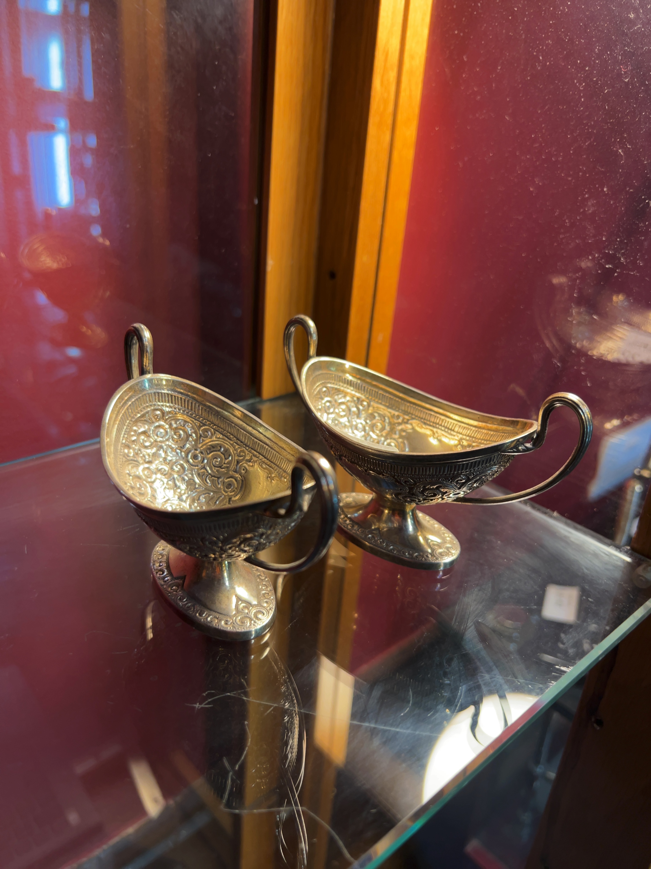 Both dishes are in good antique condition with surface tarnish and light wear commensurate with age and use. The interior surfaces show remnants of possible original gilding. No major distortions or repairs are evident.
