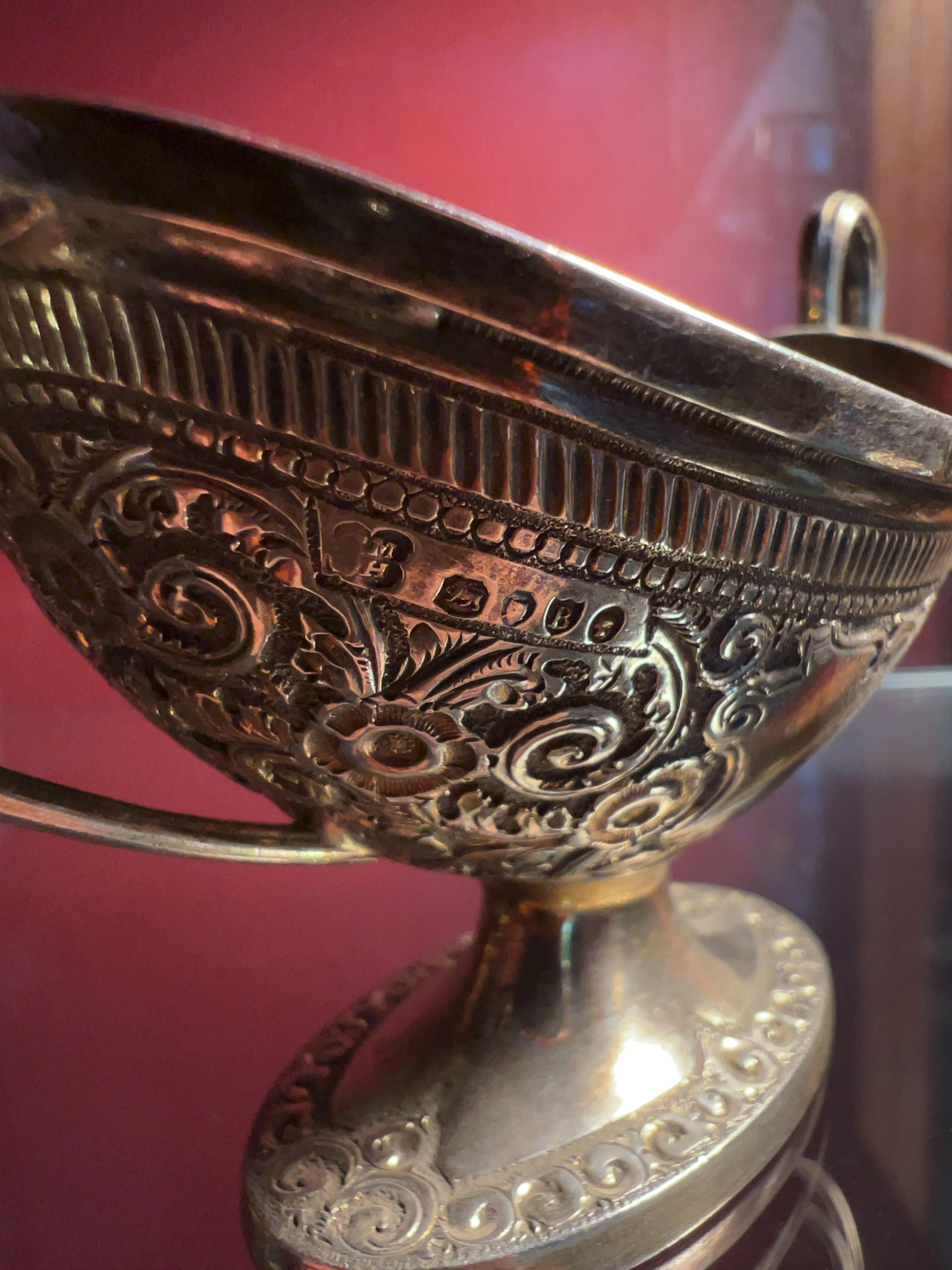 A pair of Edwardian sterling silver twin-handled dishes by Britton, Hill & Co, Birmingham 1901. These small footed dishes are of oval boat-shaped form and feature ornate chased and repoussé decoration. The decorative scheme consists of dense scrolling foliage and flower heads set against a stippled ground, framed by a gadrooned and pellet-moulded rim. Each vessel is raised on an oval pedestal foot with matching embossed ornamentation and is flanked by two high-arched, swept handles. The hallmarks are located on the upper body near the rim and include the maker mark B over H for Britton, Hill & Co, the lion passant for sterling silver, the anchor for the Birmingham assay office, and the date letter b for the year 1901.