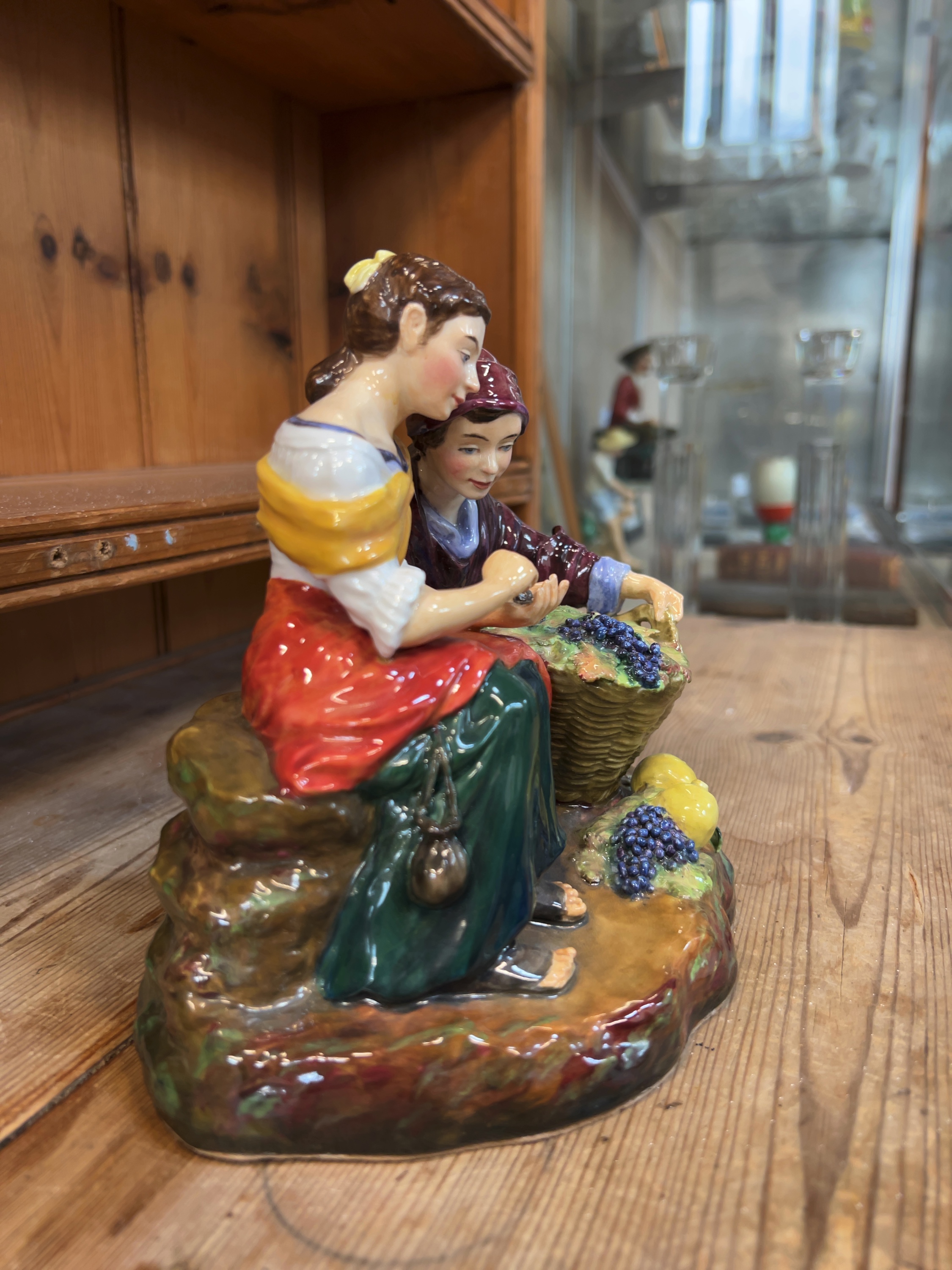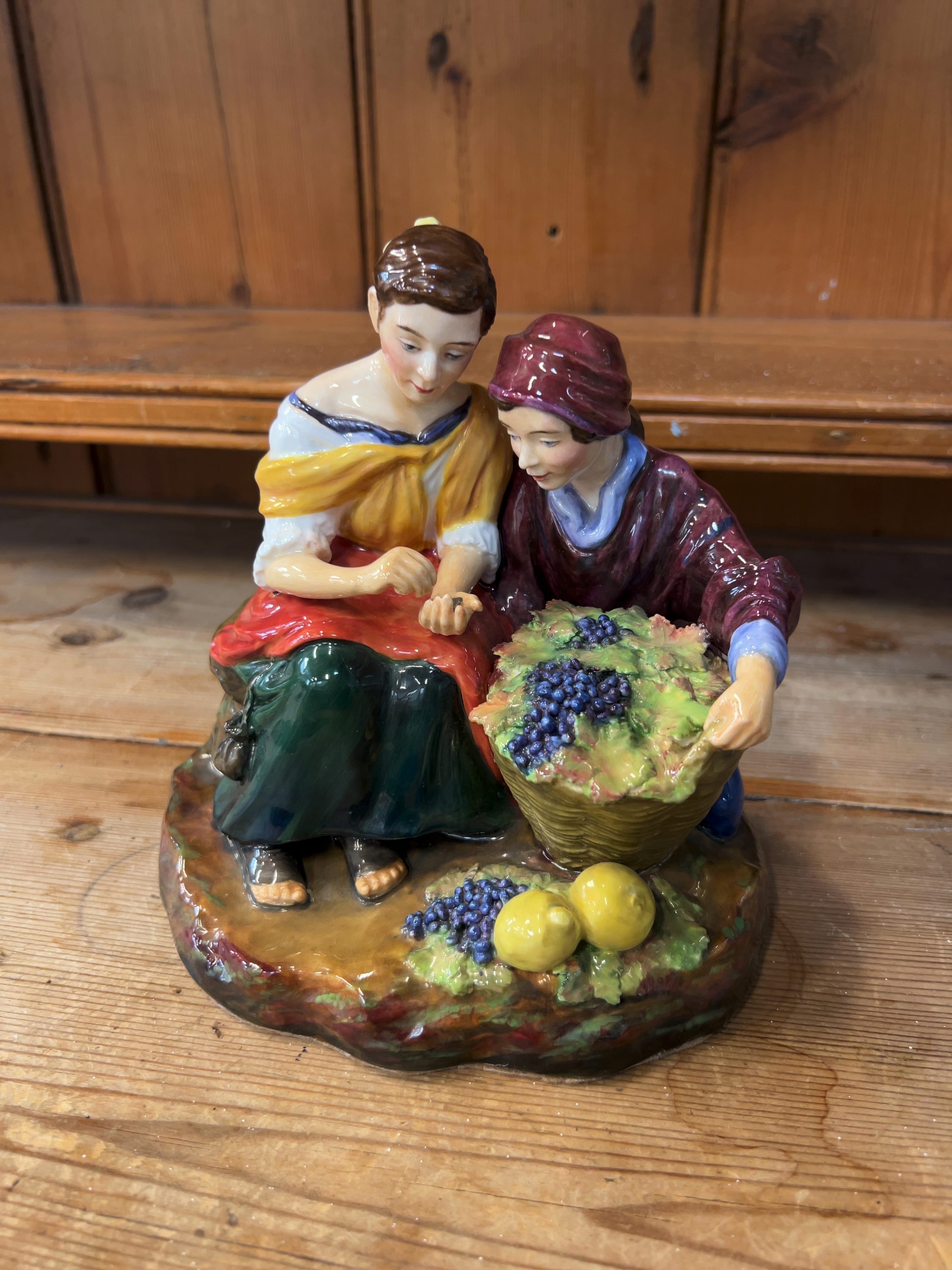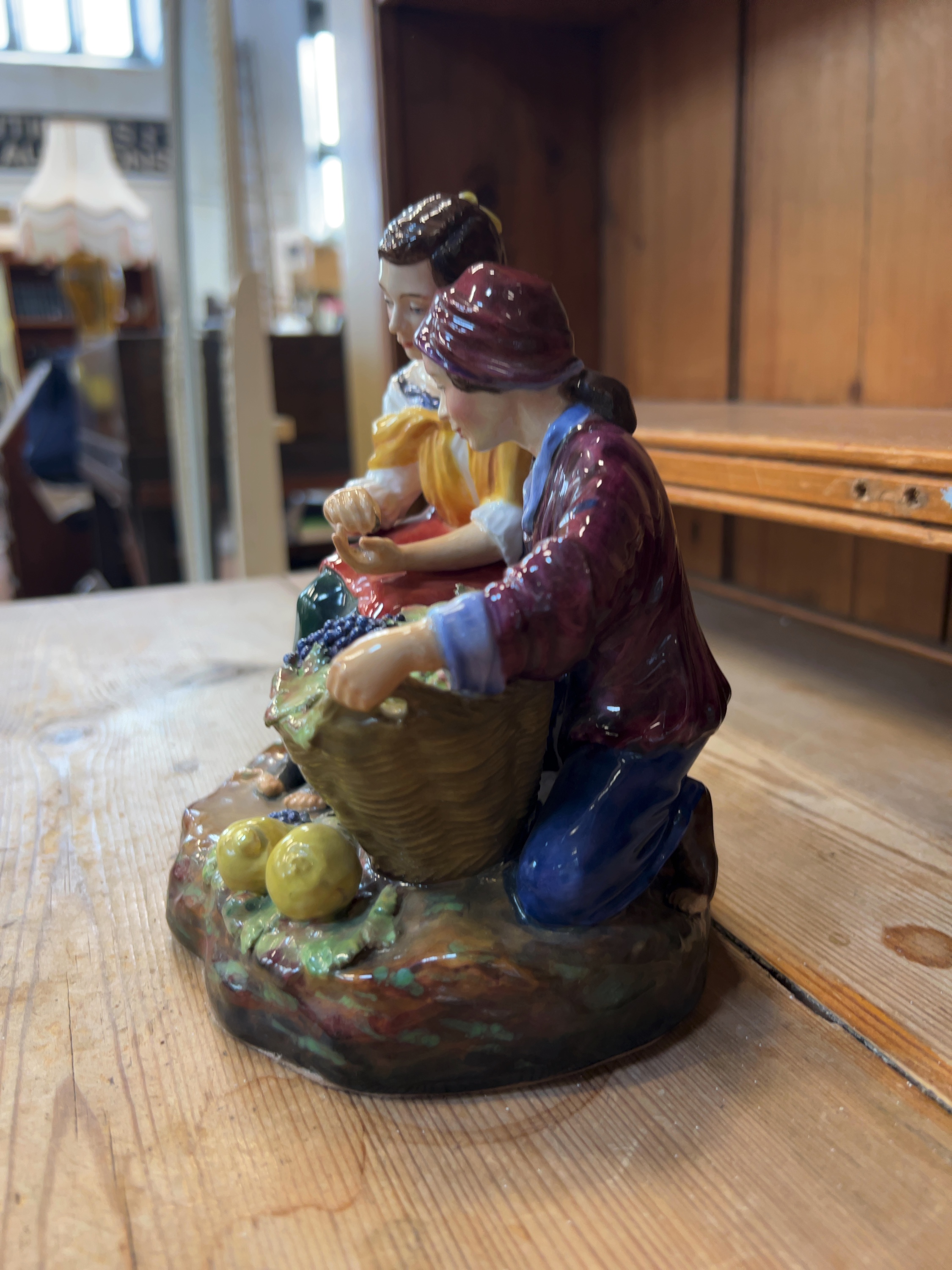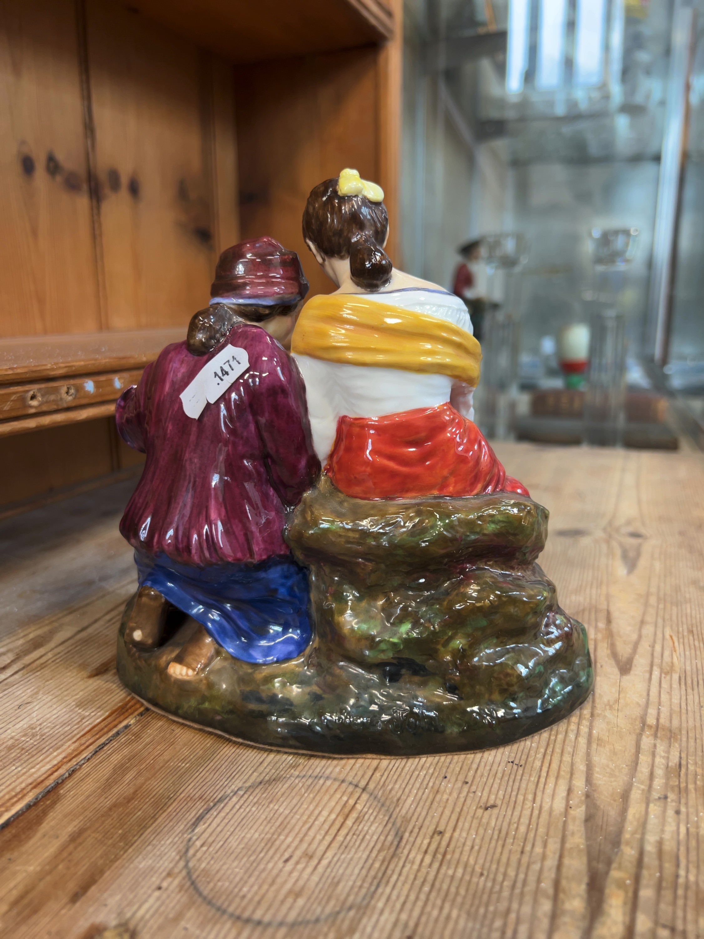 The figurine is in good overall condition with no visible chips, cracks, or repairs. The polychrome glaze remains bright and well-preserved. There is a small adhesive lot tag numbered 1471 attached to the back of the kneeling figure. The base is fitted with a brown felt protector.