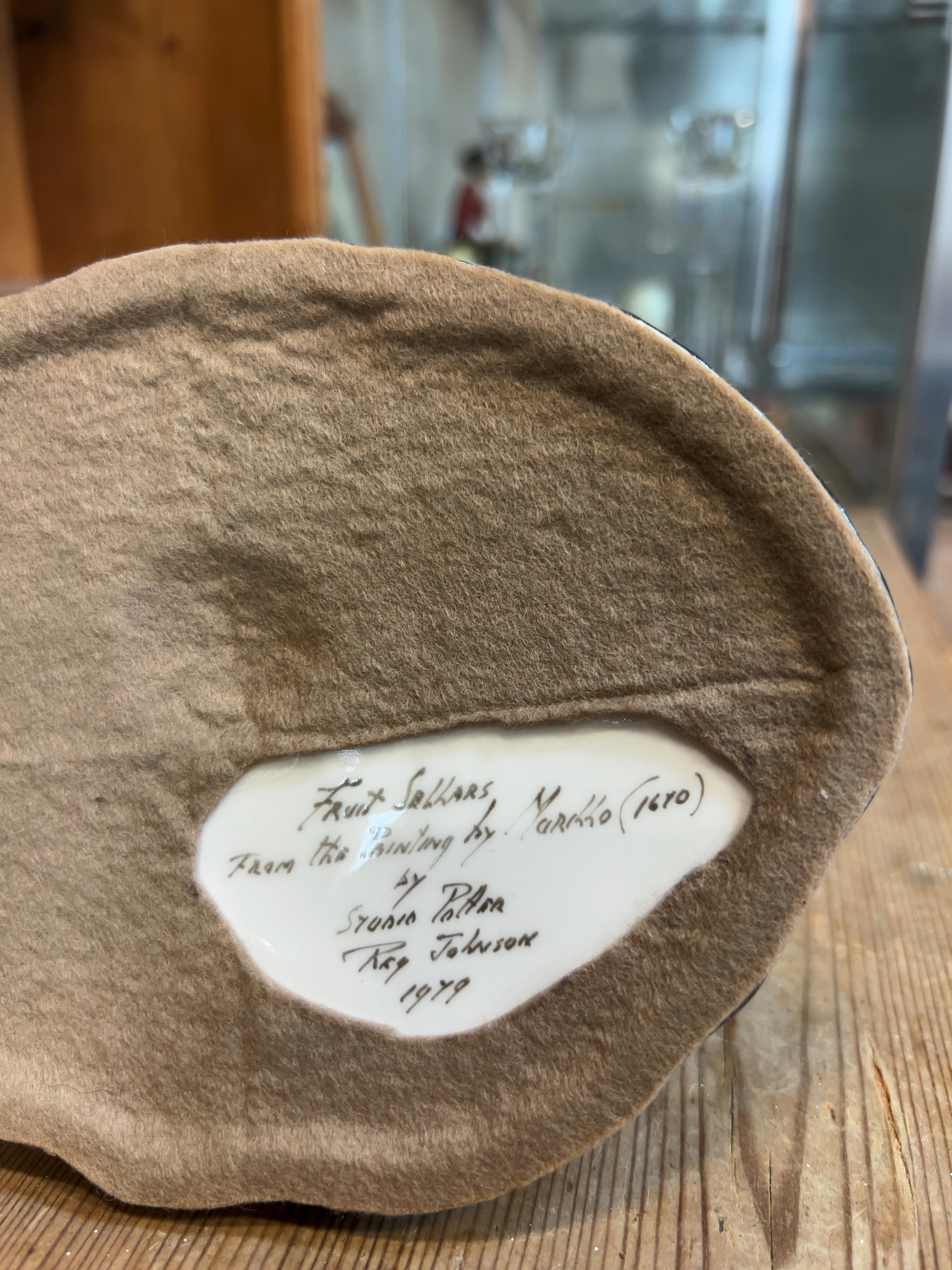 A studio pottery ceramic figurine titled Fruit Sellers, created by Reg Johnson in 1979. The piece is a three-dimensional interpretation of the 1670 genre painting by Spanish Baroque artist Bartolomé Esteban Murillo. The base features a protective brown felt pad with a cutout revealing a handwritten inscription on the ceramic body which reads: Fruit Sellers, From the Painting by Murillo (1670), by Studio Potter, Reg Johnson, 1979.