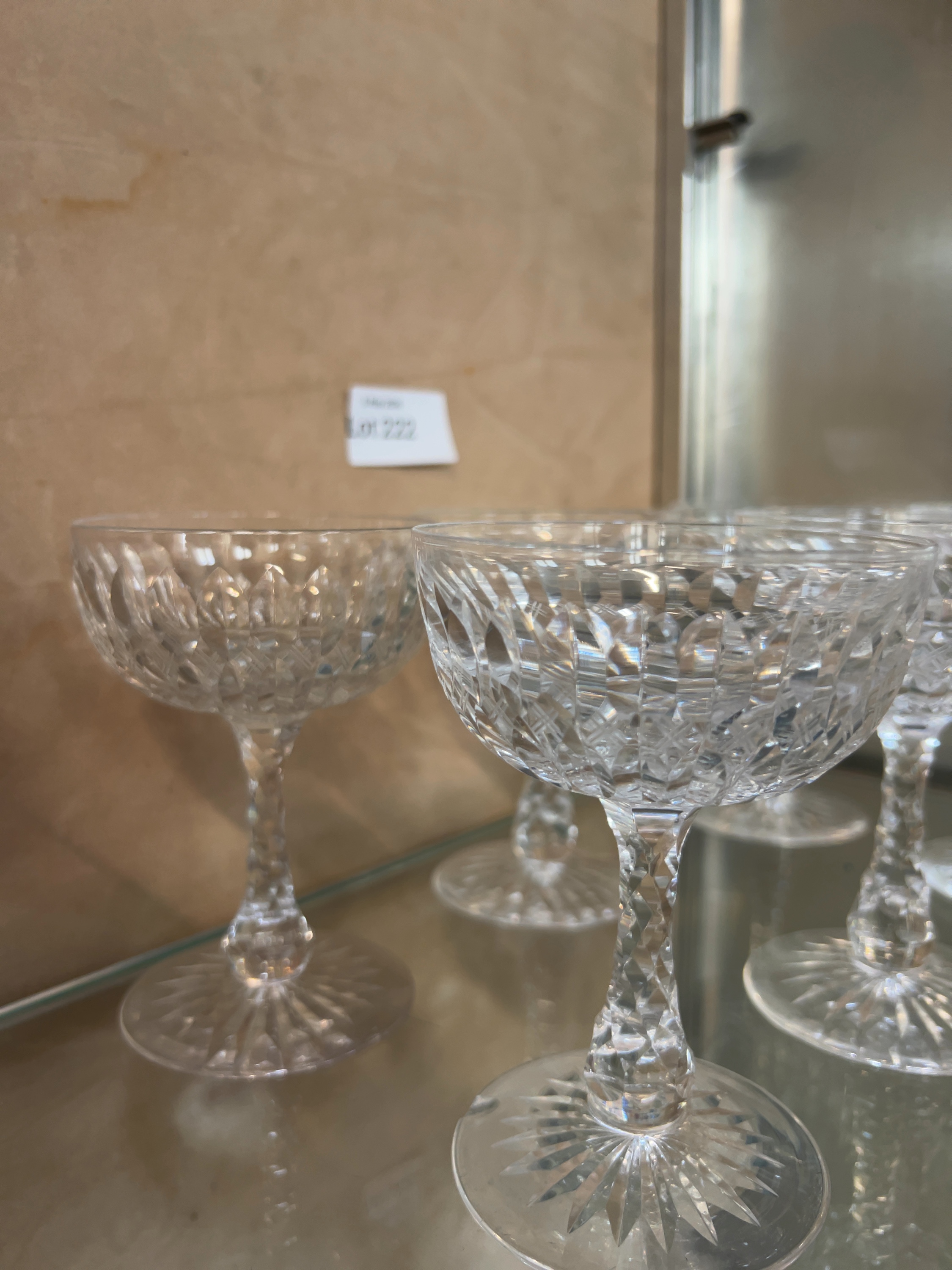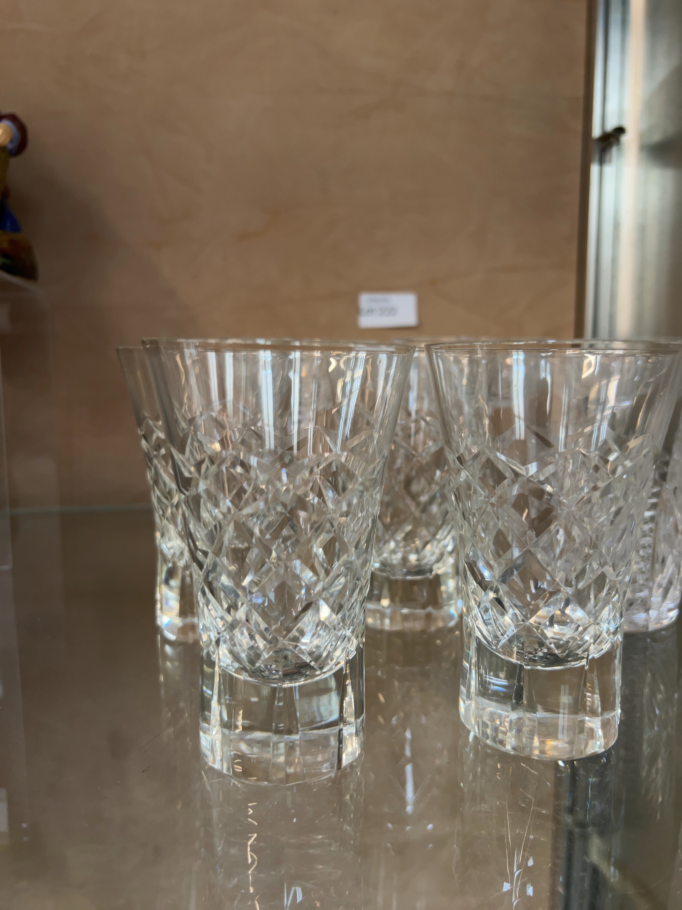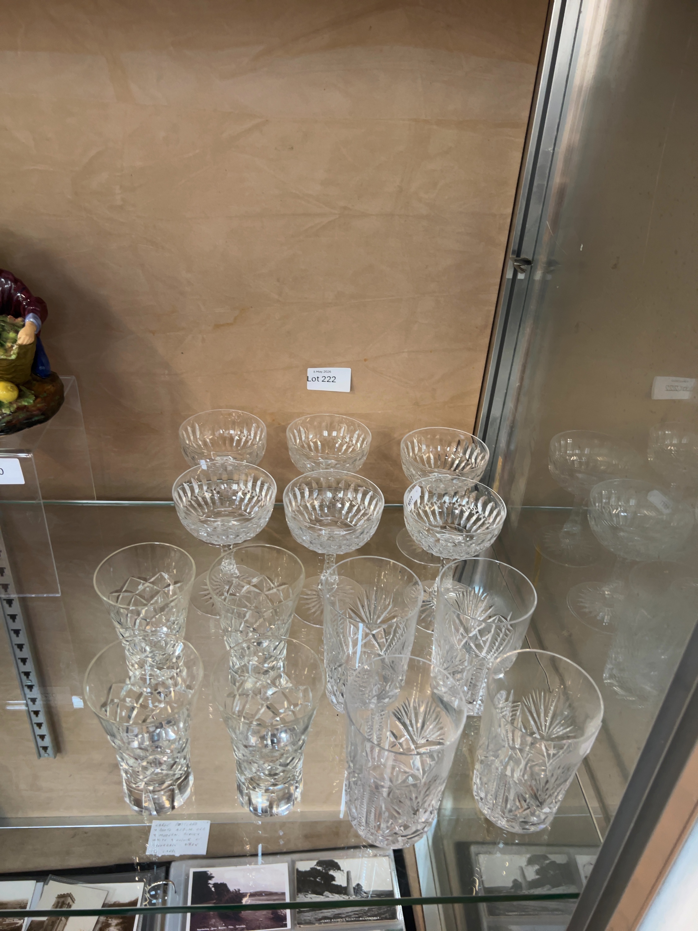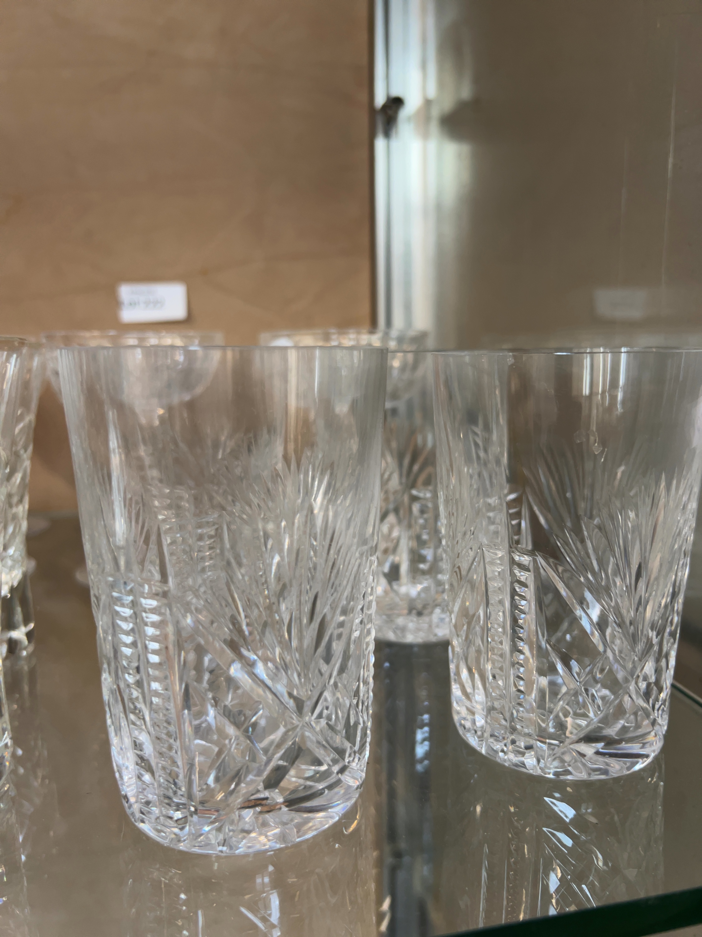 This collection consists of fourteen pieces of high-quality cut lead crystal glassware, comprising three distinct sets. The group includes six stemmed champagne or coupe glasses, each featuring a bowl decorated with a dense diamond-cut pattern, a multi-faceted stem, and a circular foot finished with a star-cut base. Also included are four tall highball tumblers decorated with a pattern of upright fanned cuts above a band of diamond cross-hatching separated by horizontal lines, a design characteristic of the Waterford Lismore pattern. The final set comprises four small spirit glasses with heavy bases, featuring an all-over deep diamond-cut harlequin pattern and a faceted lower section. While a handwritten card in the display mentions Waterford, no etched maker’s marks or labels are visible in the provided images, and the items are therefore catalogued as being in the style of Waterford. The glassware is of significant weight and clarity, consistent with premium 20th-century lead crystal production.