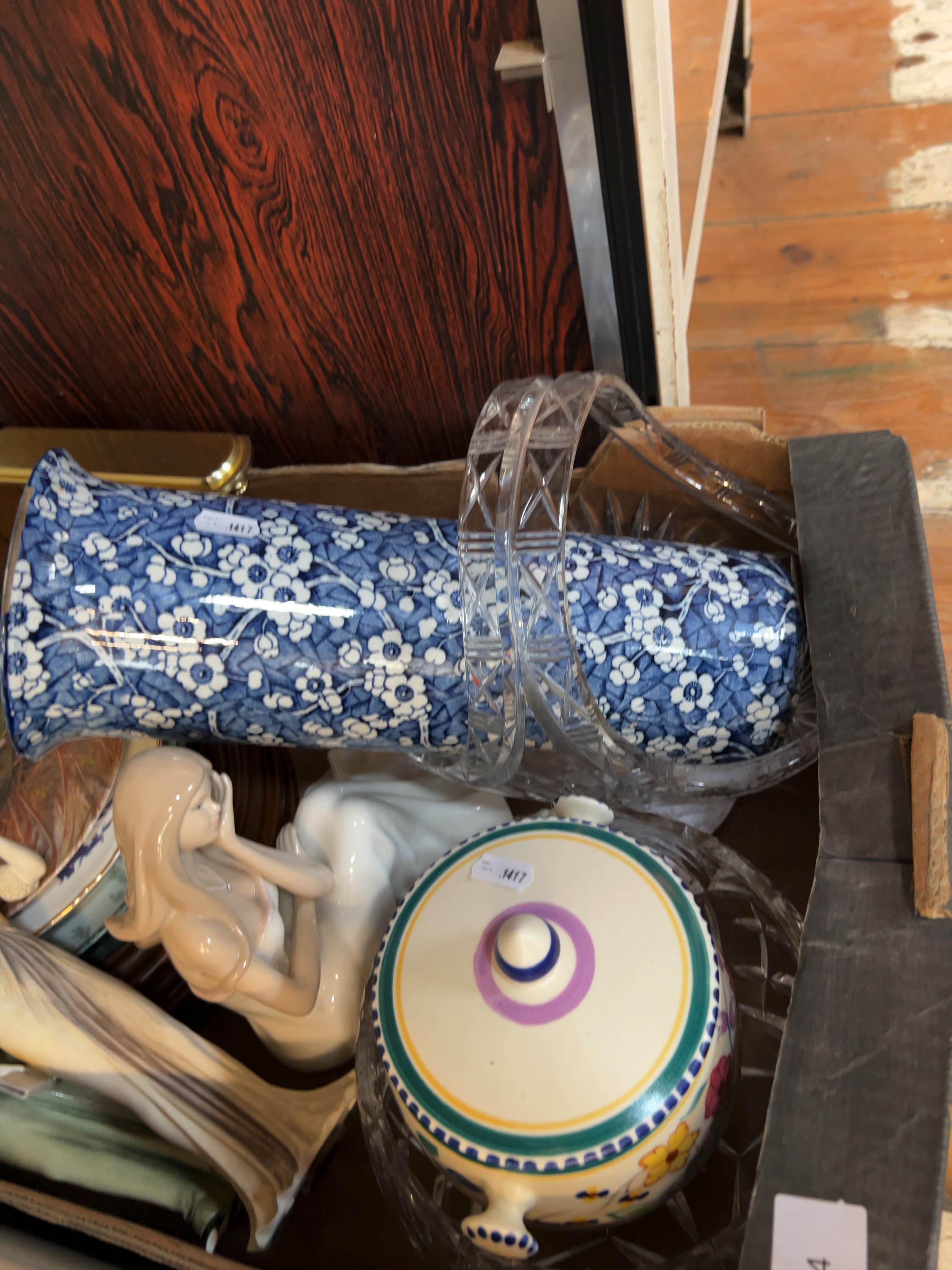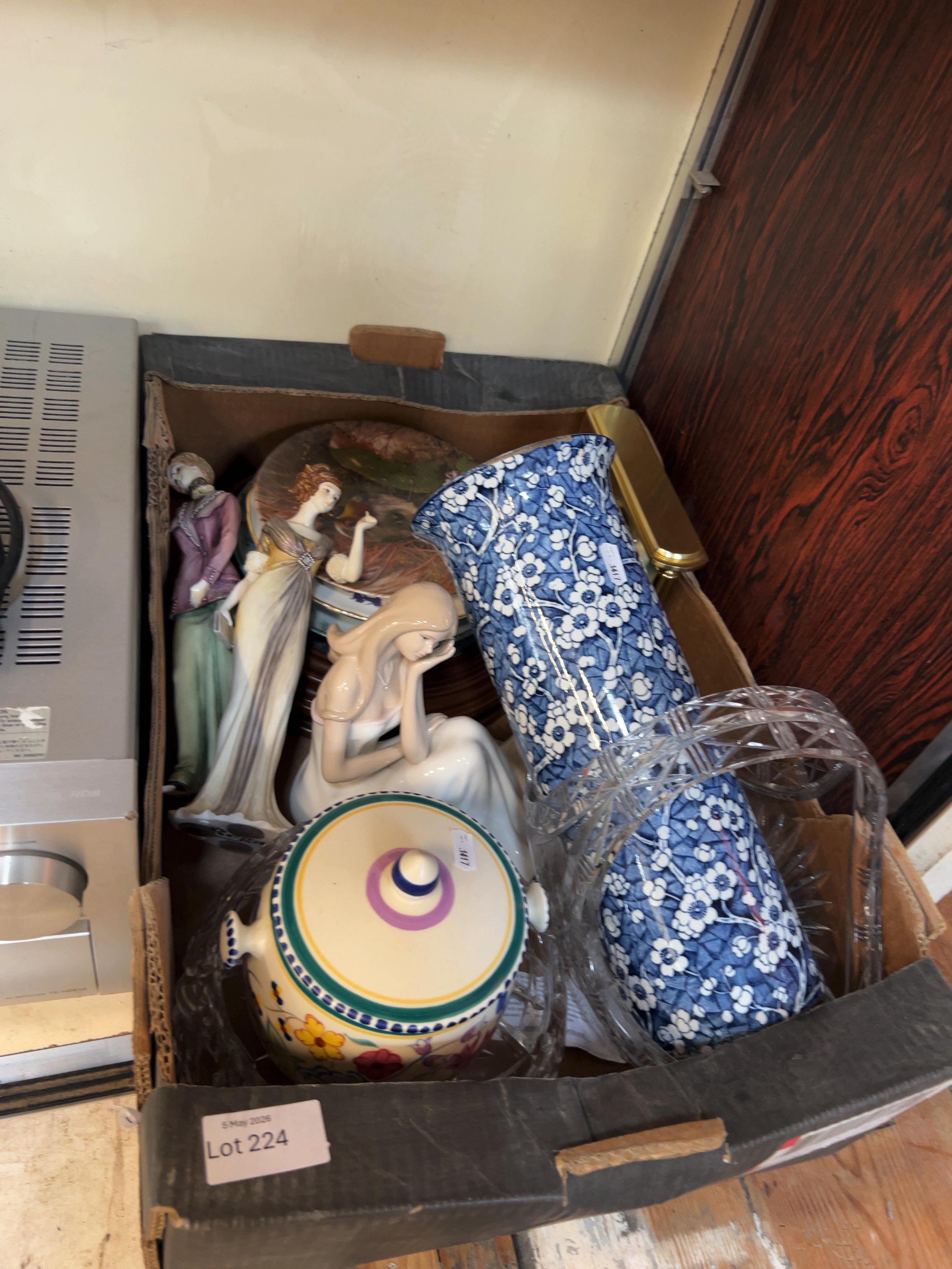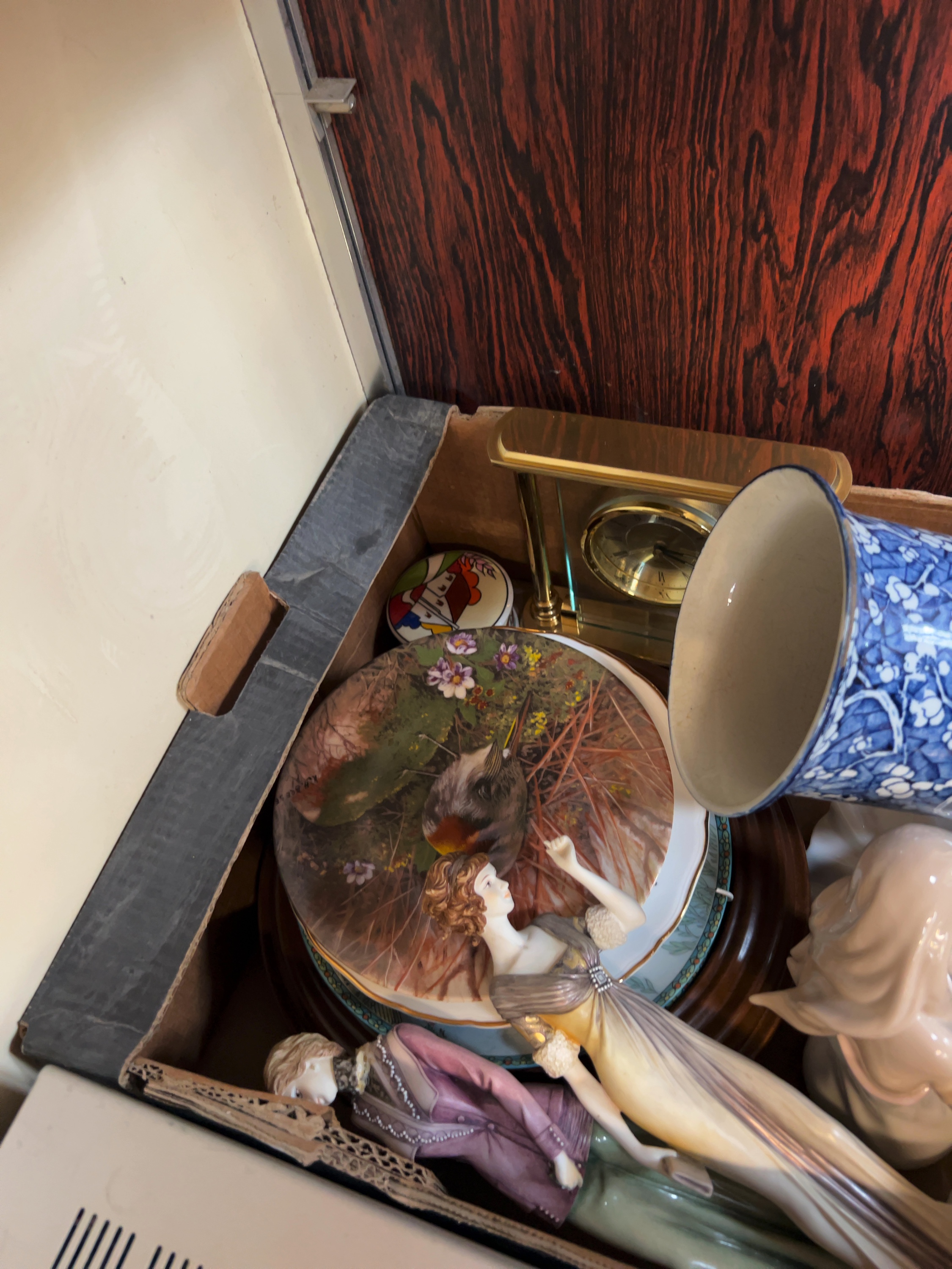 The items are offered as a mixed lot and are loosely packed within a cardboard box. General surface dust and light wear consistent with age and display are visible throughout. The porcelain figurines appear generally intact, though they have not been individually inspected for minor chips to delicate areas. The glassware and ceramic vessels show no immediate signs of significant cracks or repairs. The mechanical condition of the carriage clock is untested.