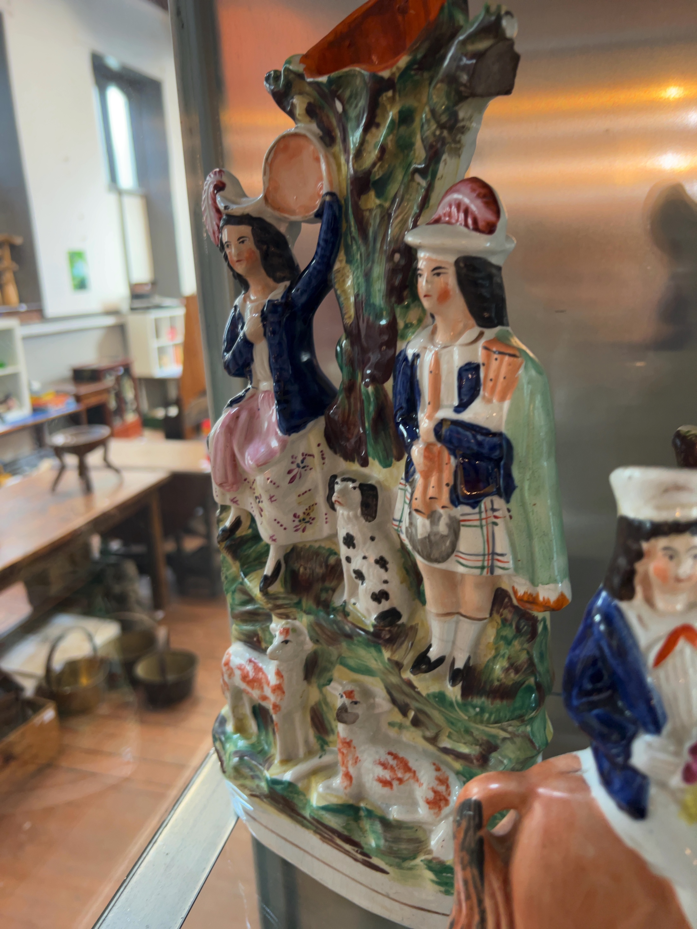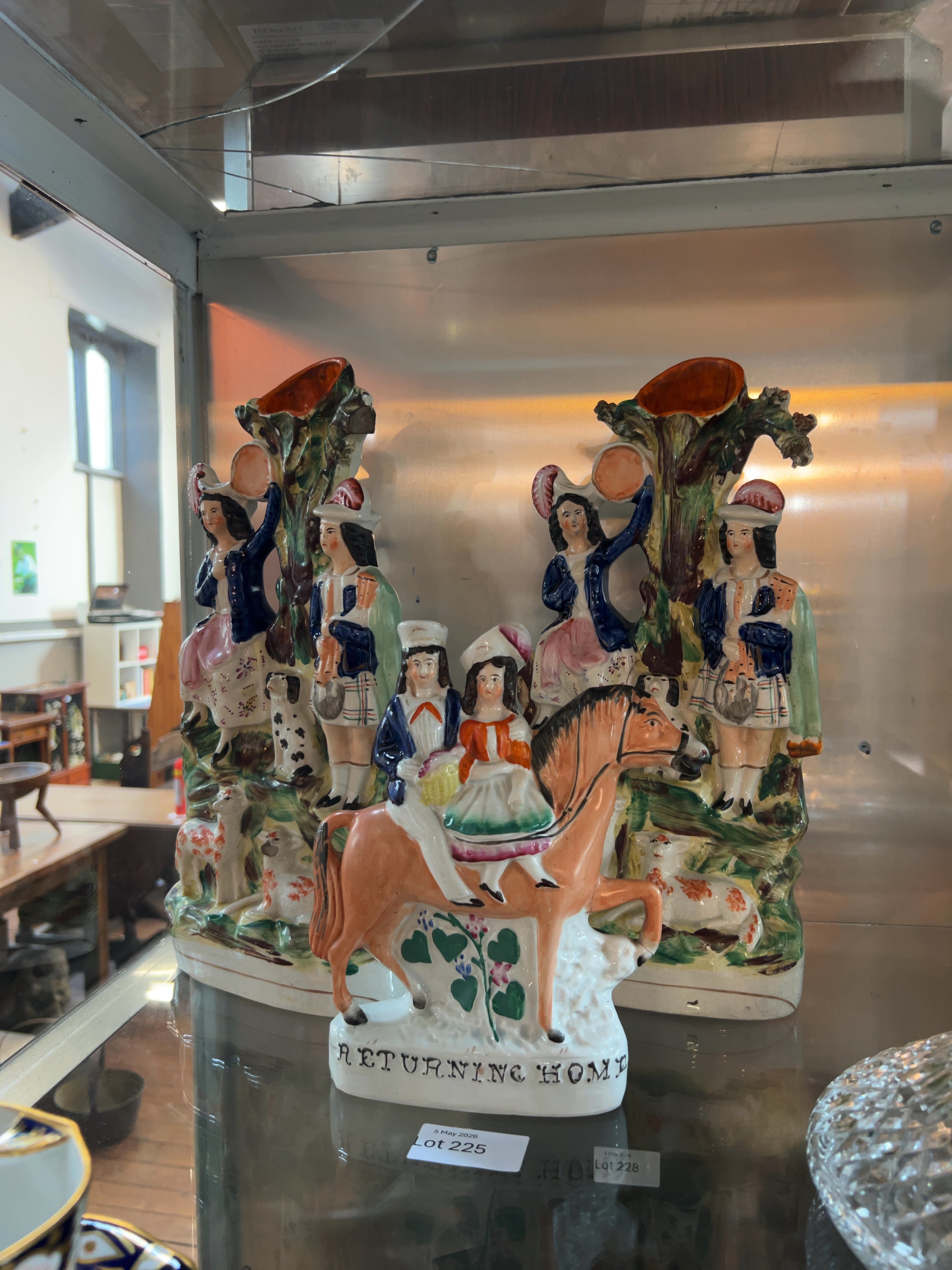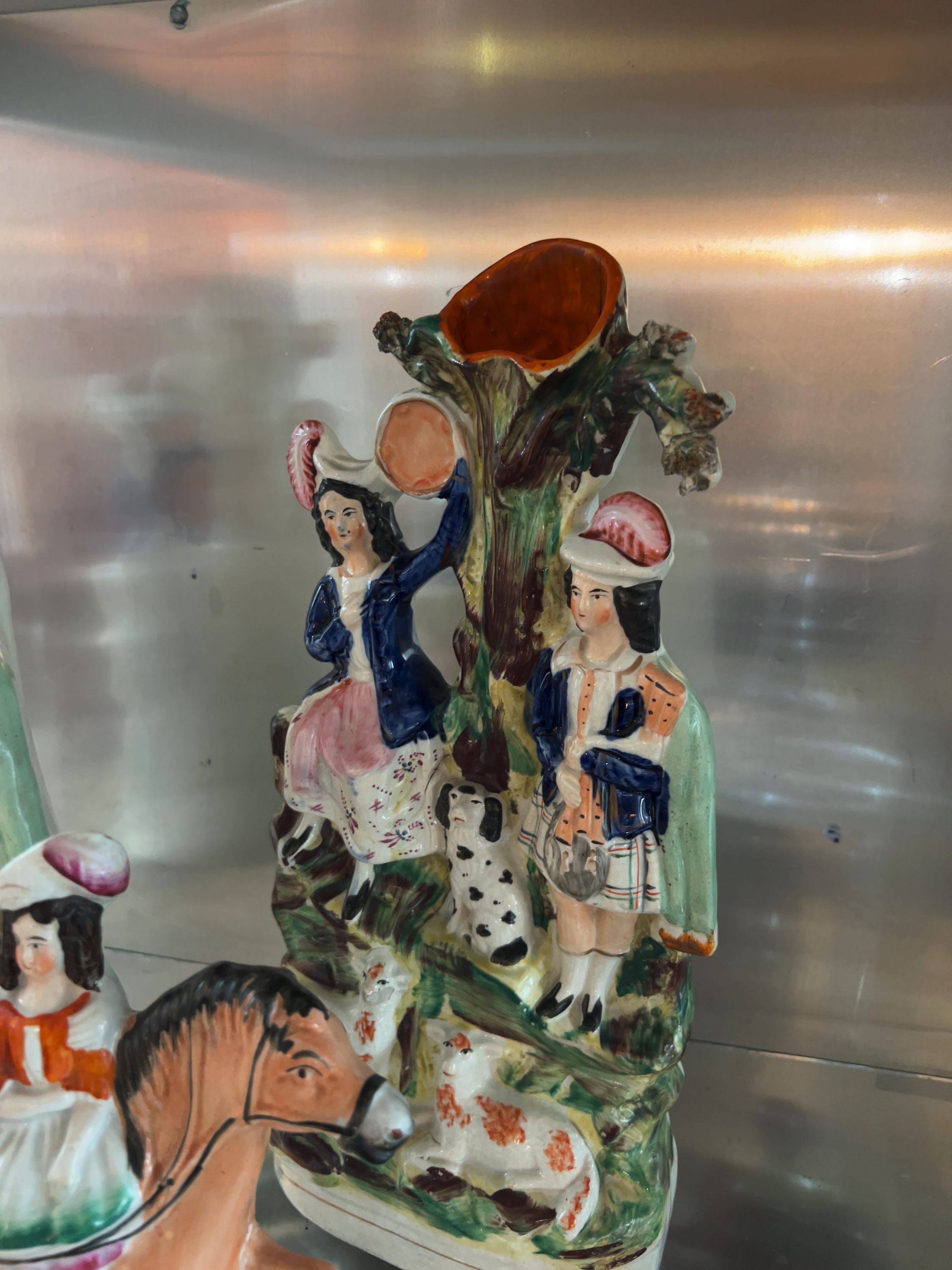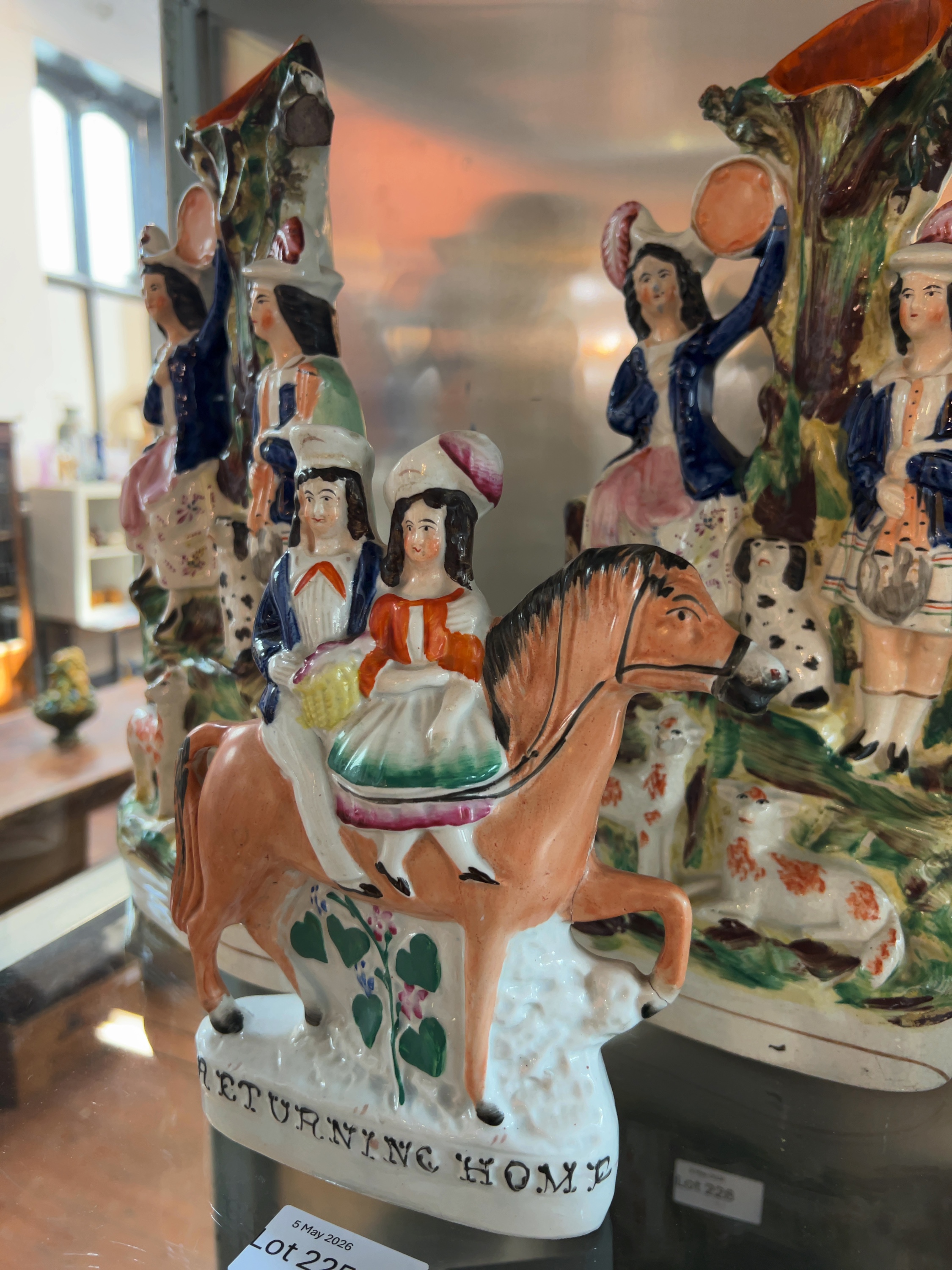 This collection comprises three 19th-century Victorian Staffordshire earthenware flat-back figures, designed for mantelpiece display. Includes a figural group titled Returning Home, the remaining two items form a matching pair of spill vases.All pieces are constructed from lead-glazed earthenware with hand-painted polychrome overglaze colours.