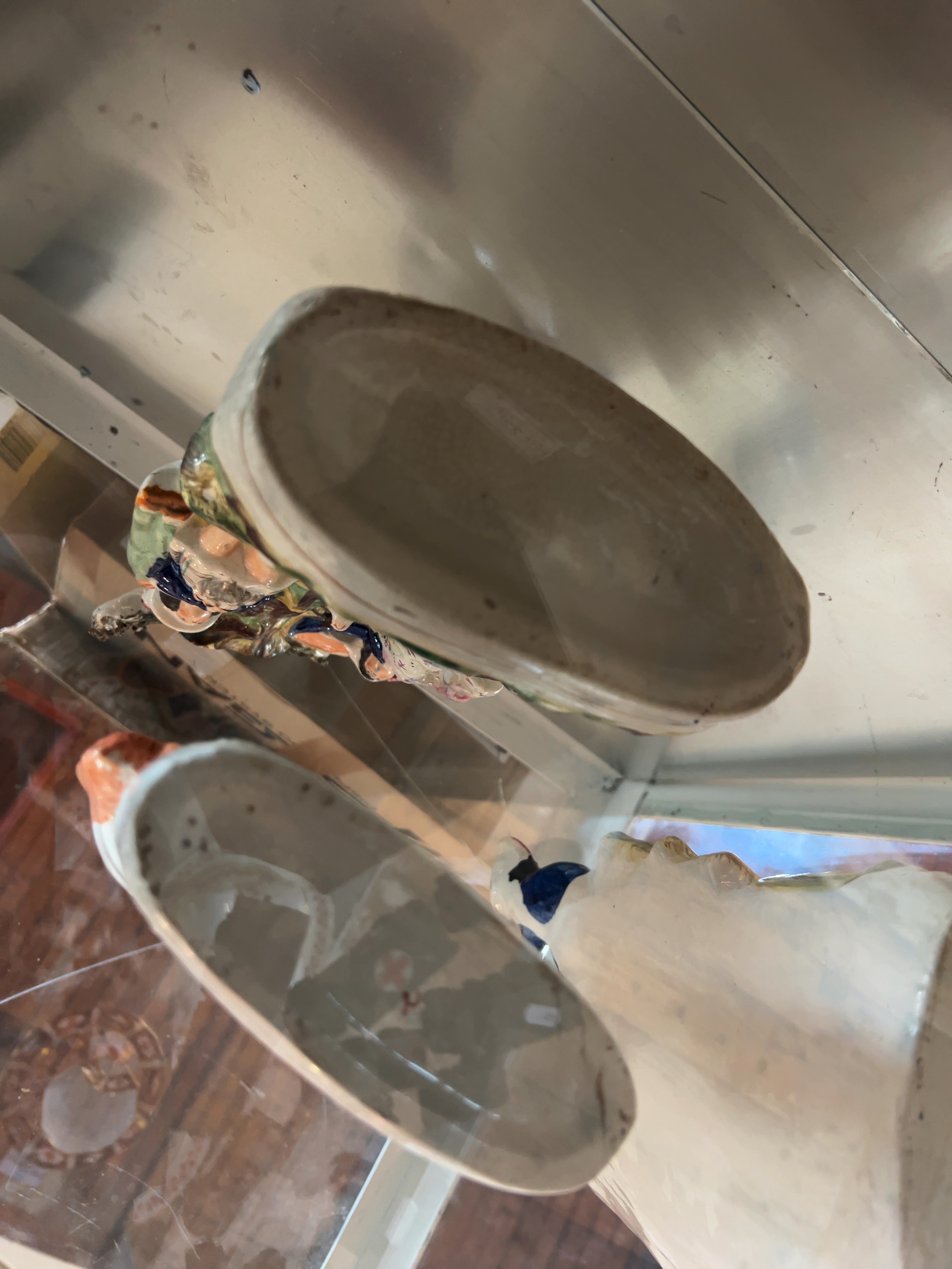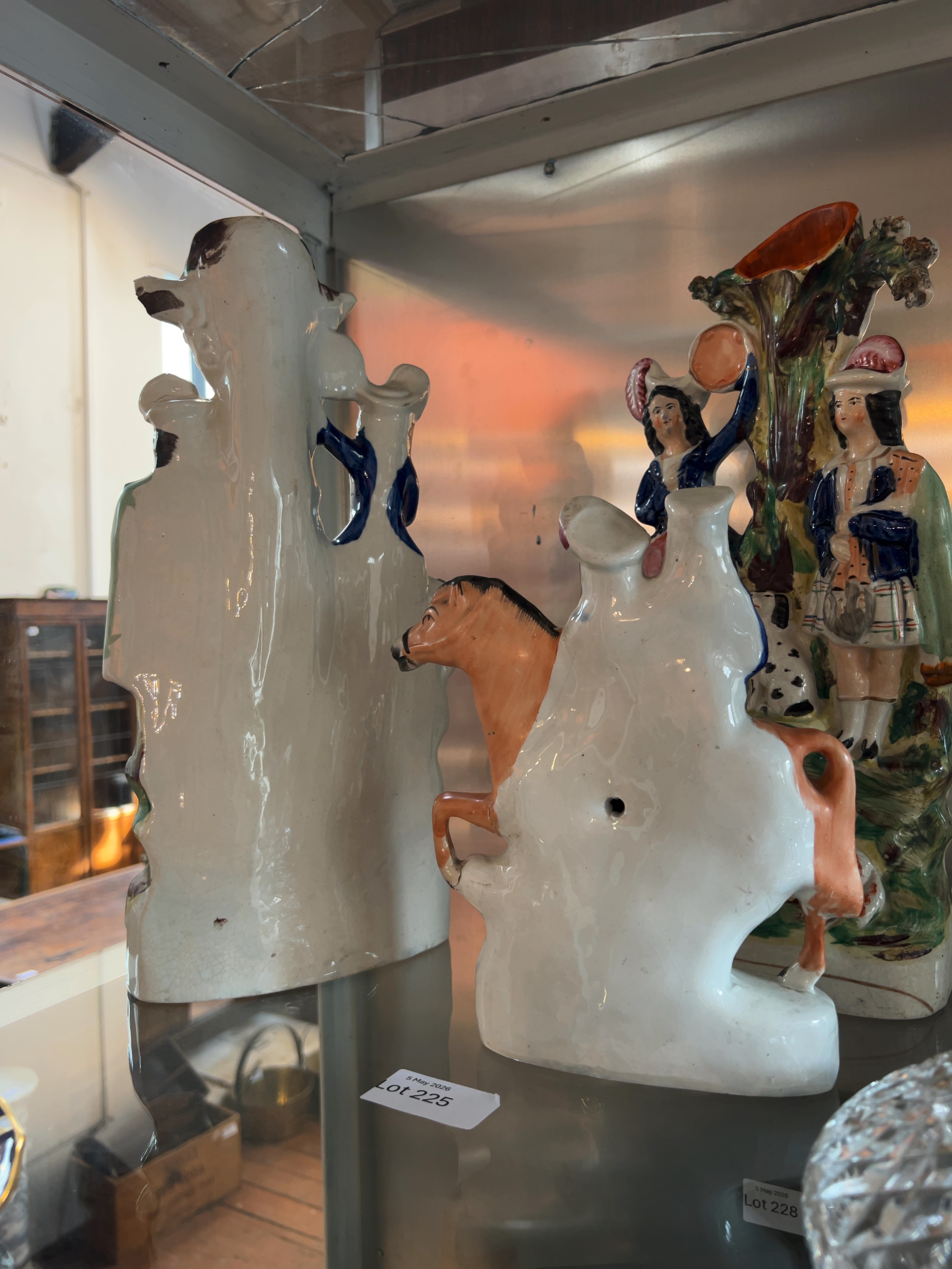 All three figures exhibit overall glaze crazing consistent with age. The Returning Home figurine shows a small visible firing crack or minor chip to the horse\'s front right leg where it joins the base. The spill vases show minor firing imperfections typical of mid-to-late 19th-century production, with well-preserved orange-lined interiors to the spill holders.