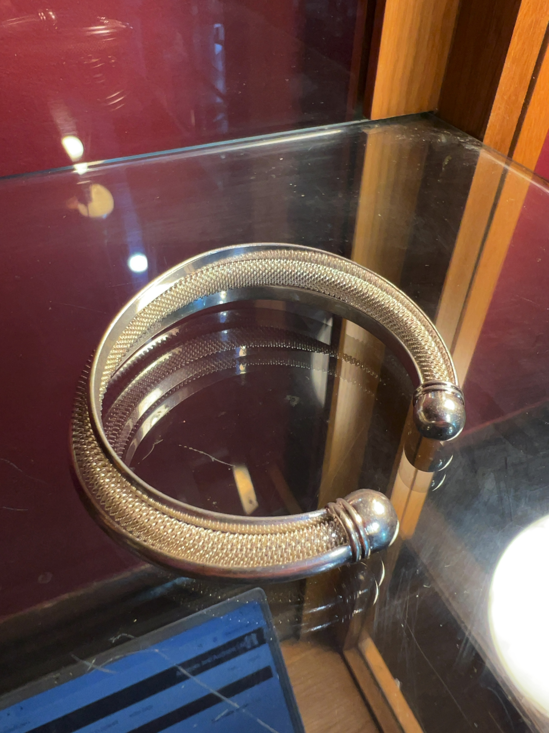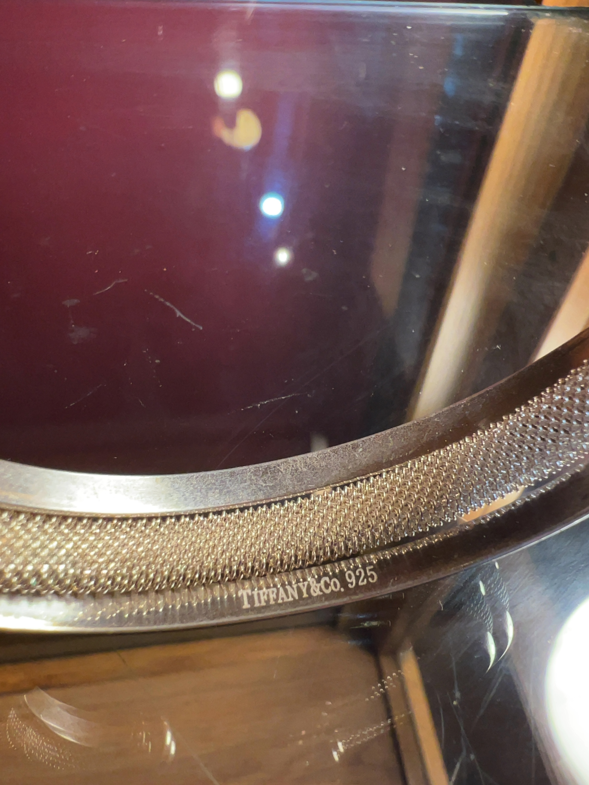 The item is in good used condition. There are visible light surface scratches and minor scuff marks on the polished rails and ball terminals, consistent with regular wear. Minimal tarnishing is present in the recessed mesh areas.