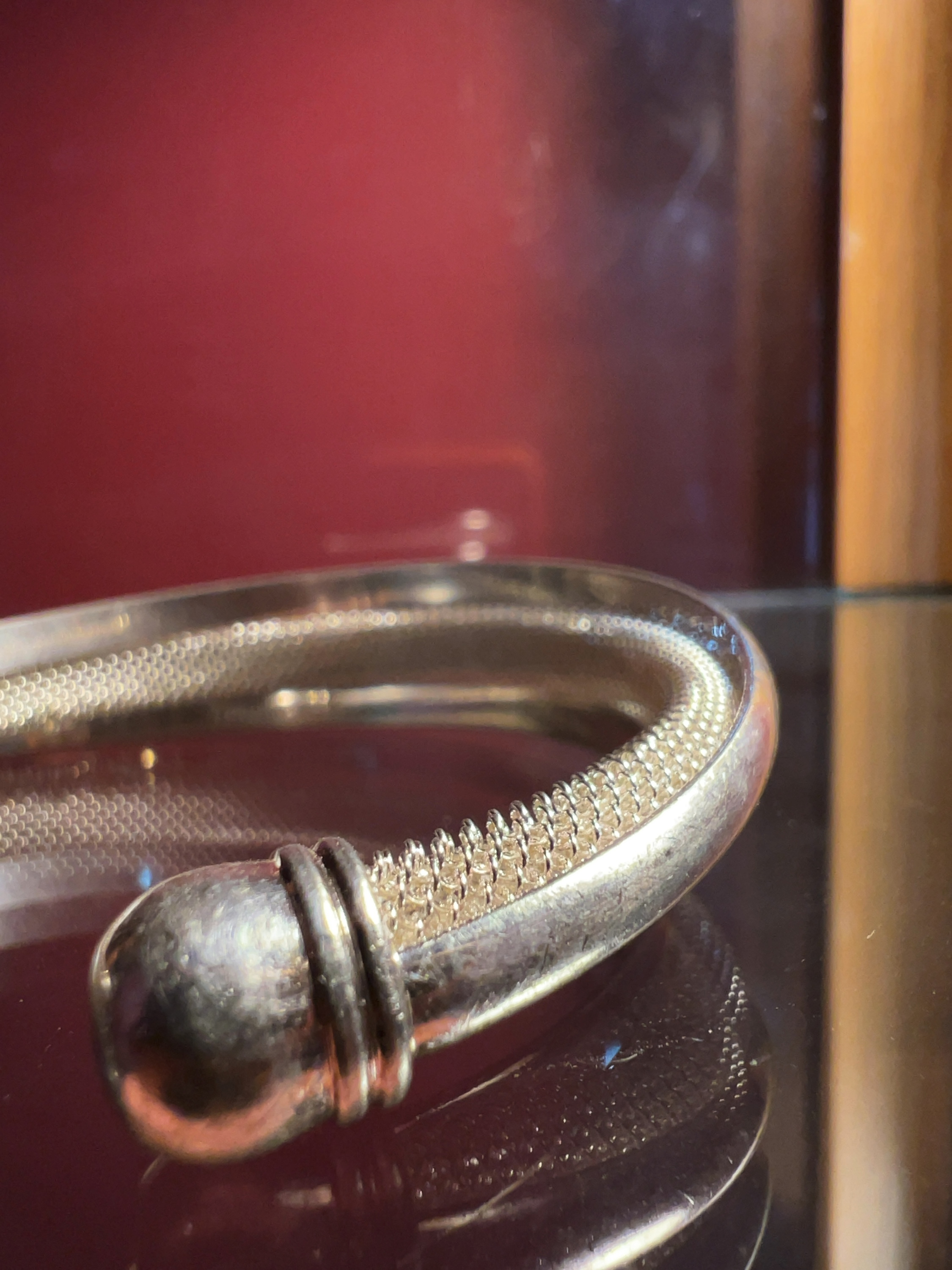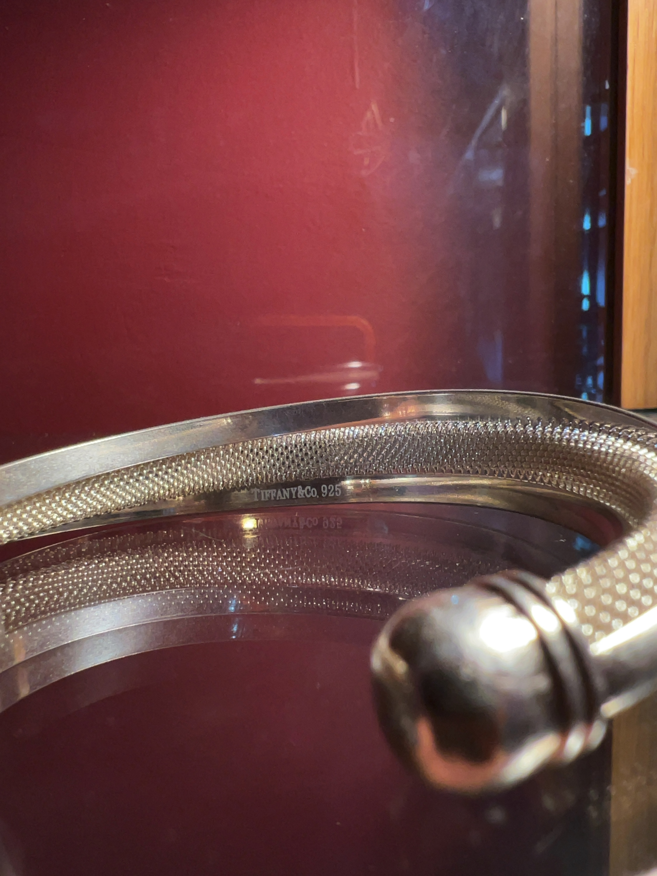 A sterling silver cuff bracelet by Tiffany & Co. from the Somerset collection. The bracelet is designed as an open-ended torque featuring a central recessed band of woven mesh-style silver, bordered by two smooth, highly polished outer rails. The piece has two polished spherical ball ends, each joined to the main body by a decorative double-ribbed collar. The interior rim is stamped TIFFANY&Co. 925.