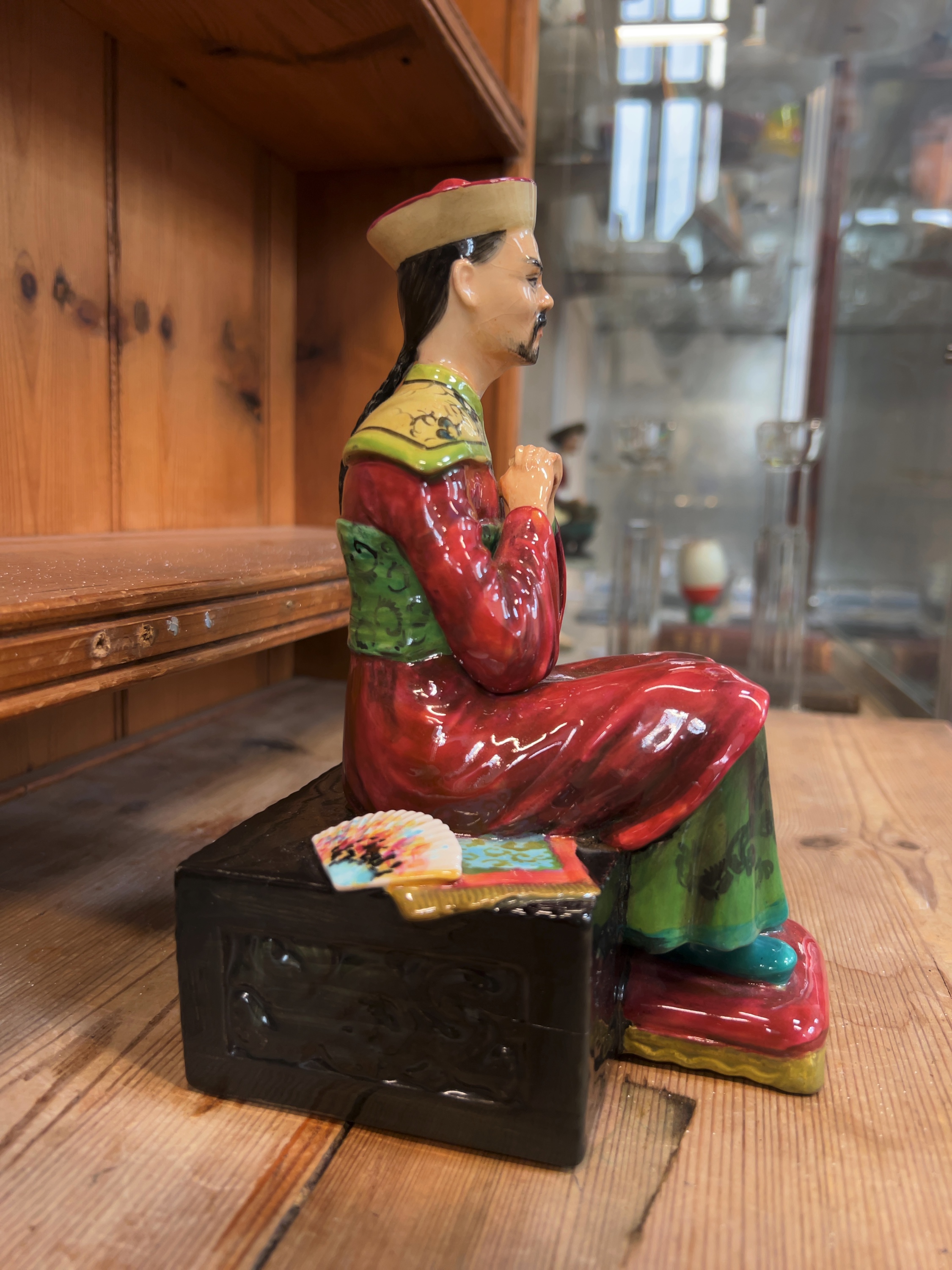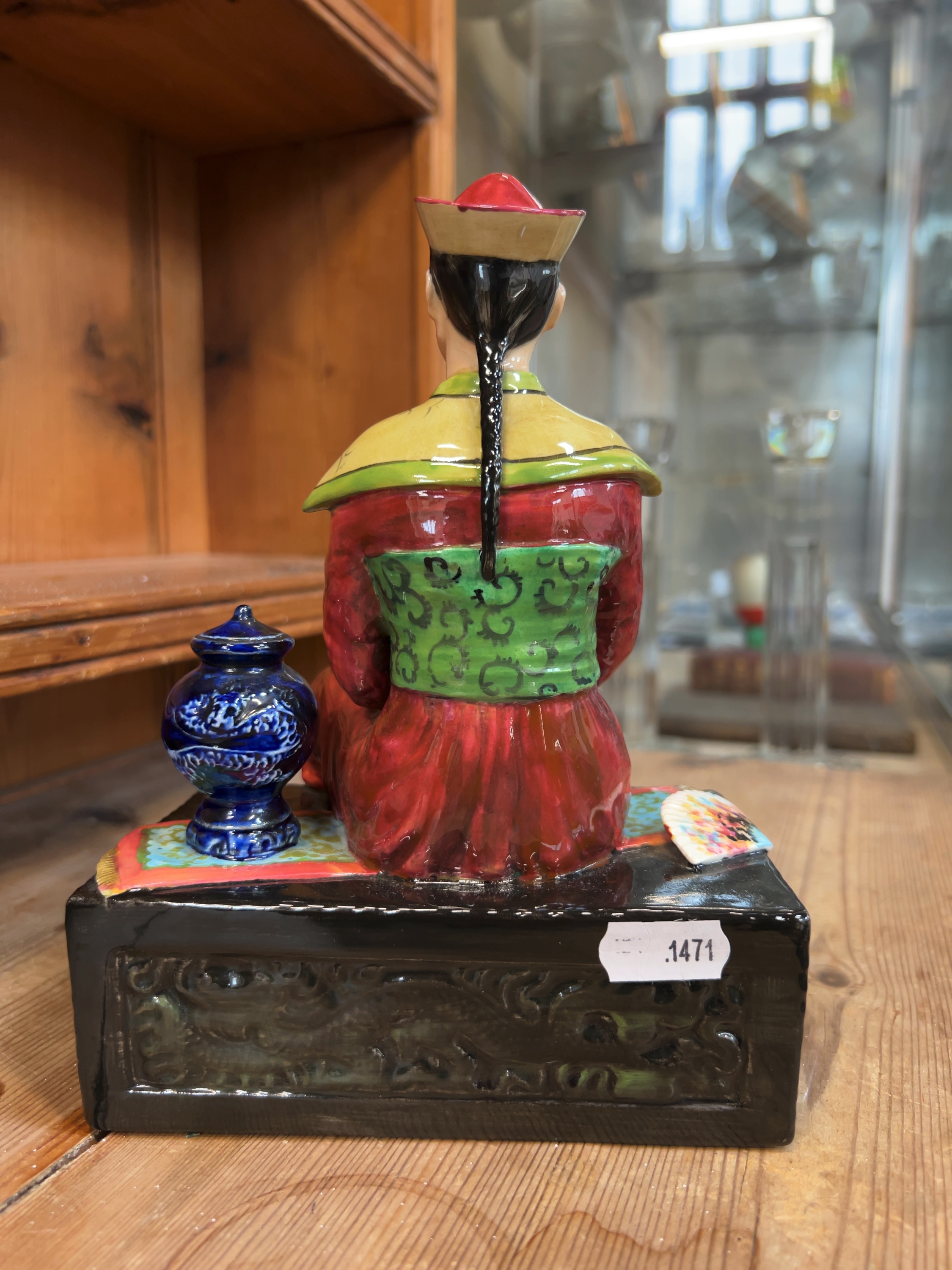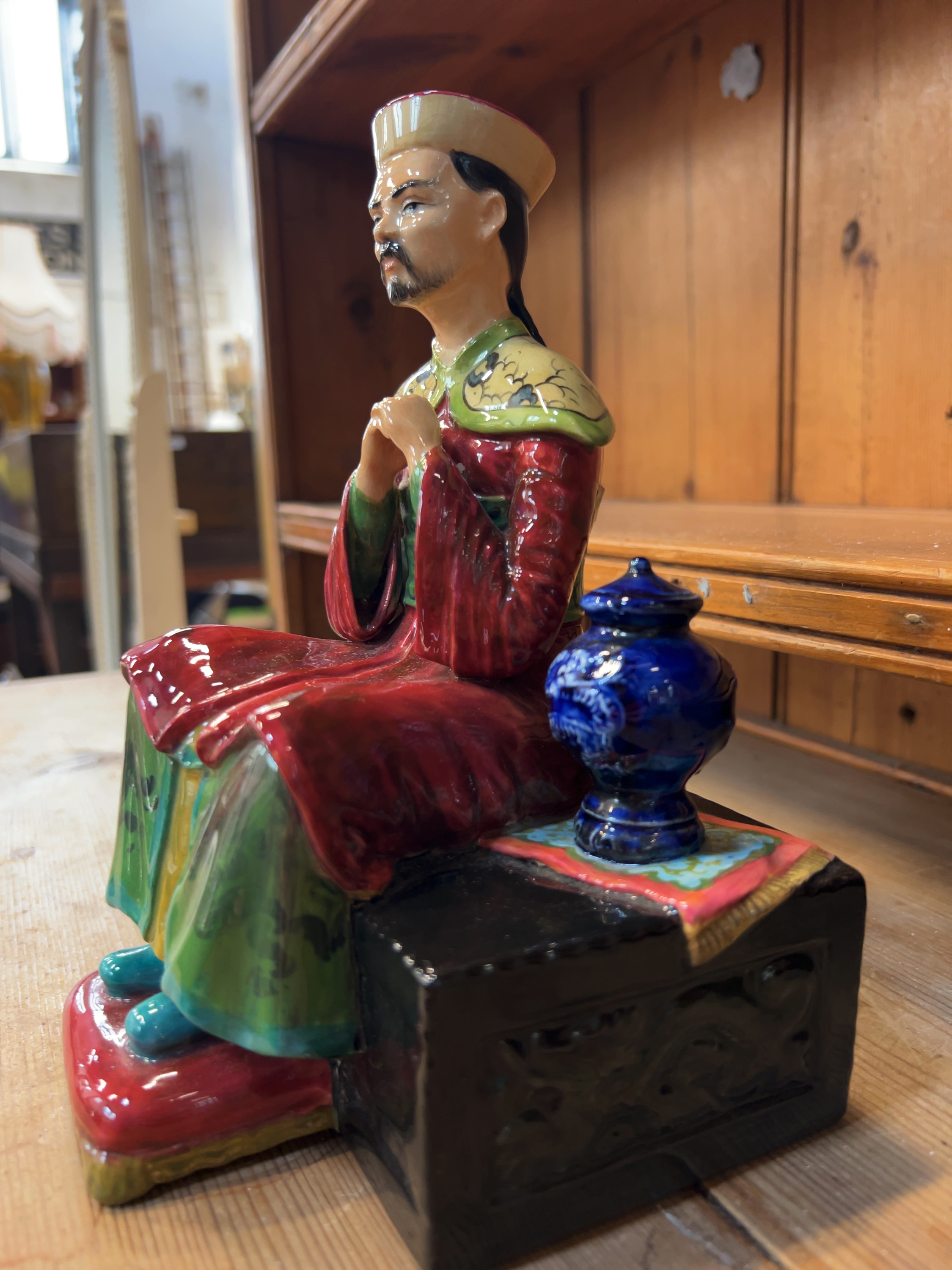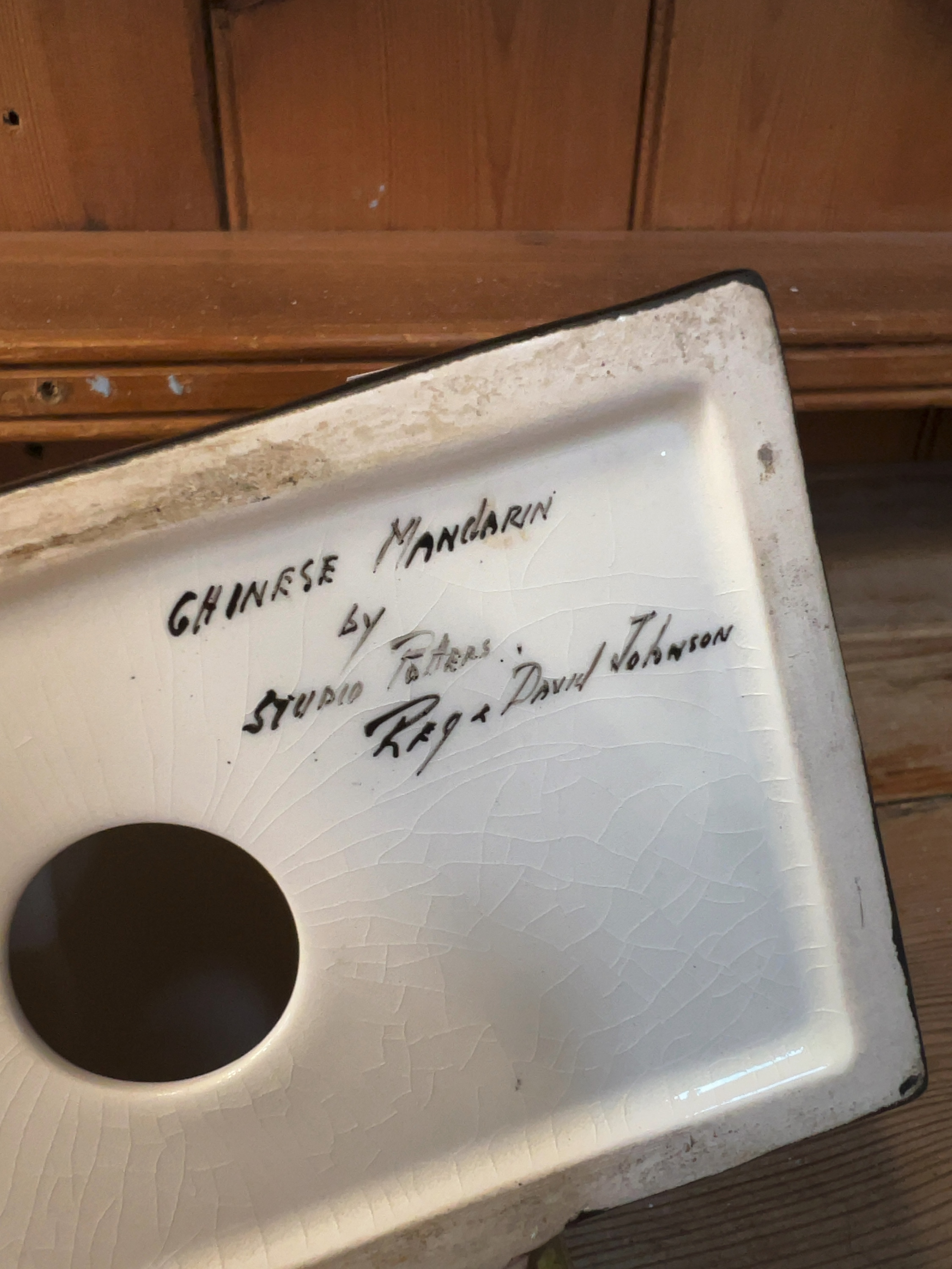 A hand-painted ceramic figurine titled Chinese Mandarin by British studio potters Reginald and David Johnson. The underside of the base features hand-written inscriptions in black ink: CHINESE MANDARIN by STUDIO Potters Reg & David Johnson.