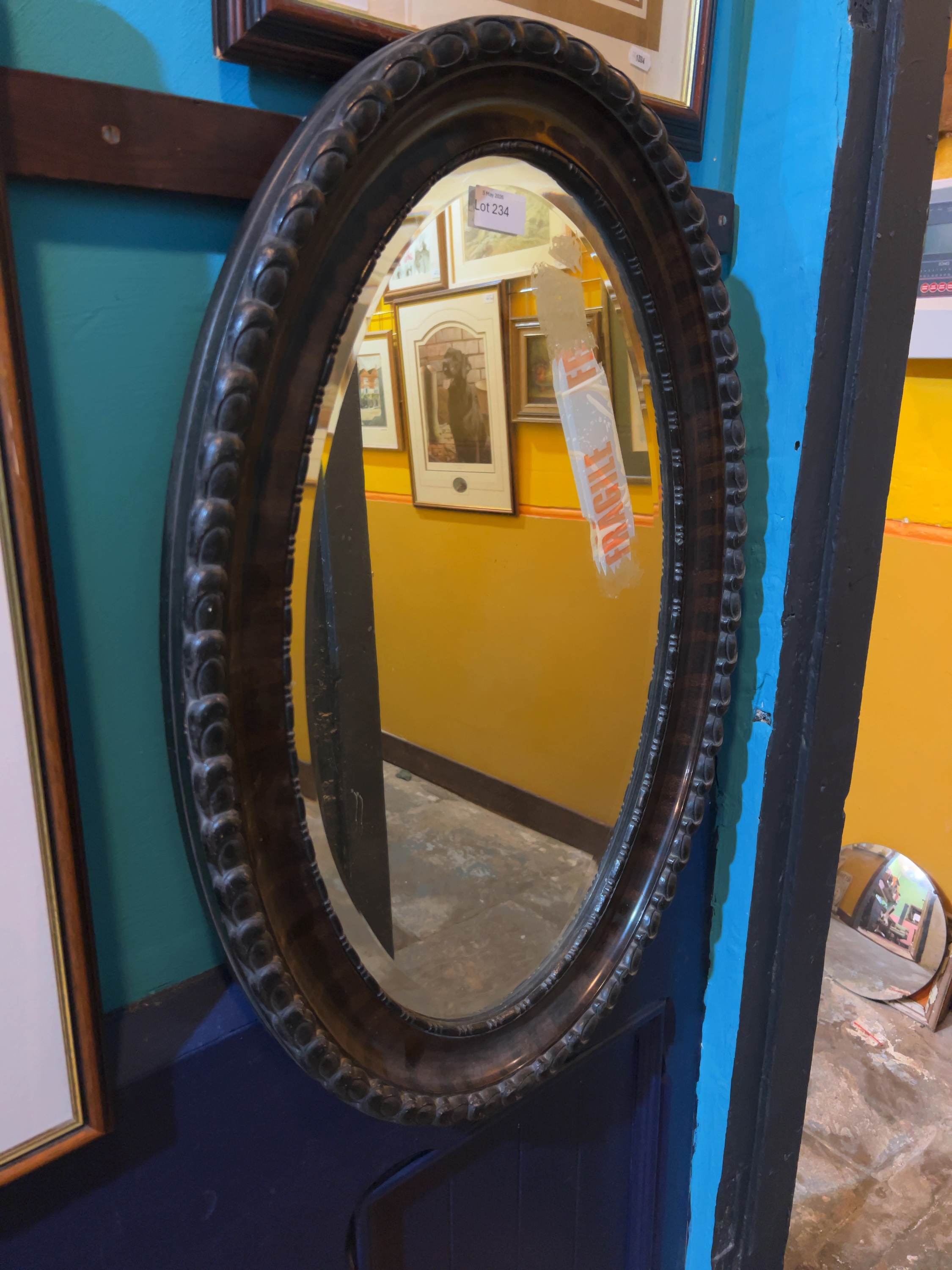 An Edwardian-style oval wall mirror featuring a substantial dark-stained mahogany frame.
